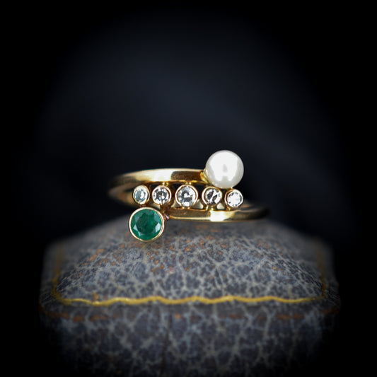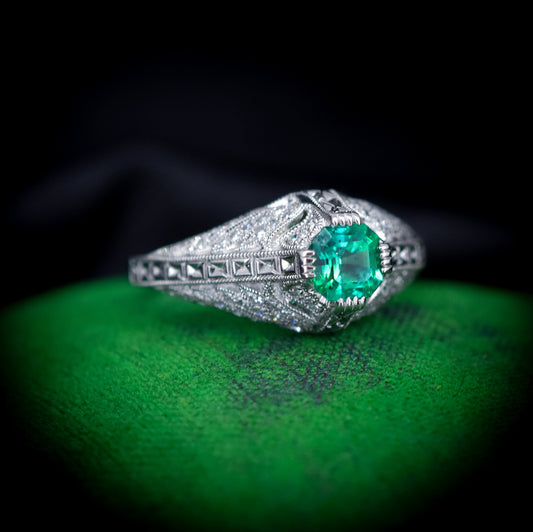 Our curated collection of Art Deco Emerald Rings combines vintage glamour with geometric designs and quality gemstones. The Art Deco movement, despite starting over 100 years ago, remains very modern in its designs and styles. Clean lines, geometric shapes and bold styles all remain excellent designs for the rings of today. Here we have a collection of genuine Antique Art Deco pieces and modern Art Deco style options for those that prefer brand-new luxury.