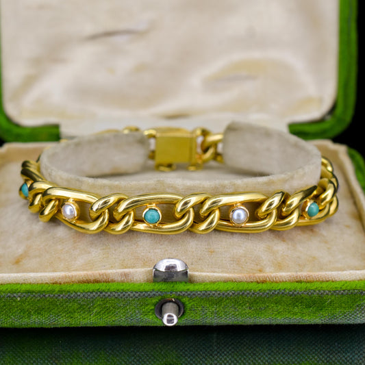 Antique 15ct Yellow Gold Pearl and Turquoise Curb Bracelet | 7.5"
