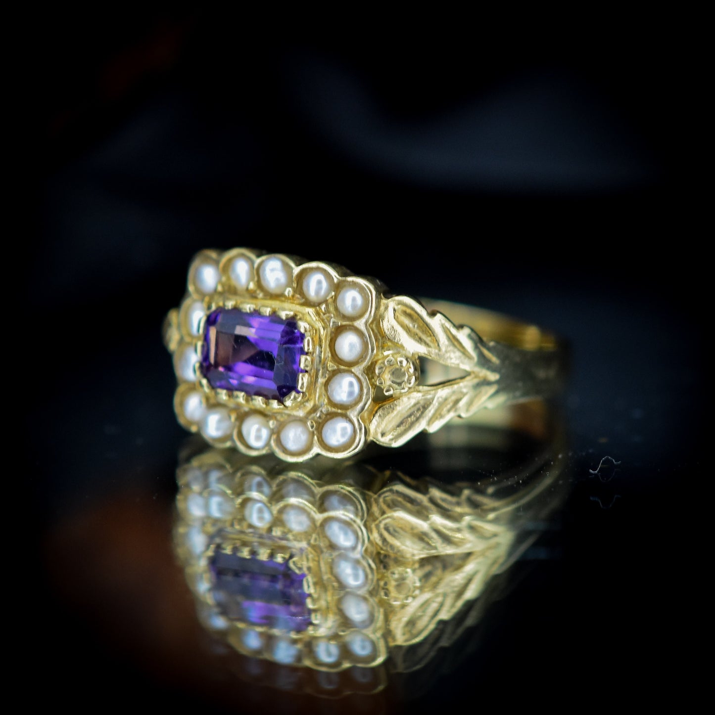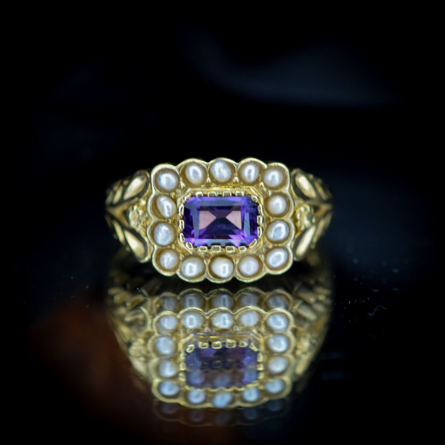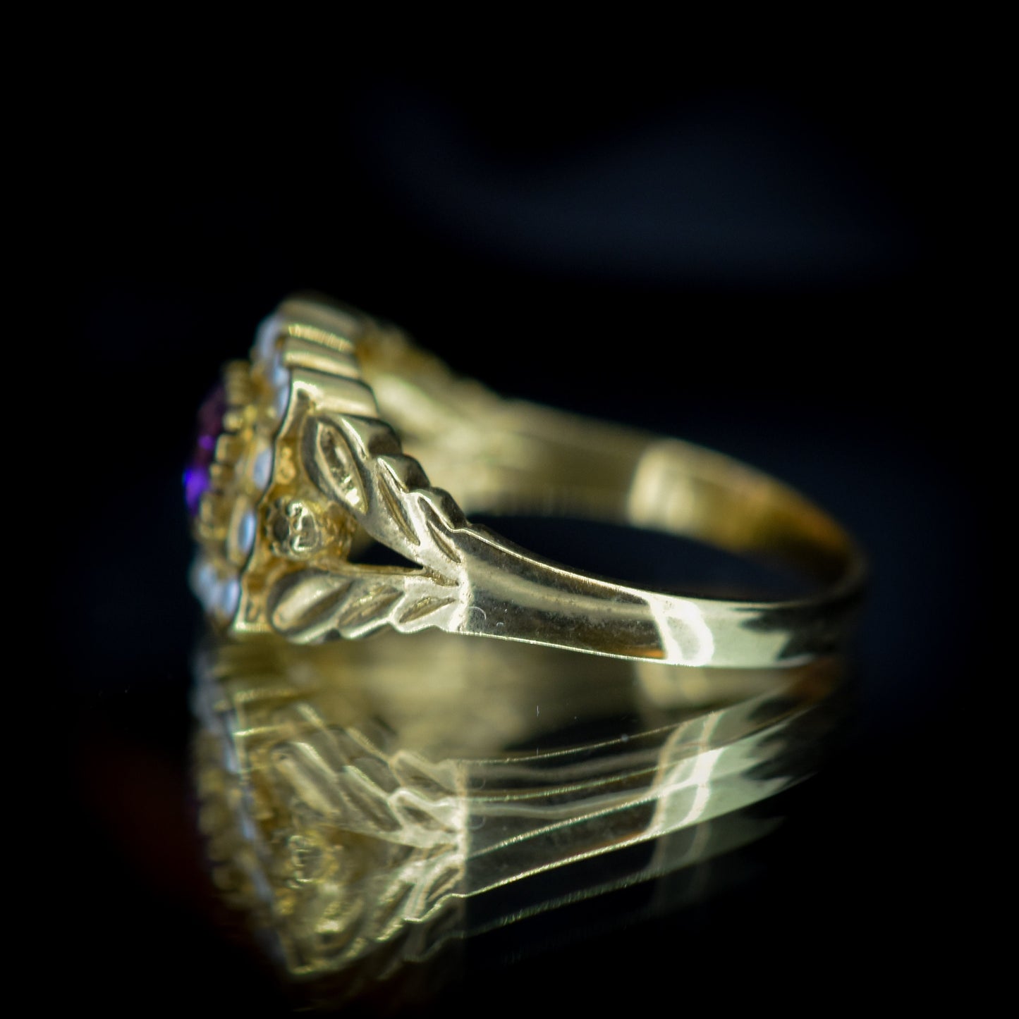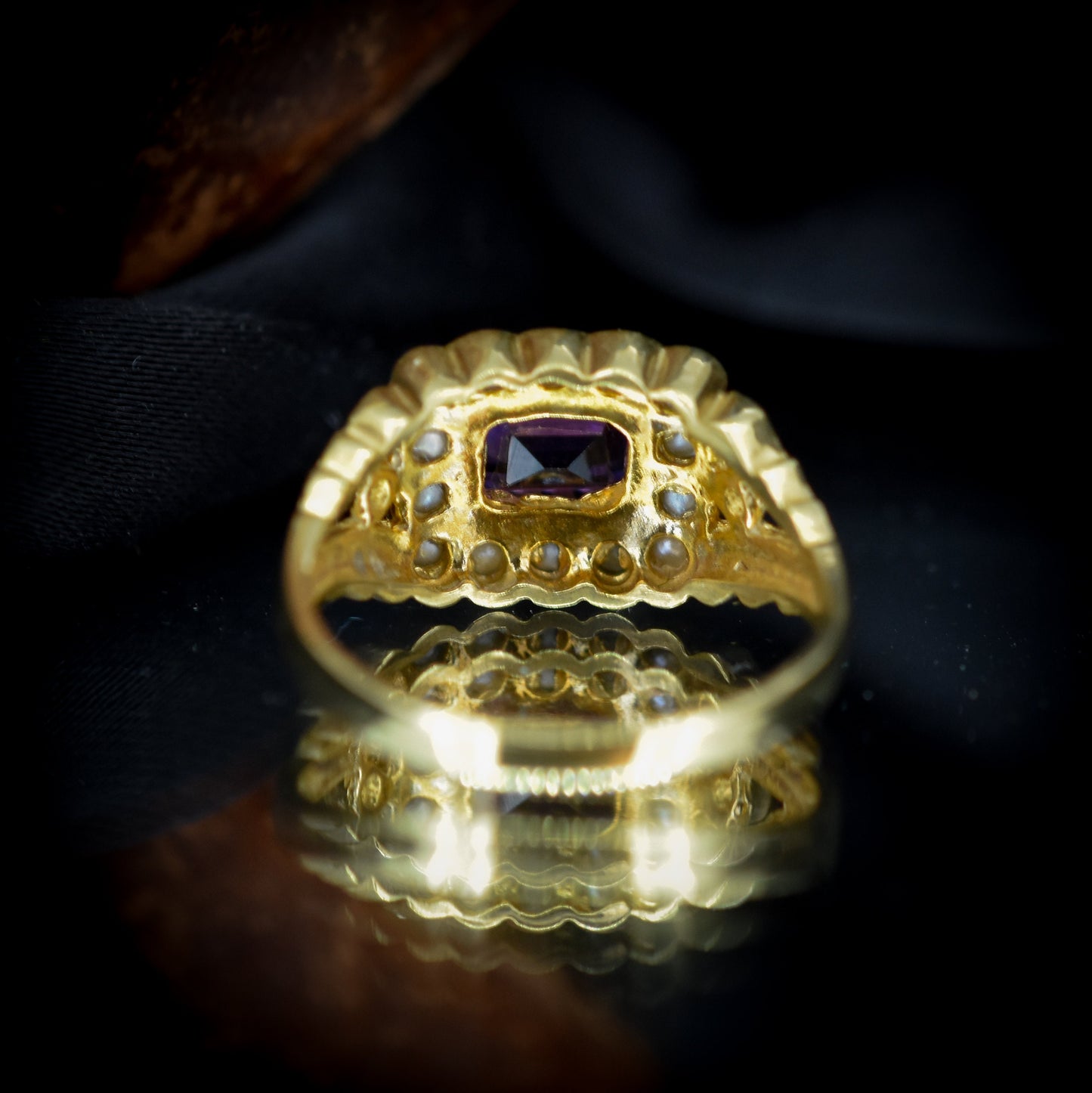 Anillo dorado de oro amarillo de 18 quilates con halo de perlas y amatistas | Estilo georgiano antiguo