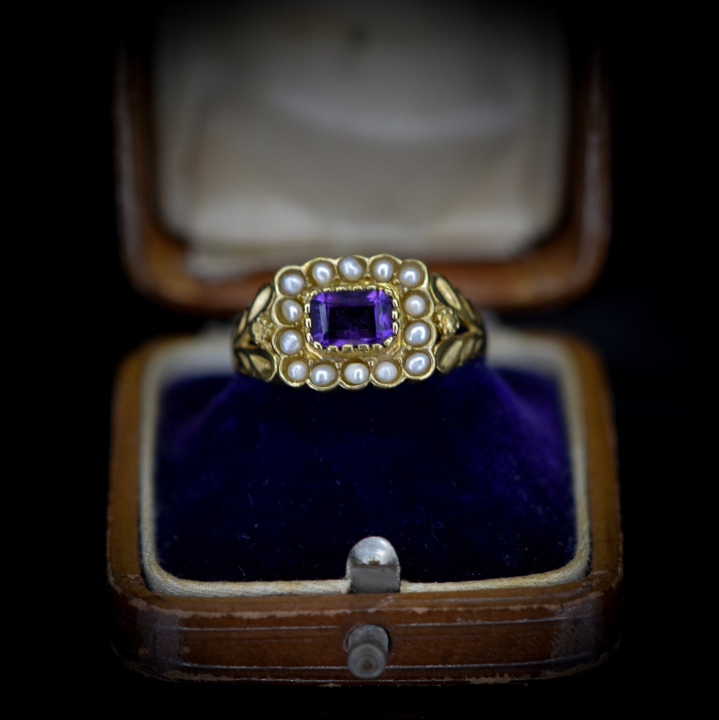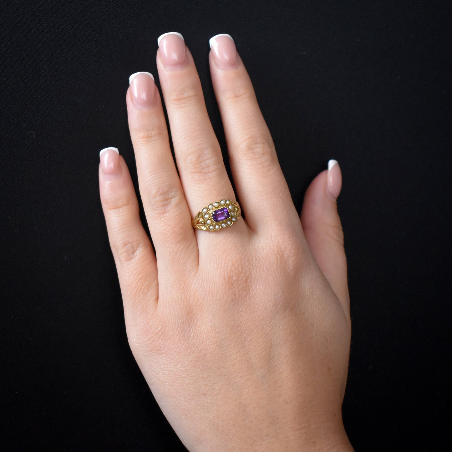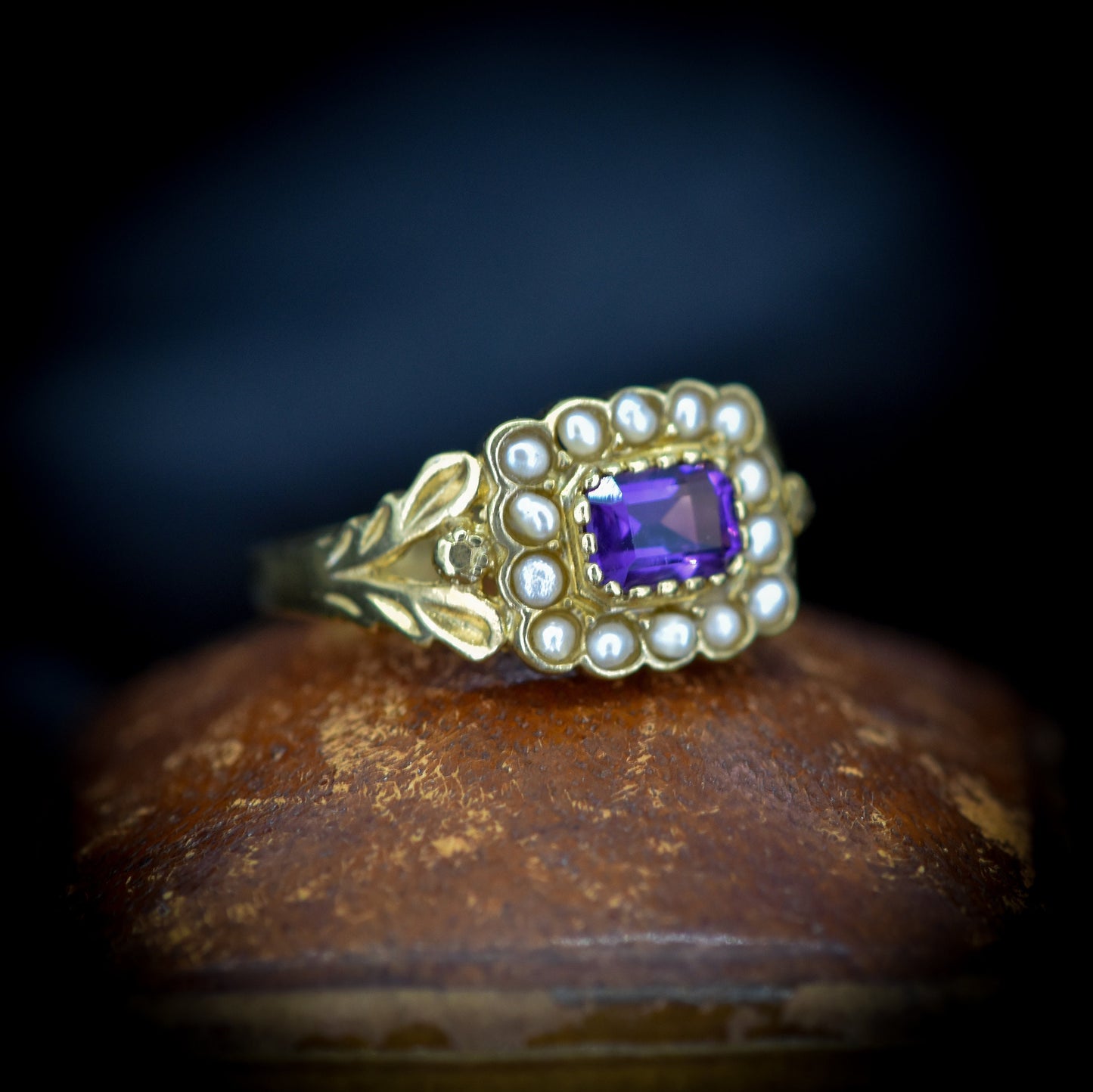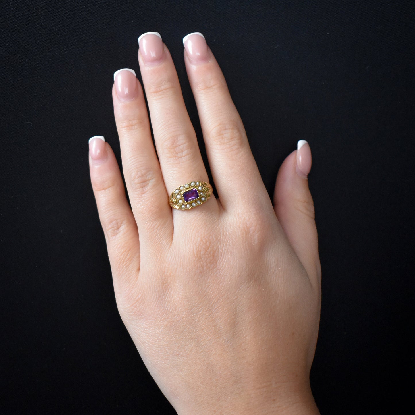Anillo dorado de oro amarillo de 18 quilates con halo de perlas y amatistas | Estilo georgiano antiguo