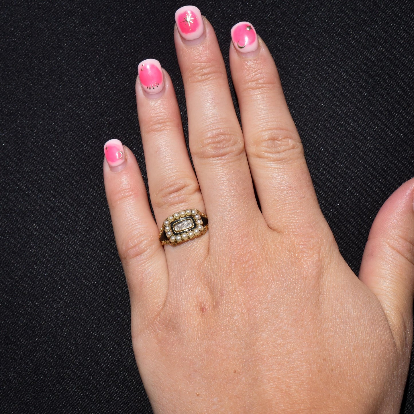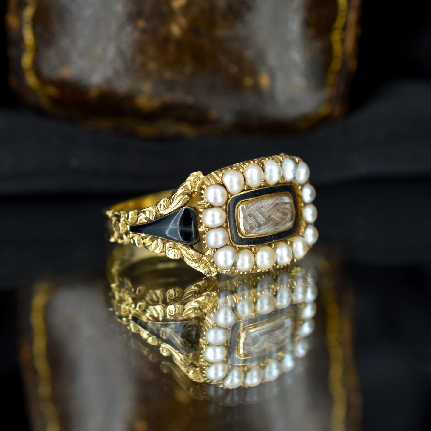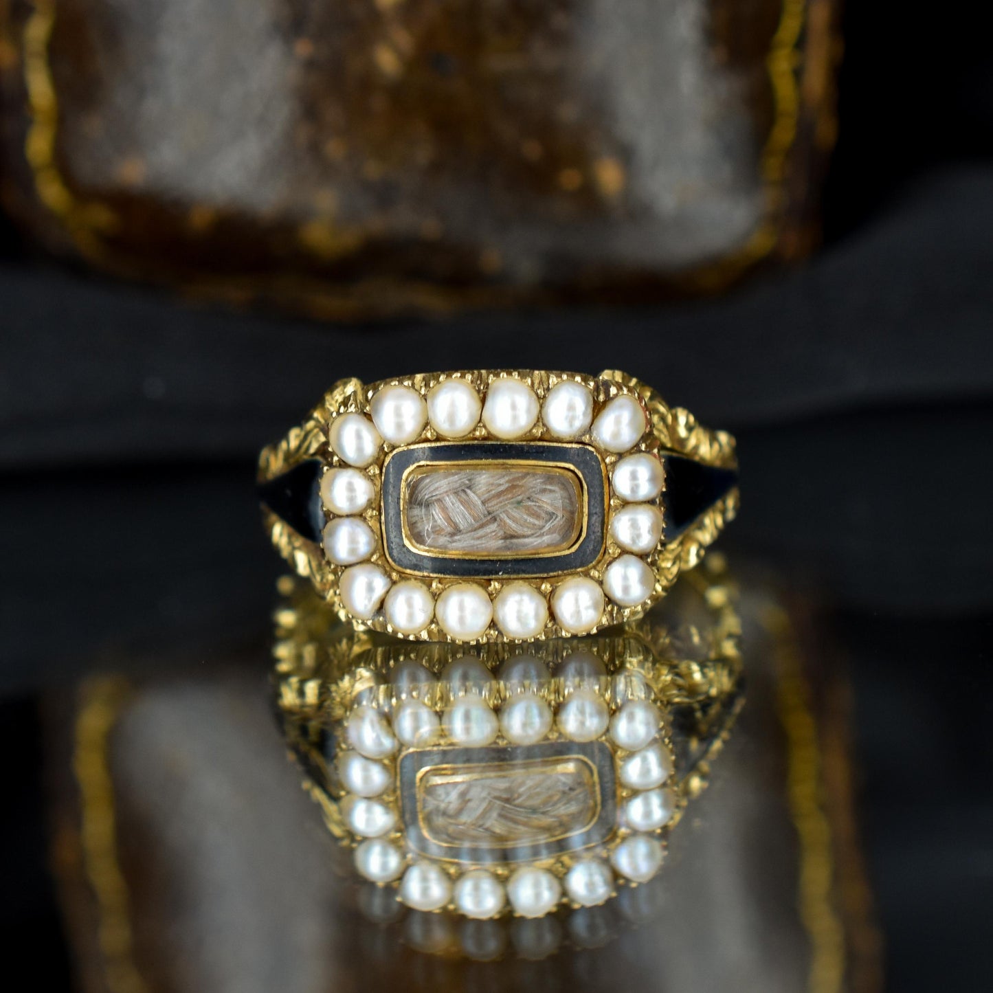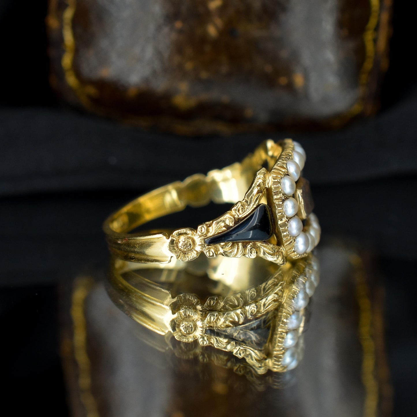 This breathtaking Antique mourning ring features a Pearl halo with a hair locket centre, beautifully textured shoulders and black enamelling, modelled in 18ct Yellow Gold.