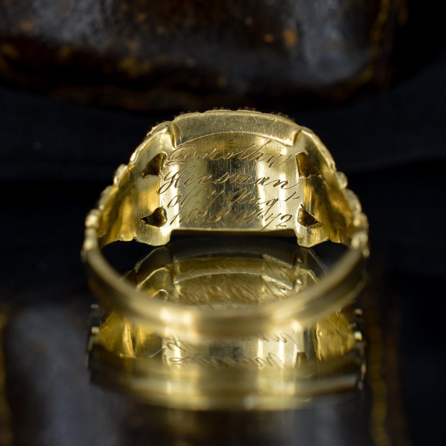 The back of the ring is fully engraved inside, reading "Dorothy Hensman, Ob: 6 Aug 1828 ae. 72."