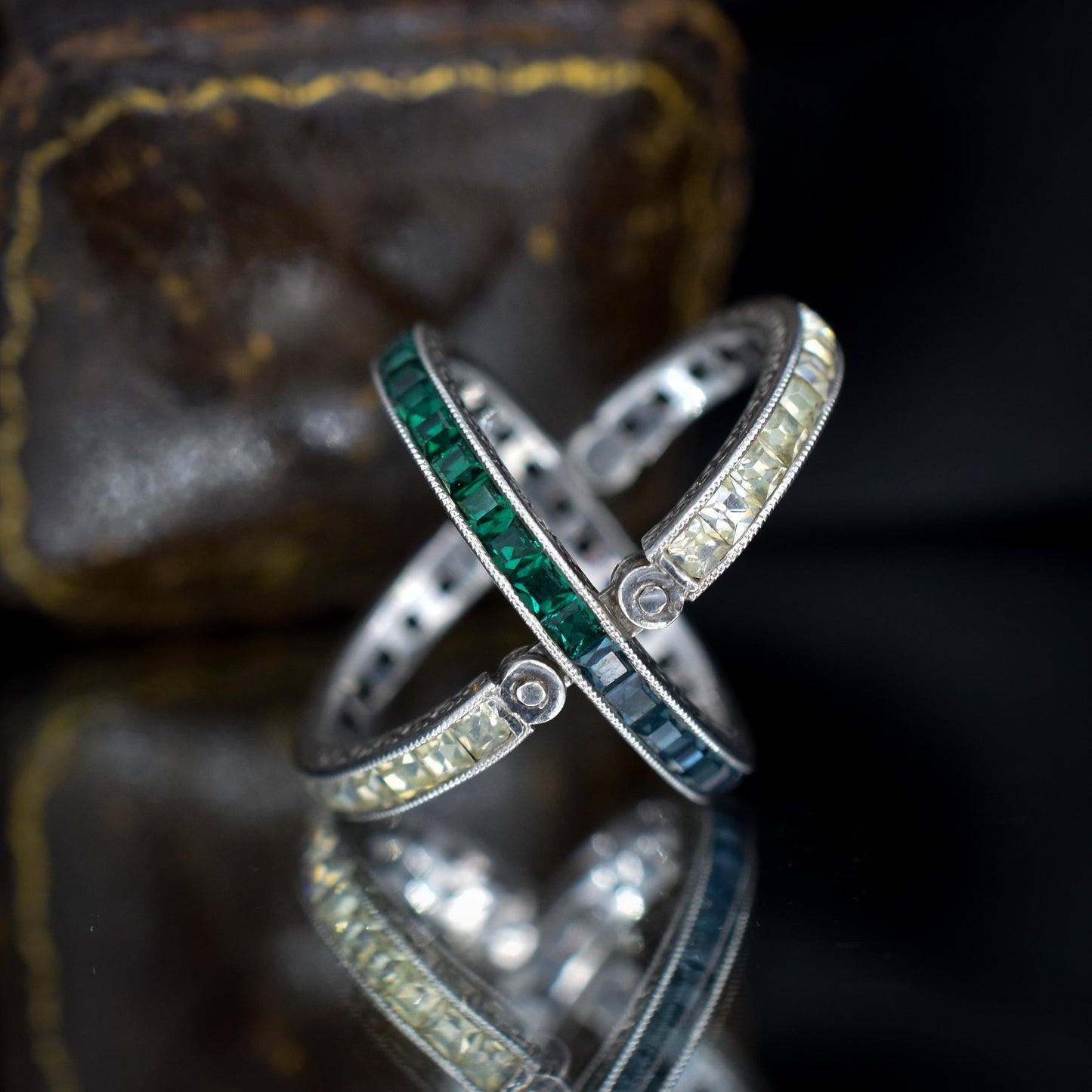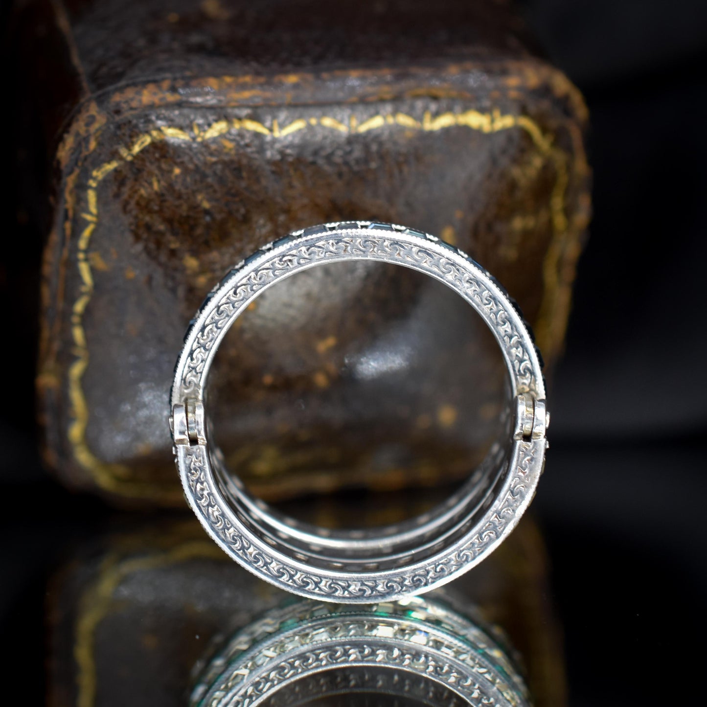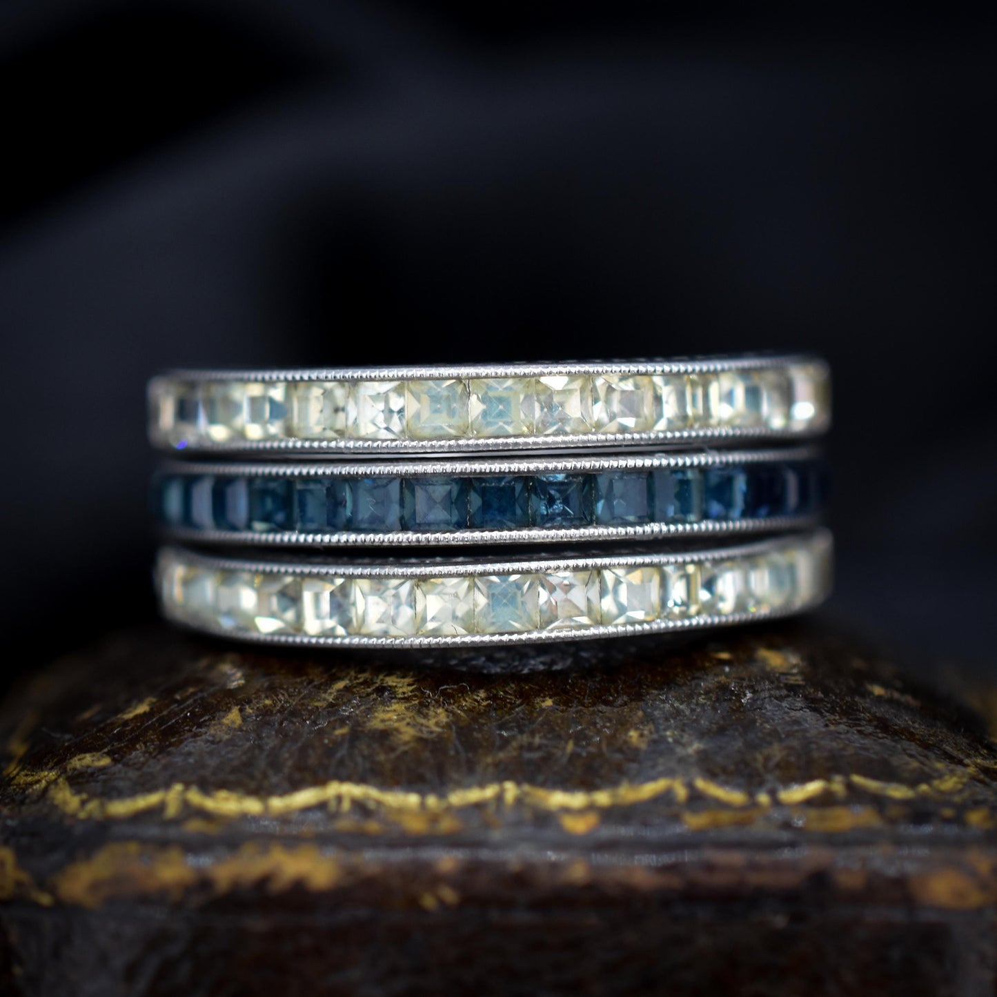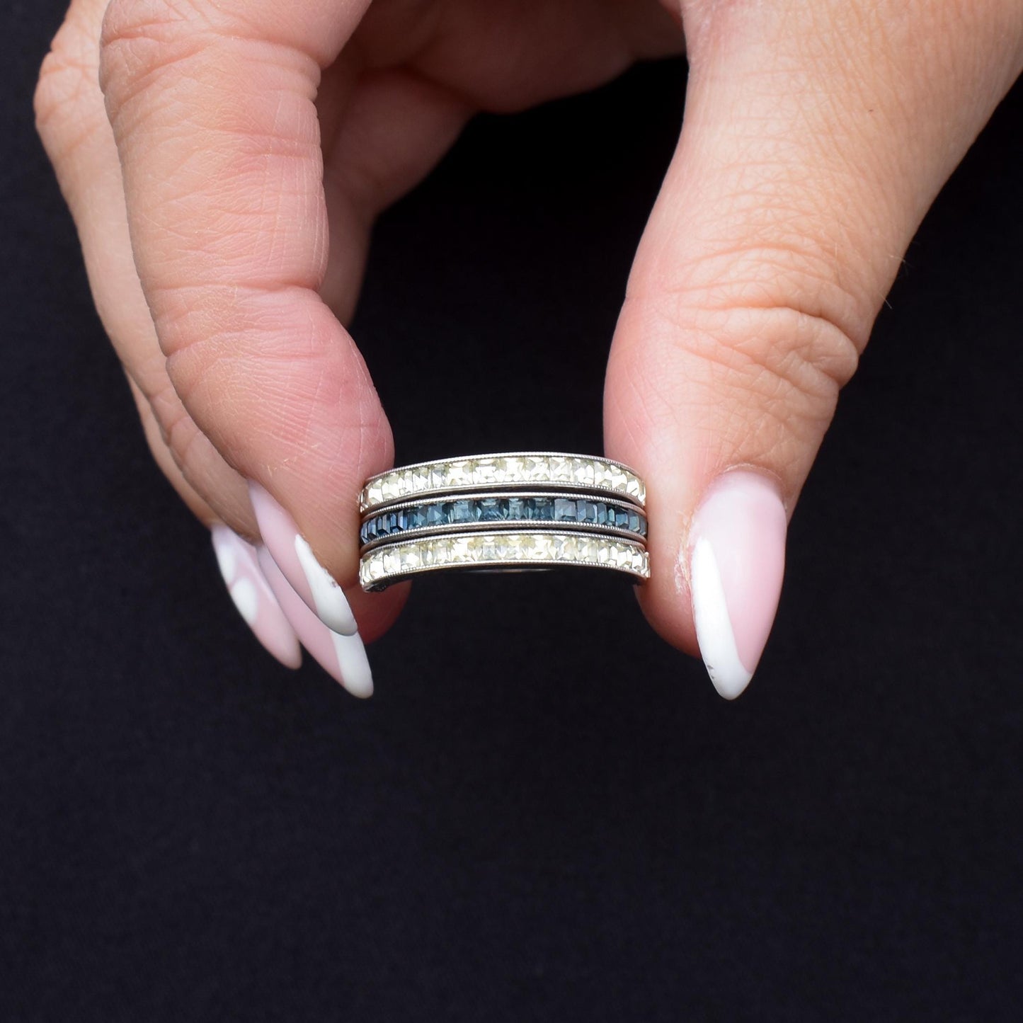 The stones are set in mil-grain settings, which adds a wonderful feature typical of the Deco period. Complete with fine engraving, this unique band will surely be a conversation starter!