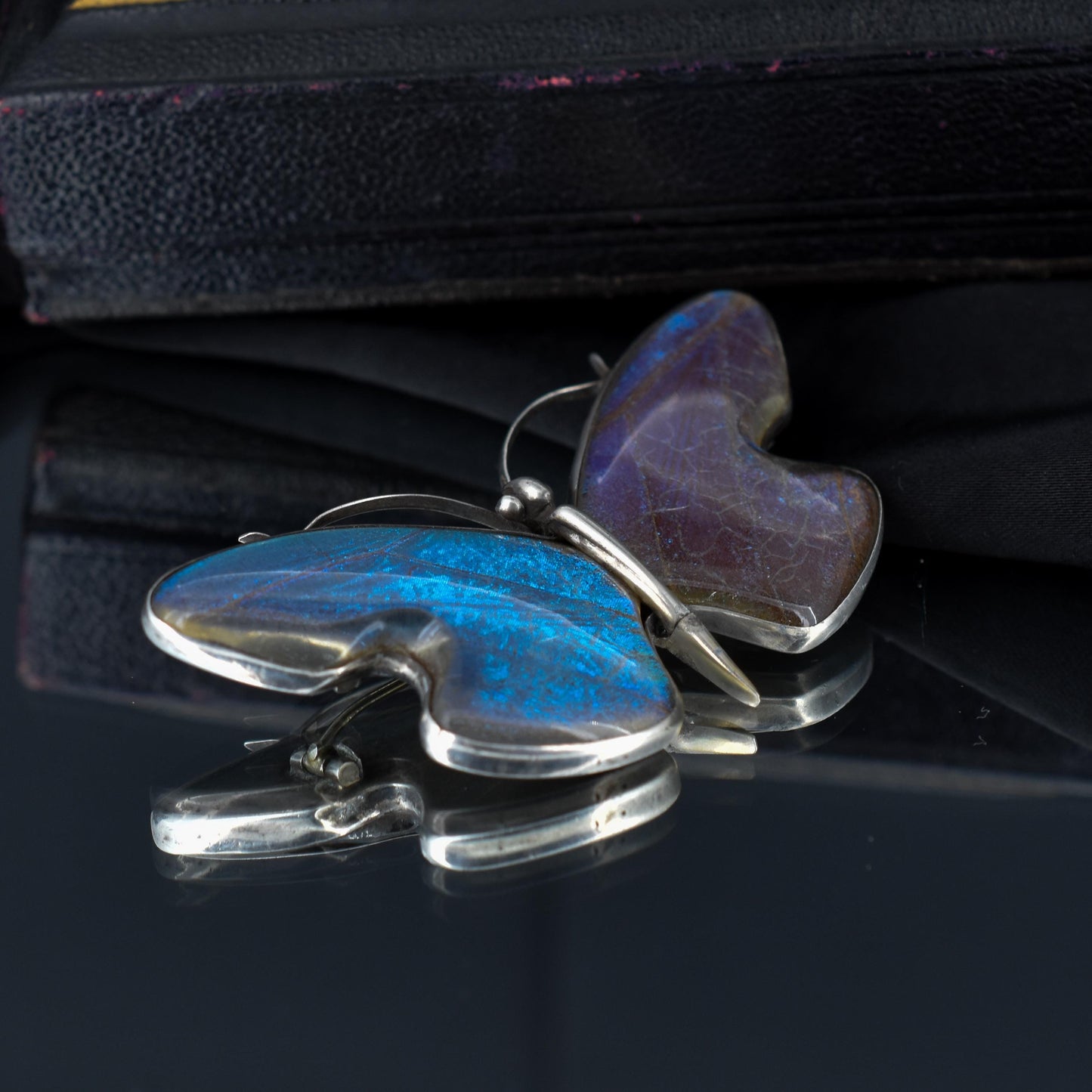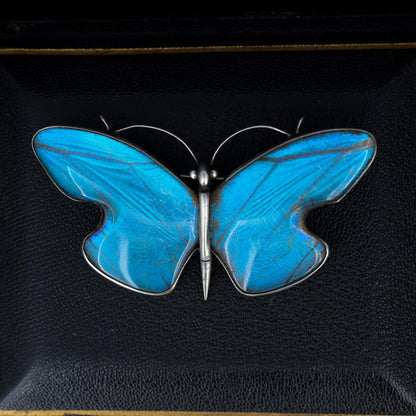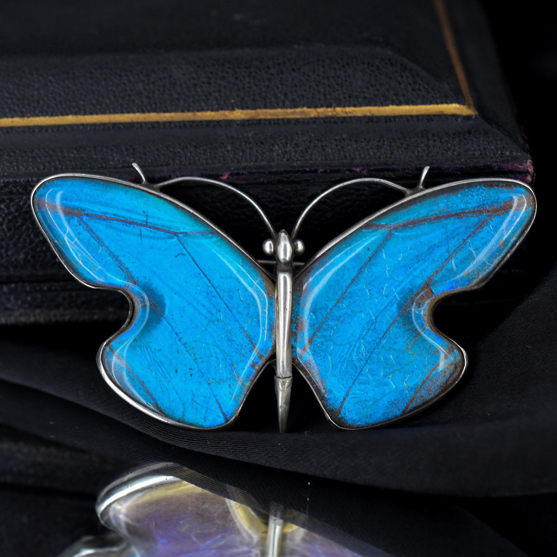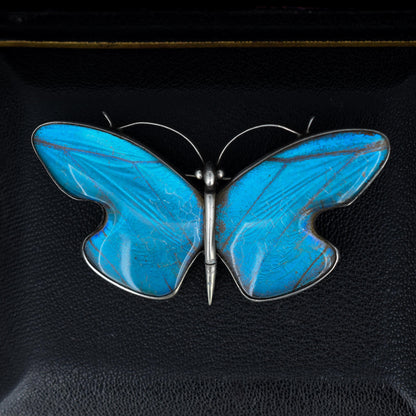 Butterfly wing jewellery has a long history and was popular from the late 1800s to the 1960s. It is gaining popularity again with sustainable butterfly farms around the world; the Blue morphos live in the tropical forests of Latin America from Mexico to Colombia.