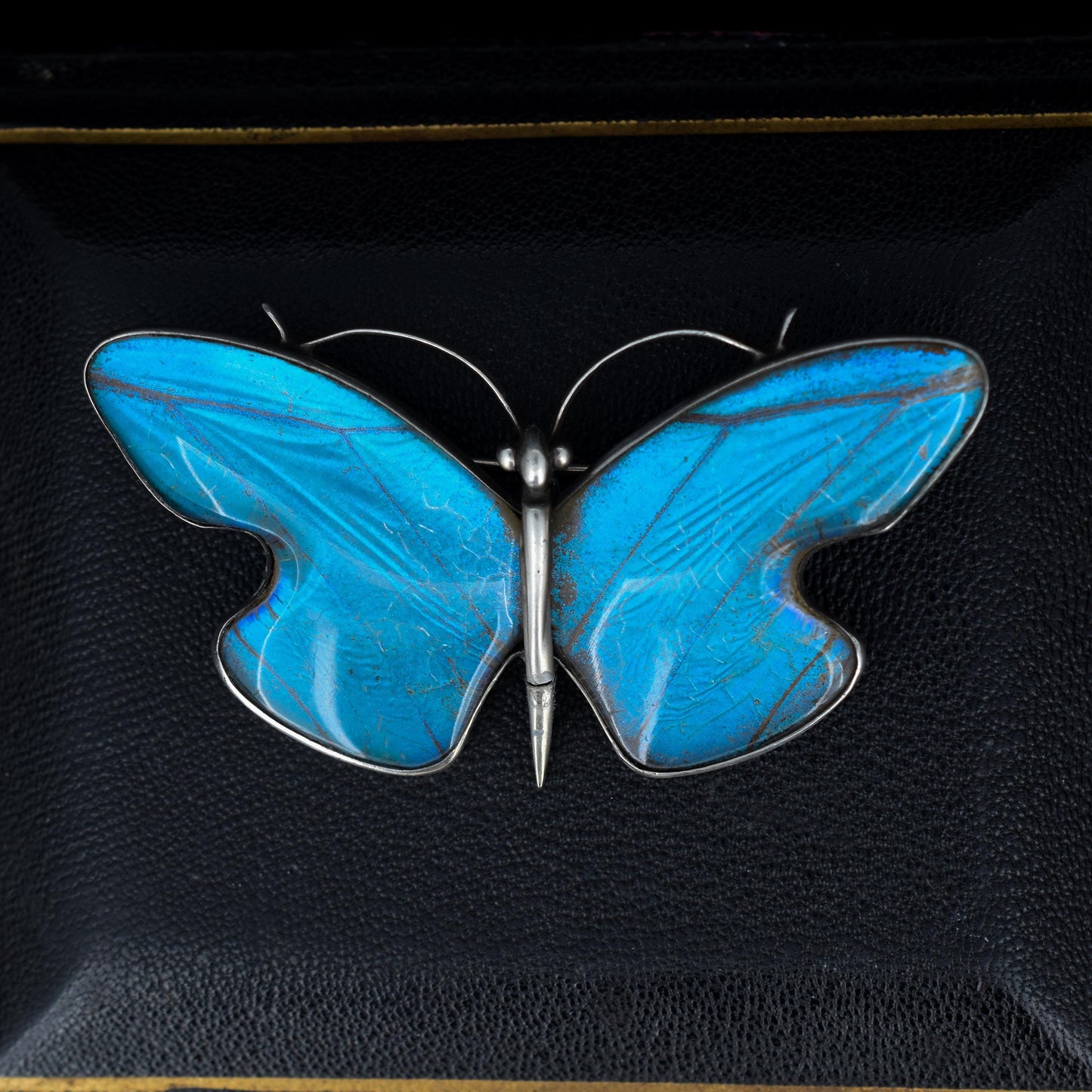 This sweet Art Deco Brooch features Blue Morpho butterfly wings under glass set into a butterfly gallery in Sterling Silver. This brooch is a perfect example of the Art Deco era, using bold, bright jewellery and unique materials made into fascinating shapes and attention to detail.