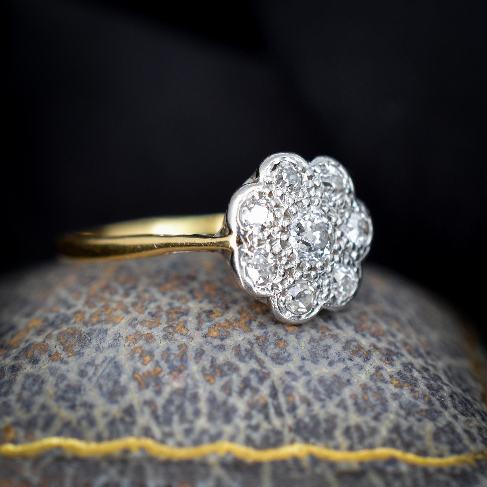 This quality Antique Diamond cluster ring is set with eight sparkling Natural Diamonds, modelled in 18ct Gold.