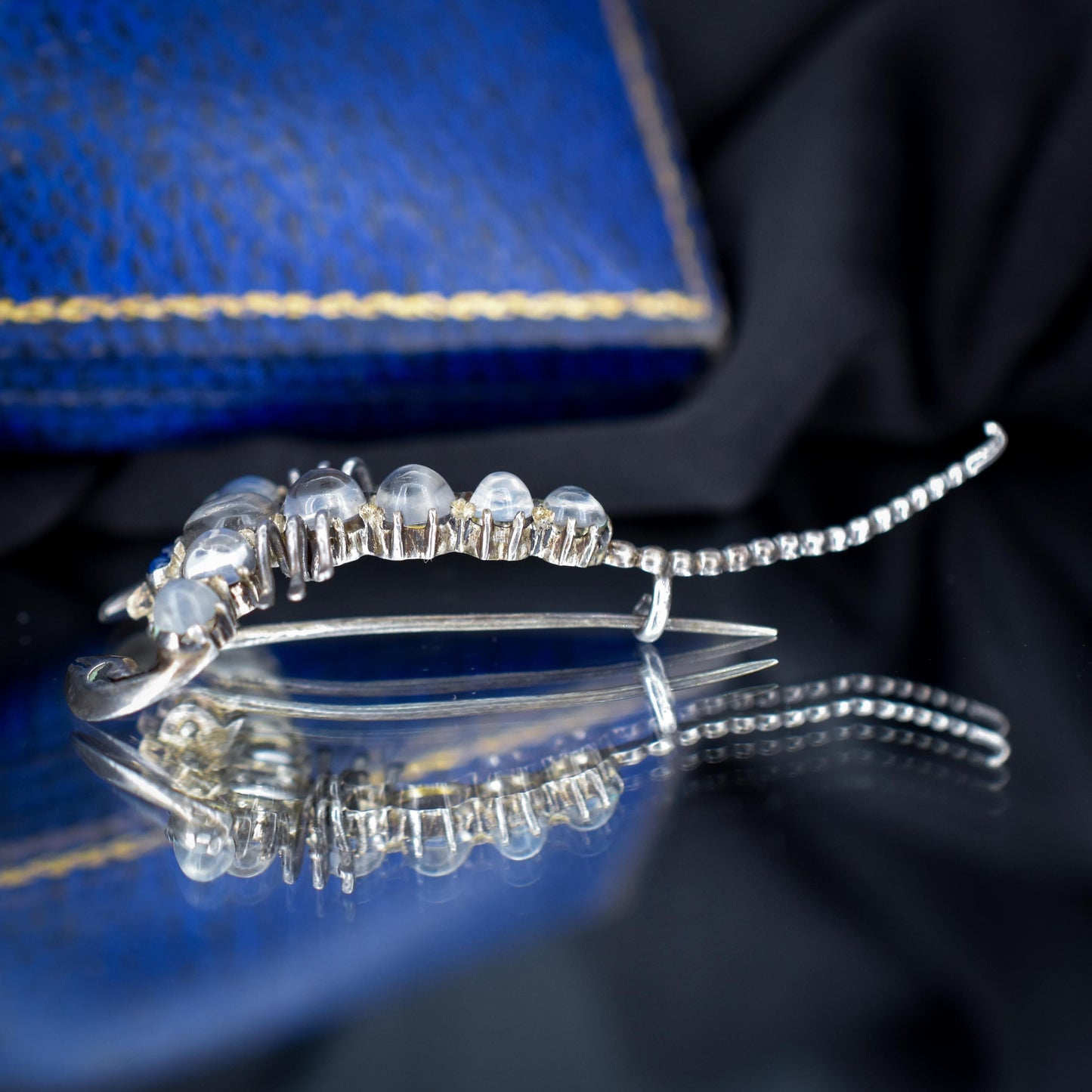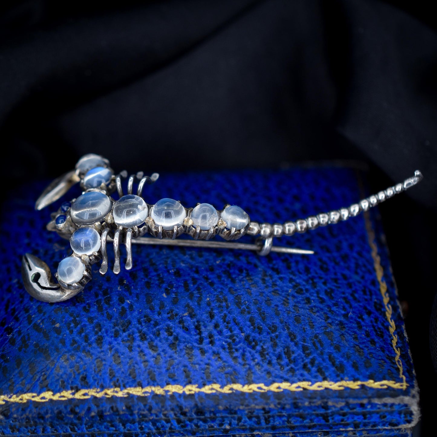 This unusual antique moonstone scorpion brooch features nine cabochon moonstones, which subtly graduate in size, dating back to circa 1900.