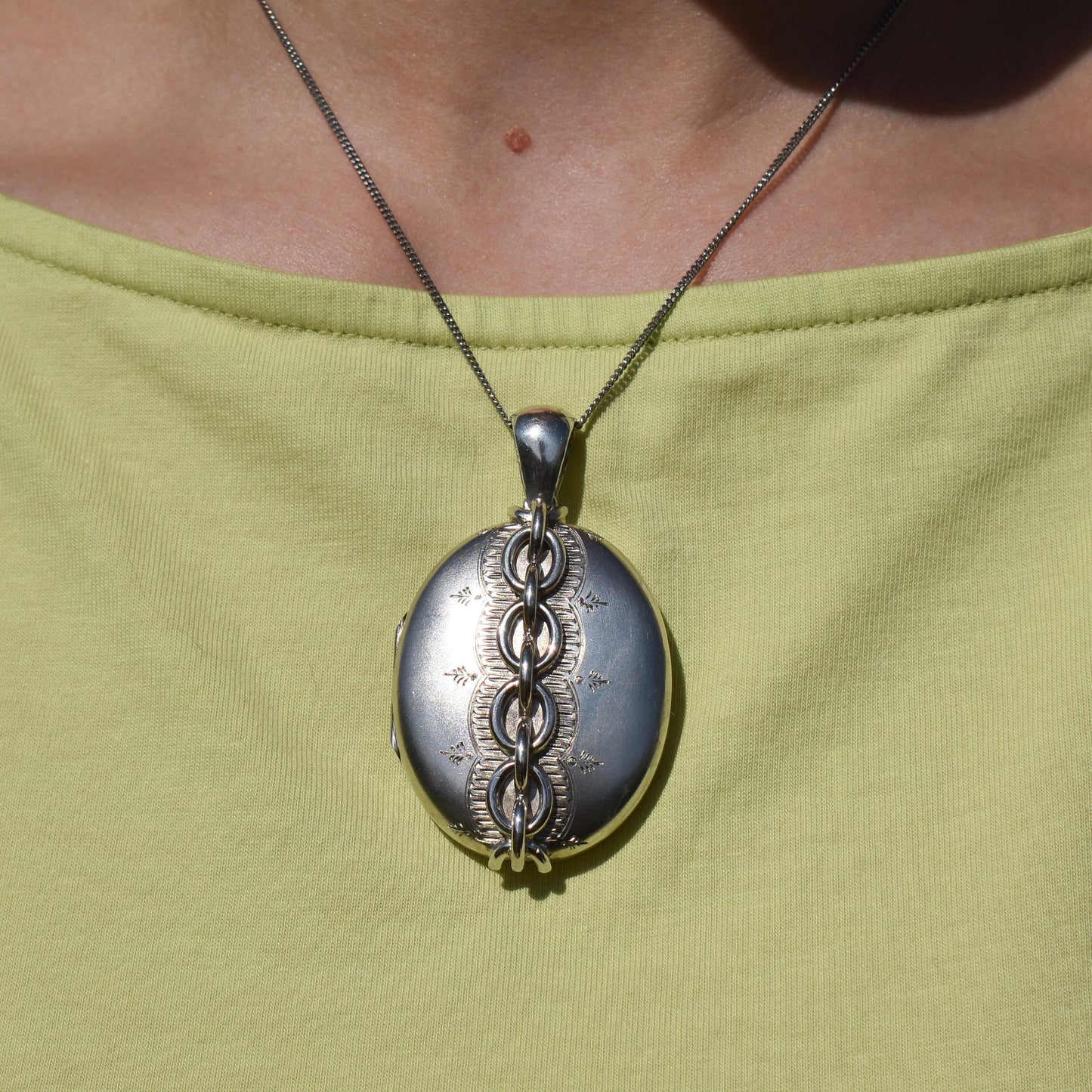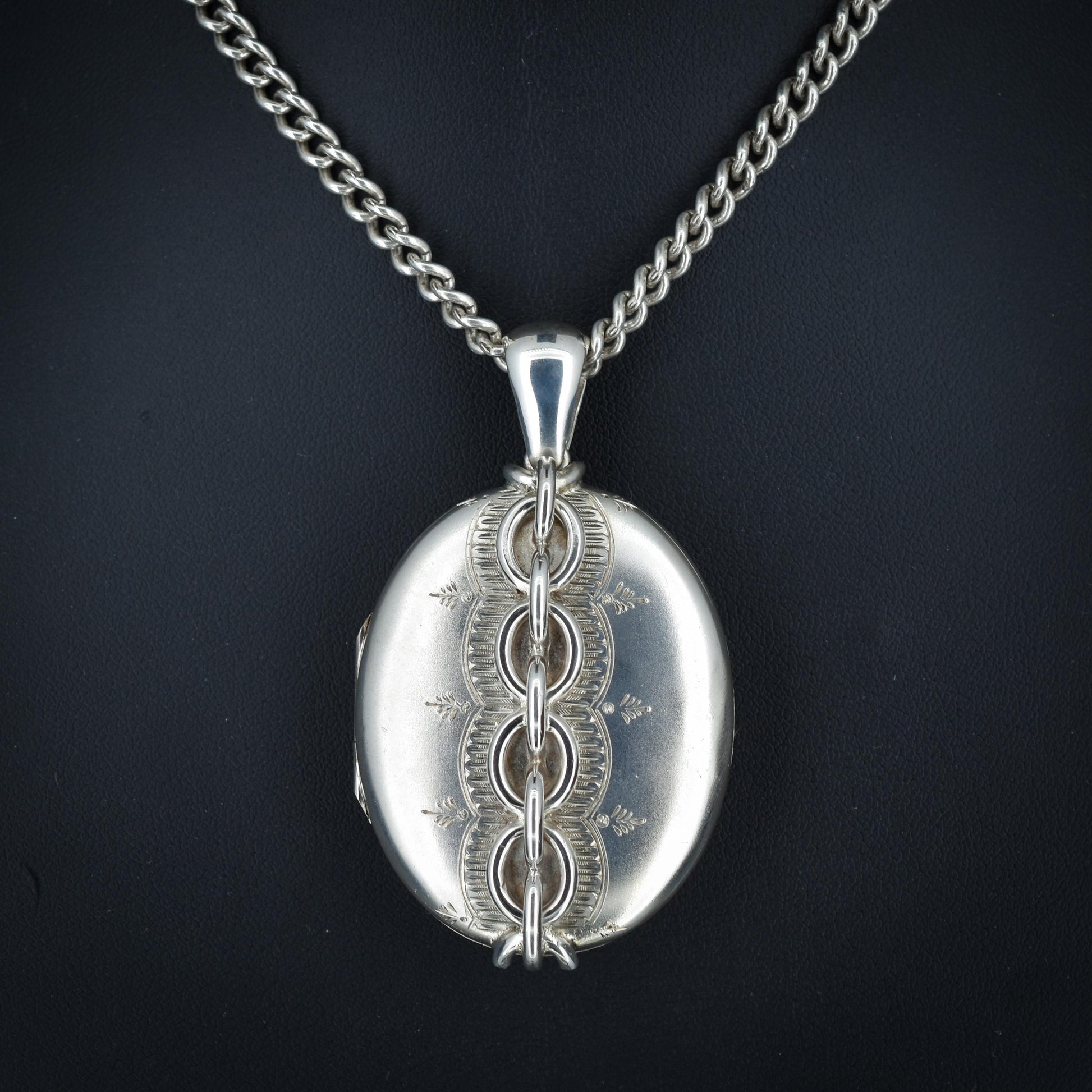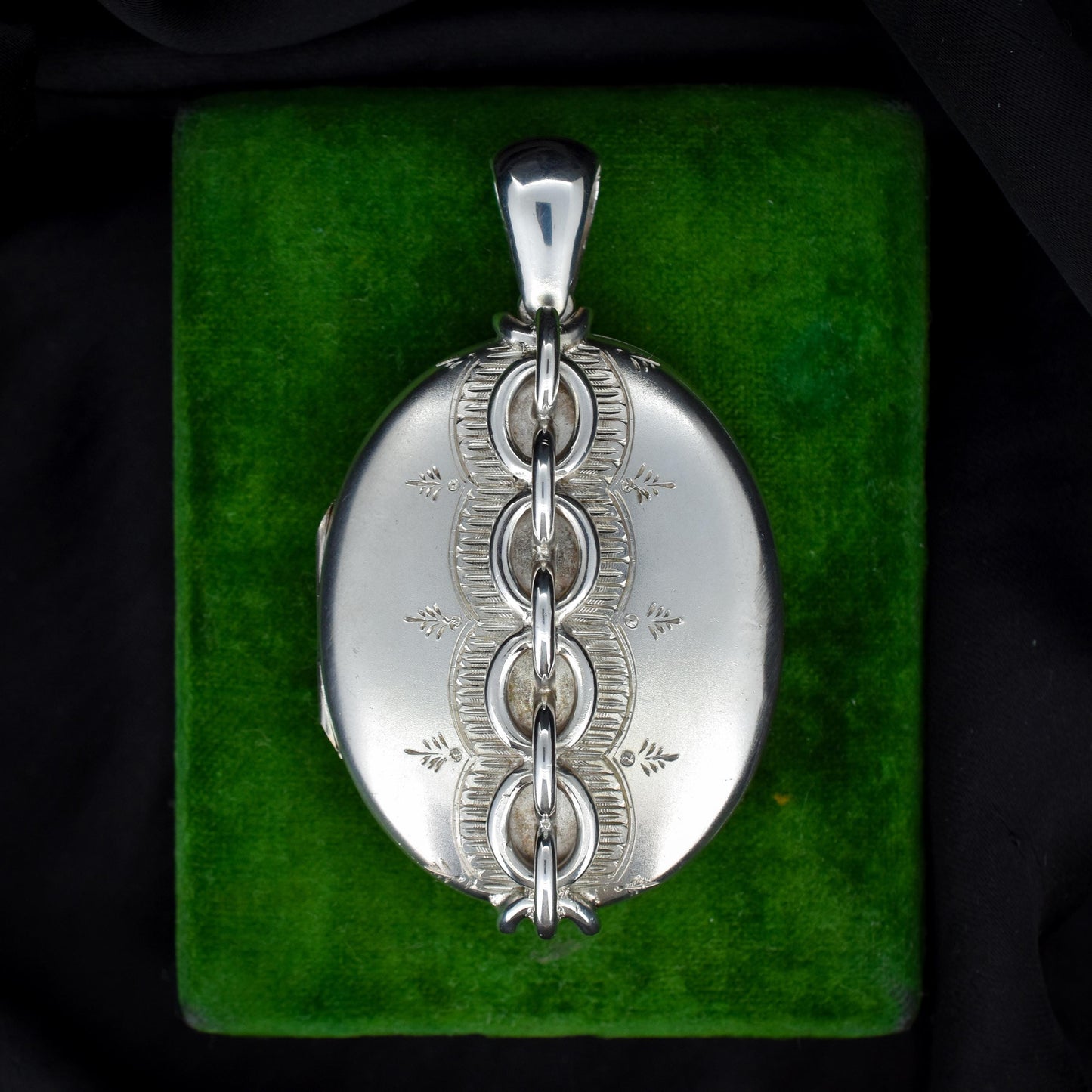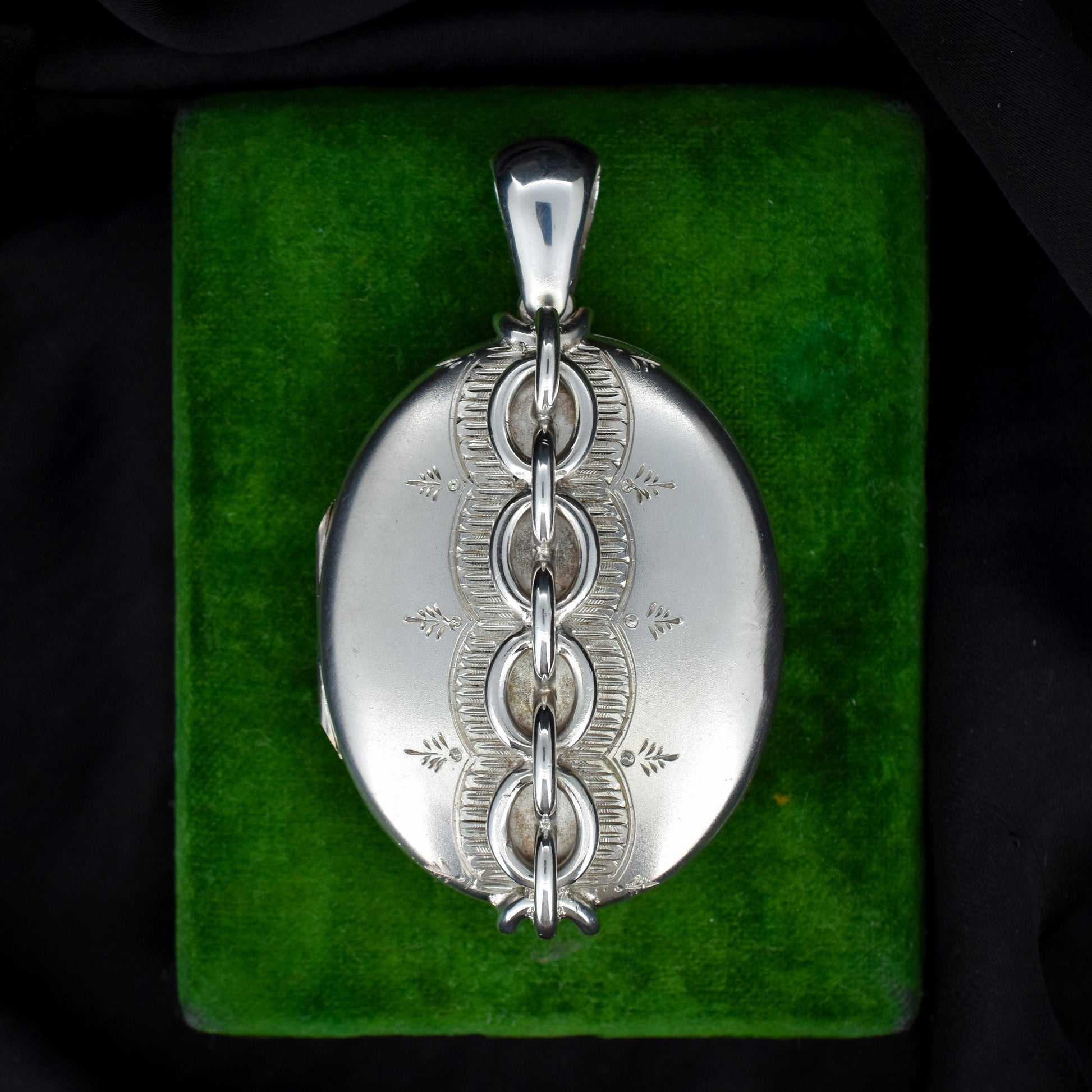This beautiful Antique Victorian Locket, modelled in sterling silver, features delicate pattern metalwork and a unique chain link vertically down the locket. The locket features a large bail, and the back is smooth.