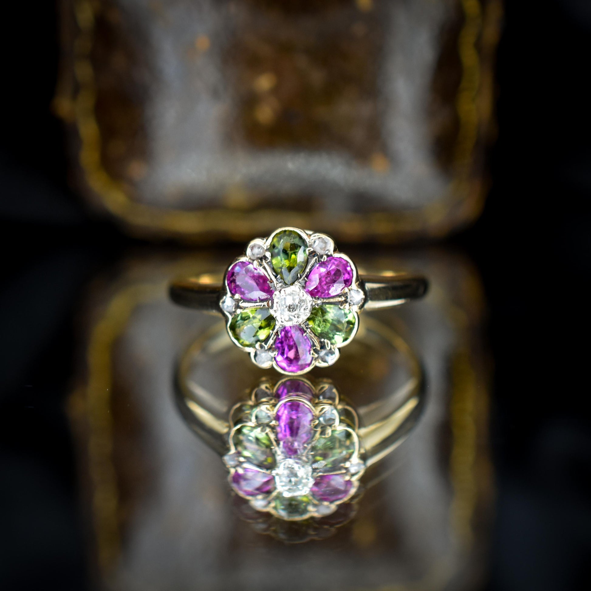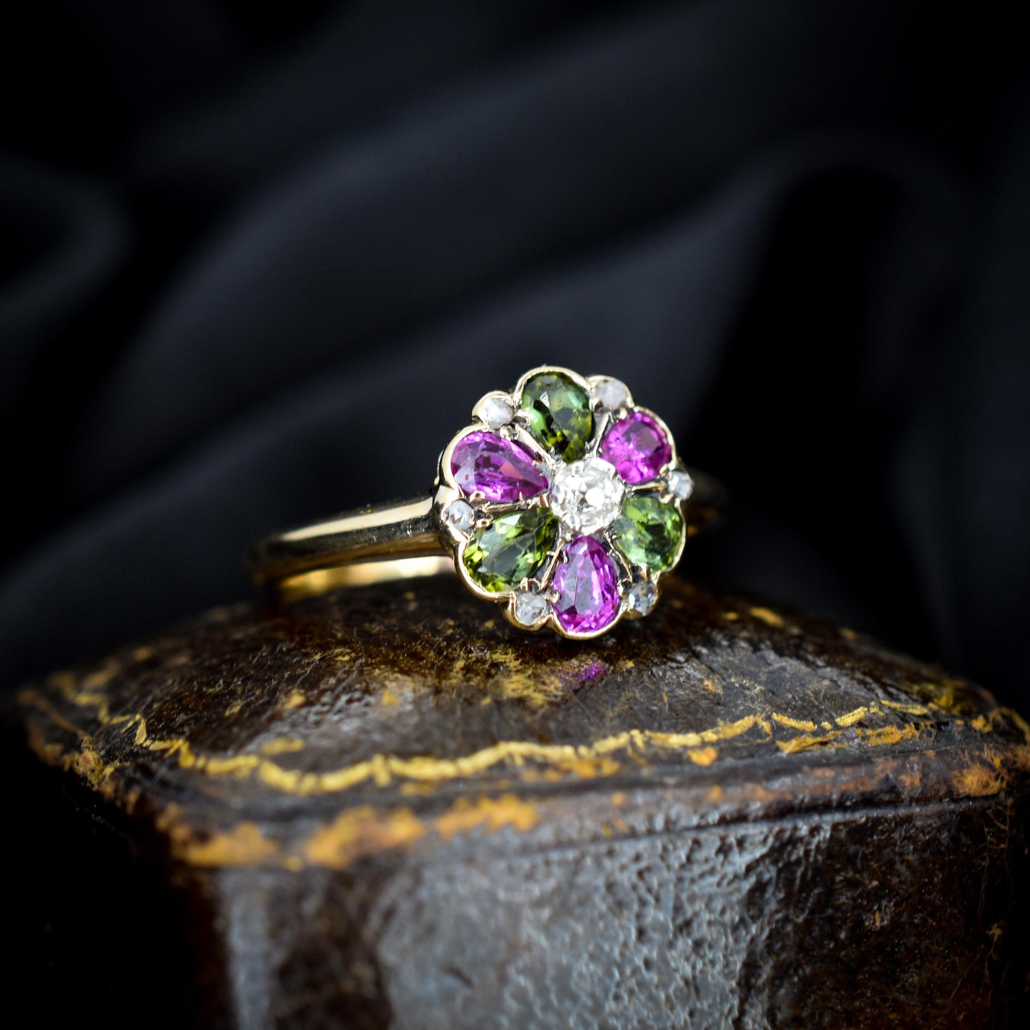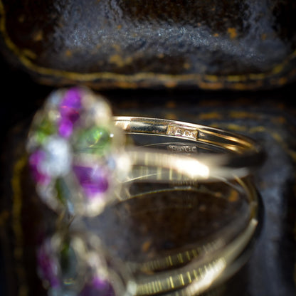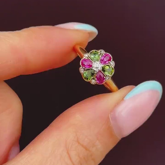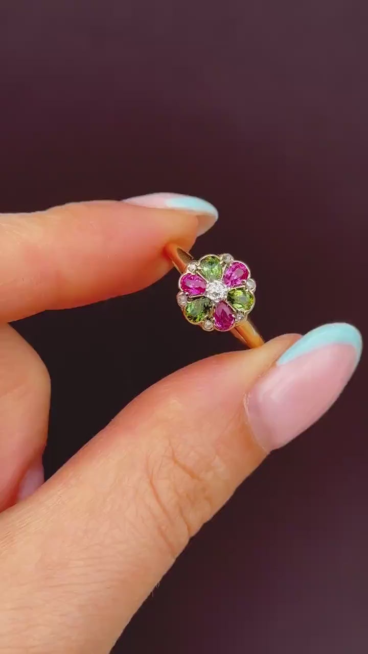 Antique Ruby Diamond and Green Tourmaline Flower 18ct Yellow Gold Ring