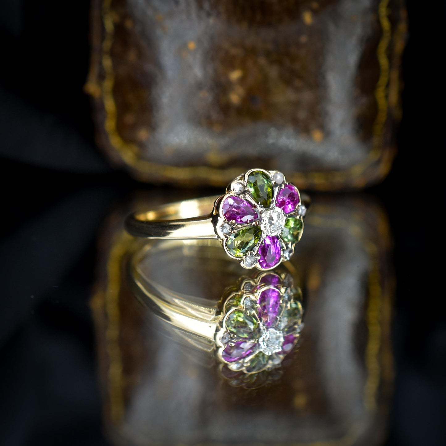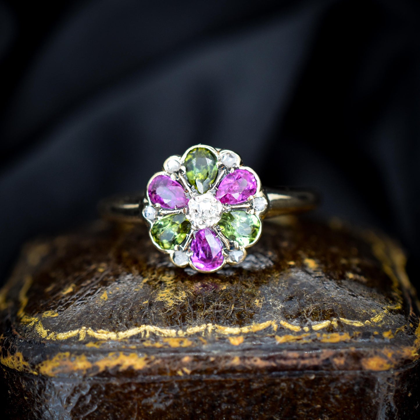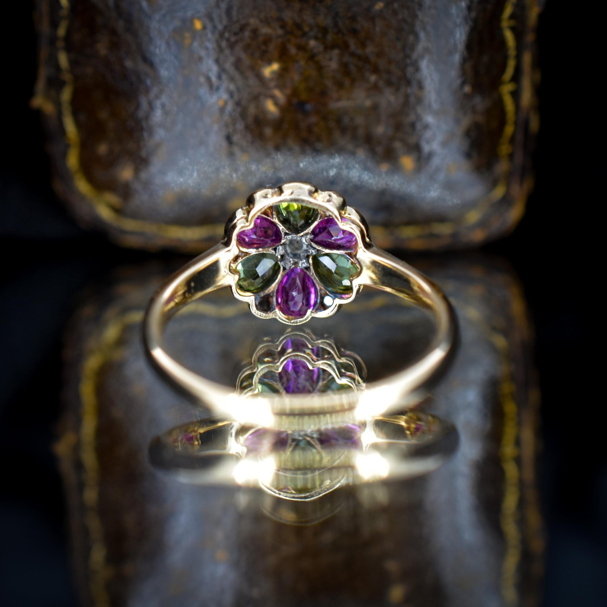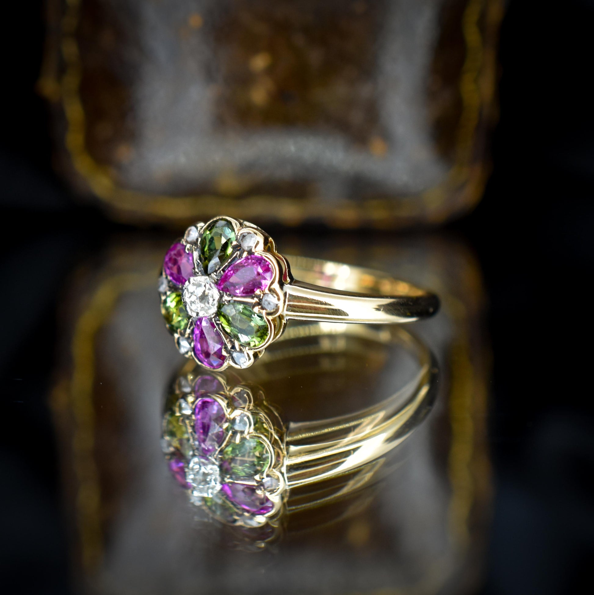 Antique Ruby Diamond and Green Tourmaline Flower 18ct Yellow Gold Ring
