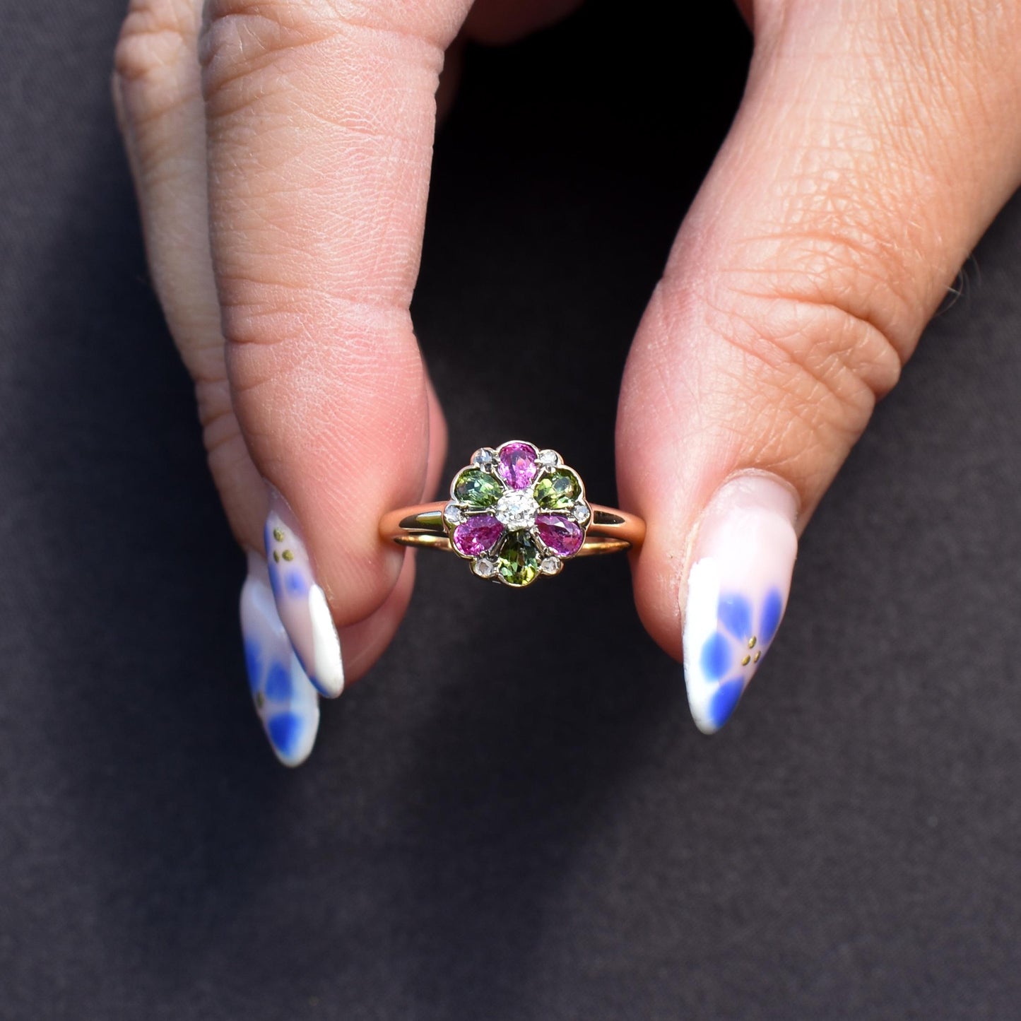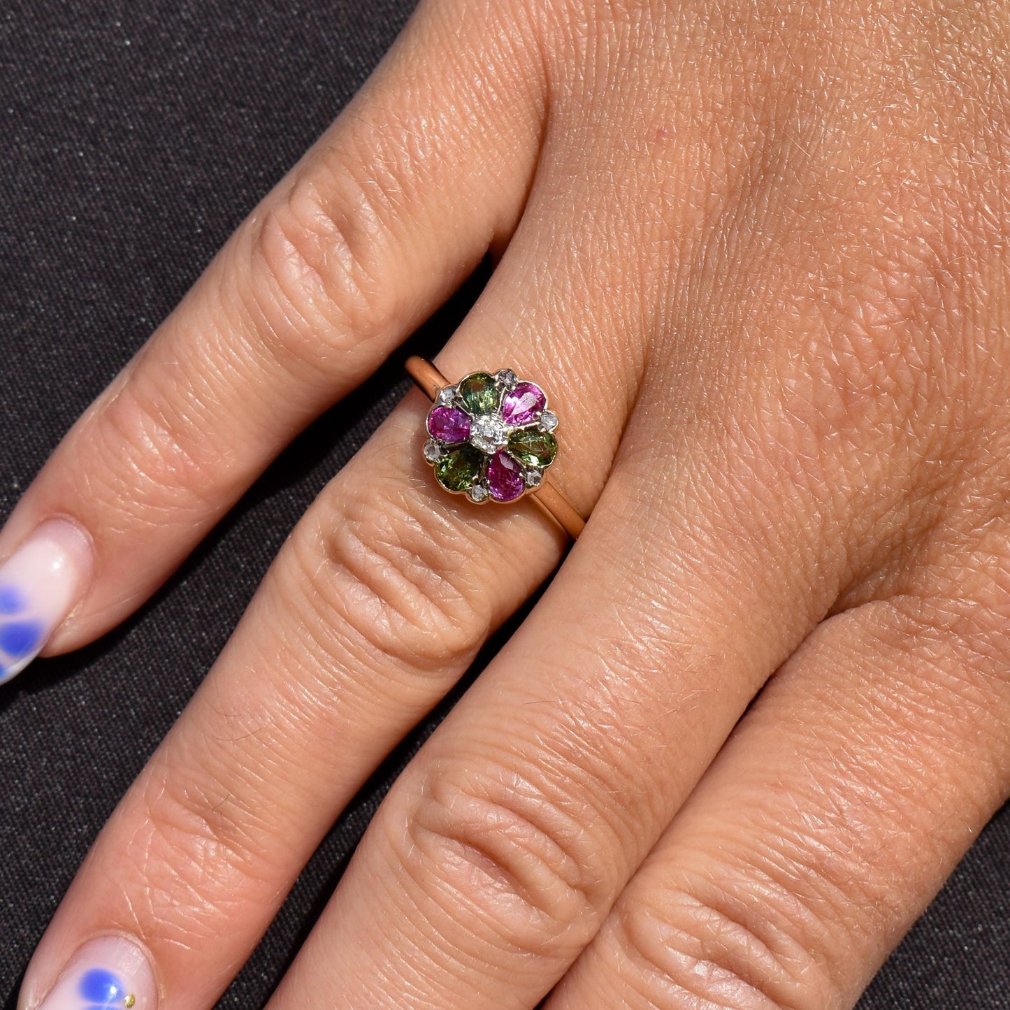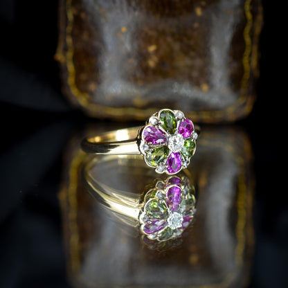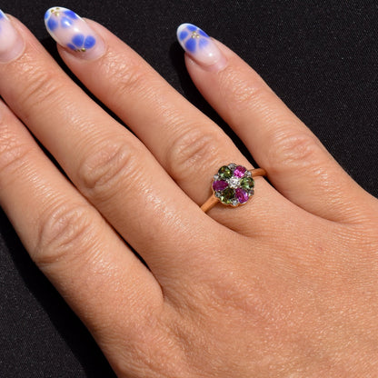 This vibrant Antique cluster ring, exquisitely crafted in 18ct yellow gold. At its center lies a old-cut diamond, elegantly framed by a halo of petal-like rubies and vibrant green tourmalines that gracefully alternate around the face of the ring. To elevate its radiance even further, six delicate diamonds are thoughtfully set, enhancing the ring's overall brilliance.