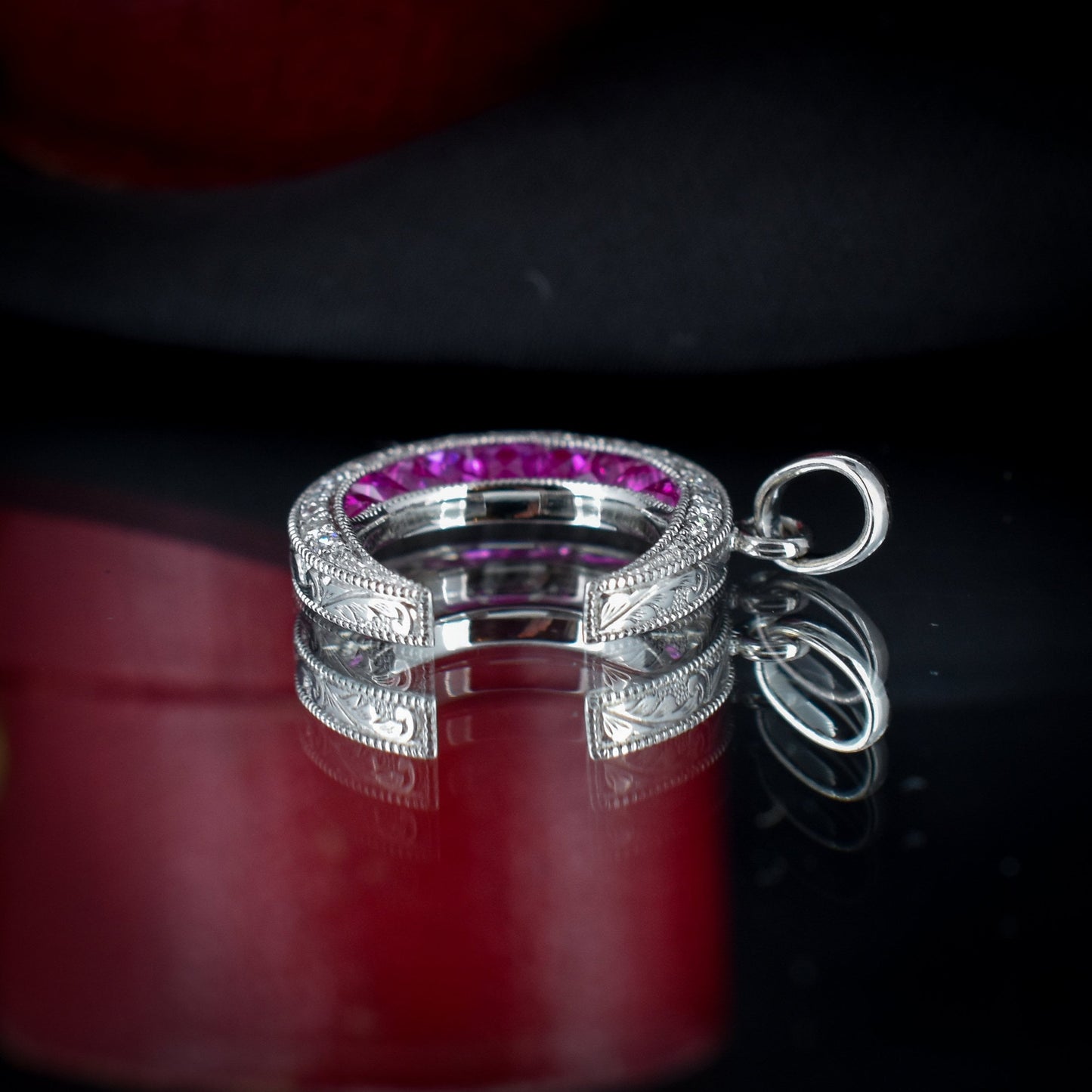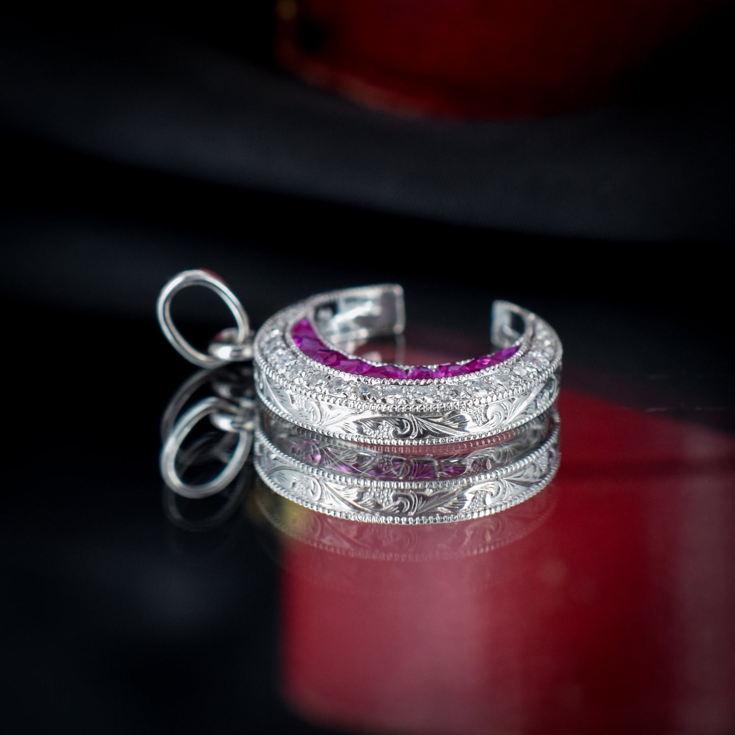This quality antique-style Crescent pendant features rubies and diamonds modelled in beautifully engraved platinum.