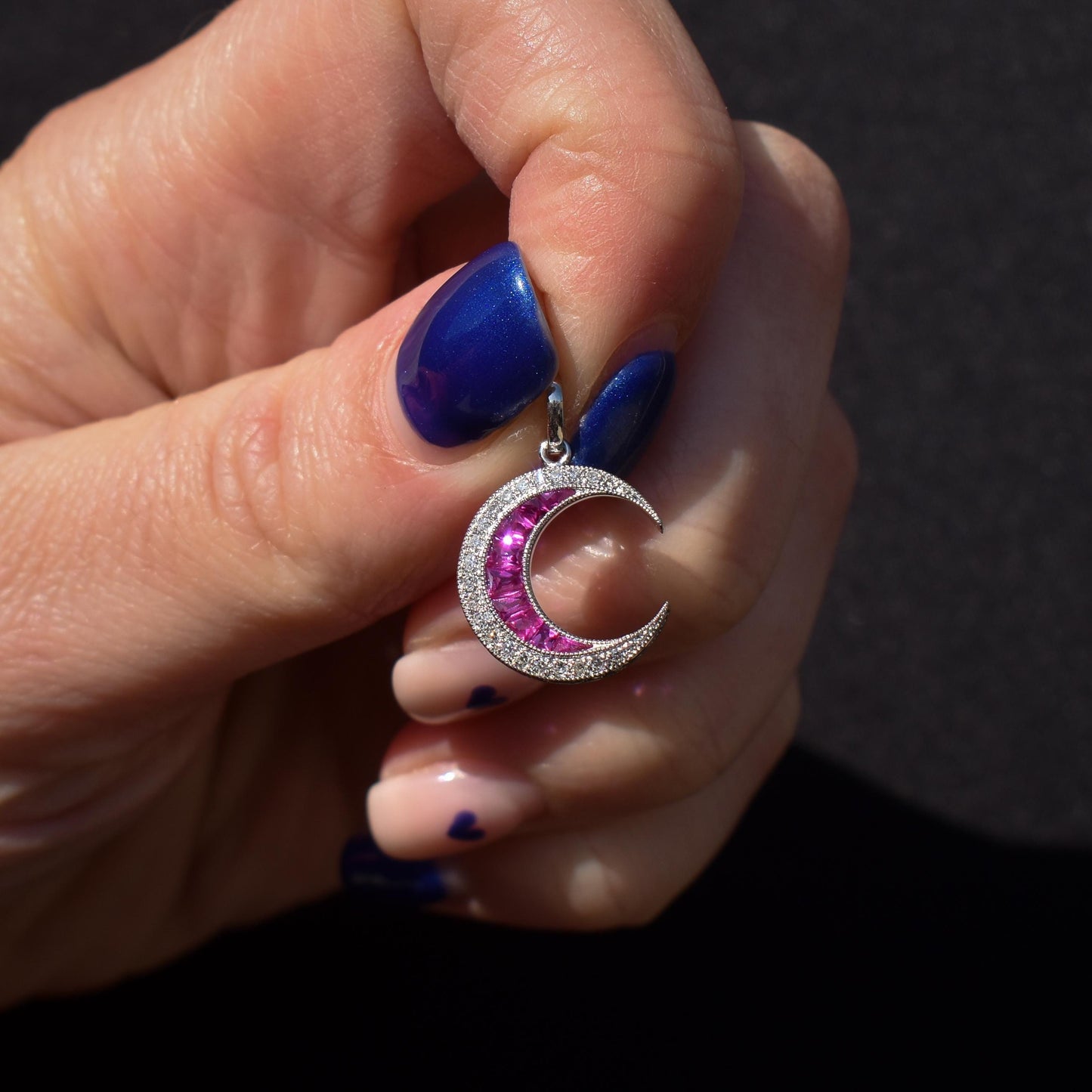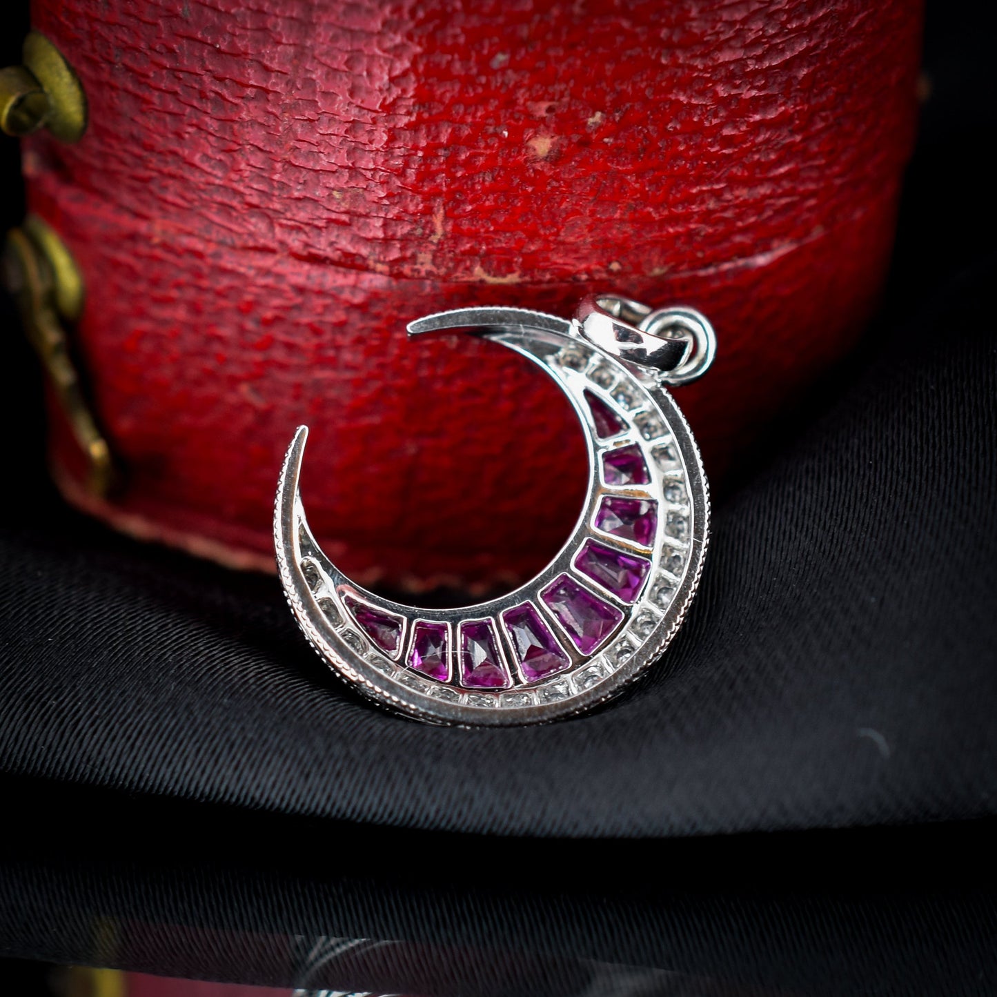 Antique Style Diamond and Ruby Crescent Moon Platinum Pendant