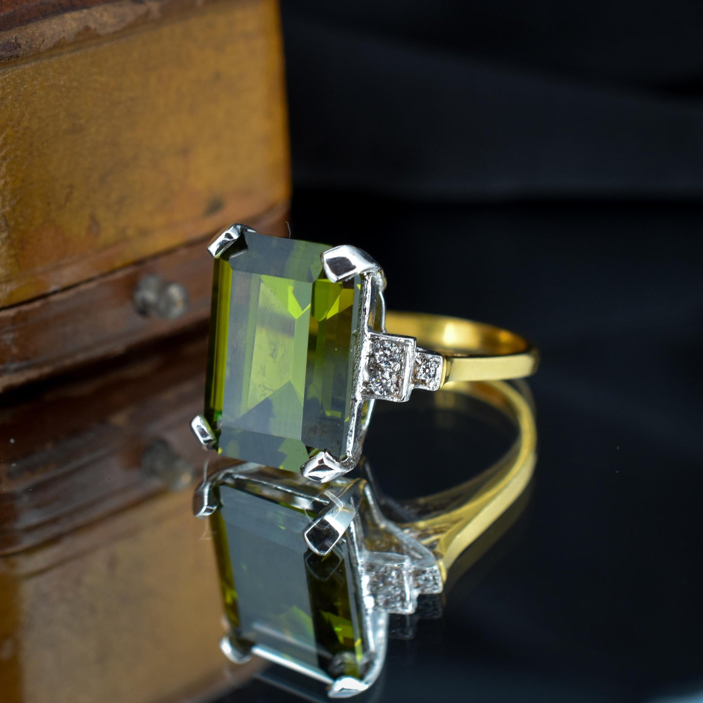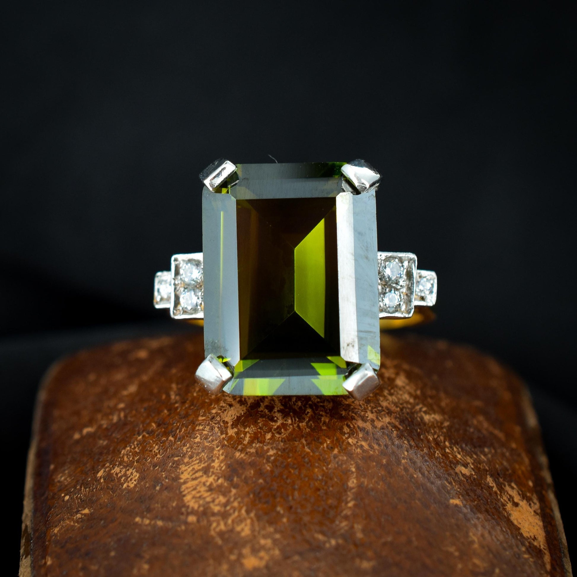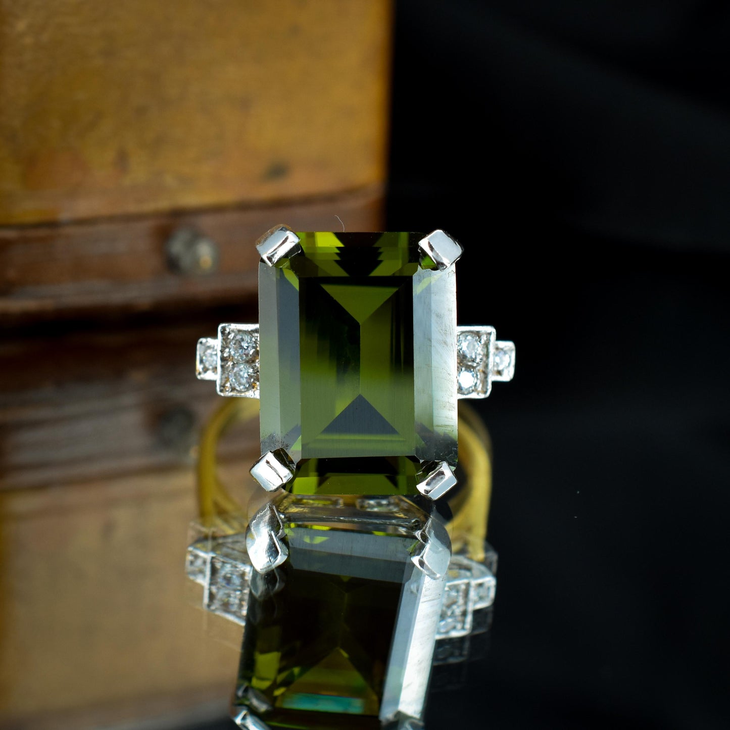 This beautiful Green Paste ring is set in an Art Deco-inspired gallery. The ring features a gorgeous emerald-cut olive green paste stone and geometric shoulder accents dotted with six sparkly Paste stones.