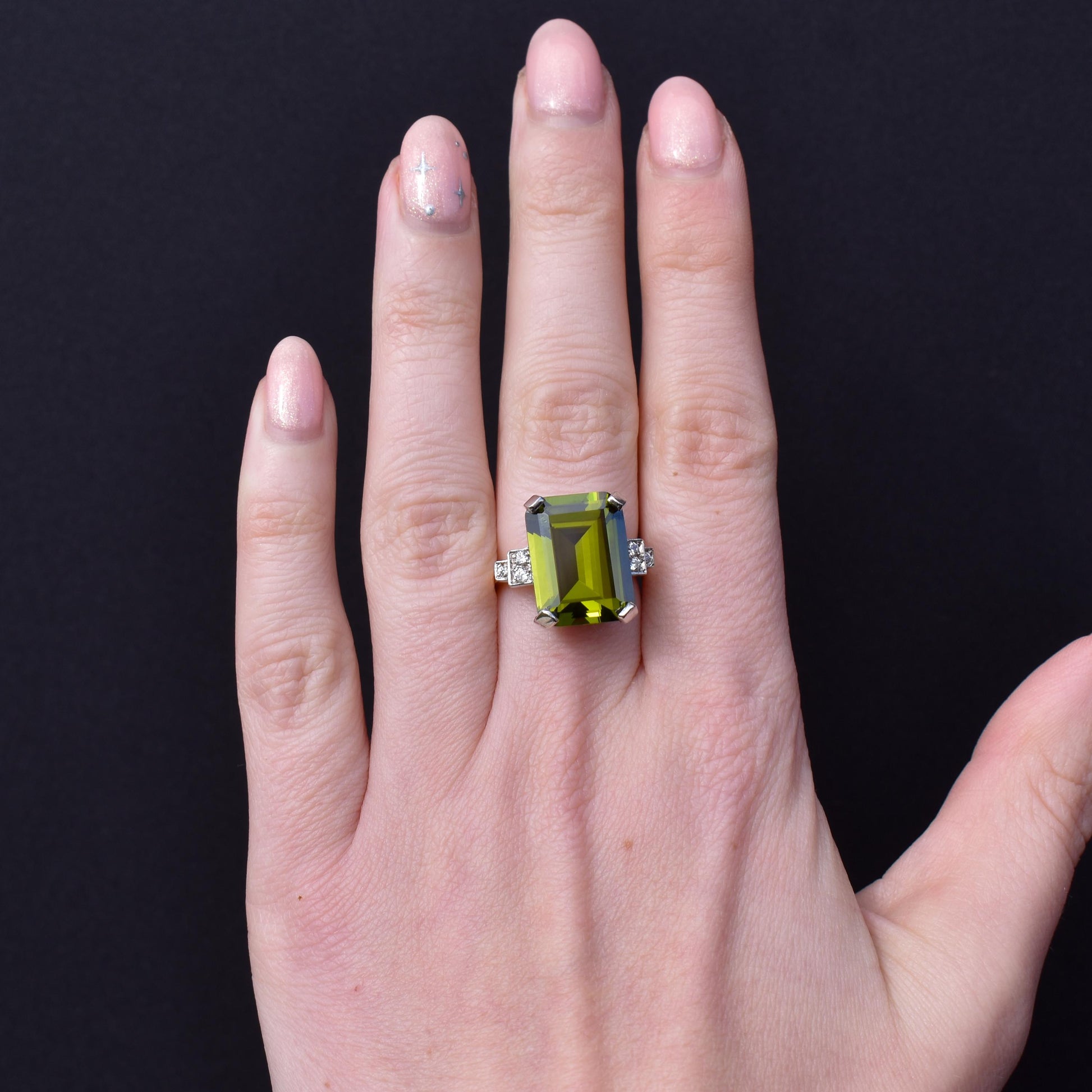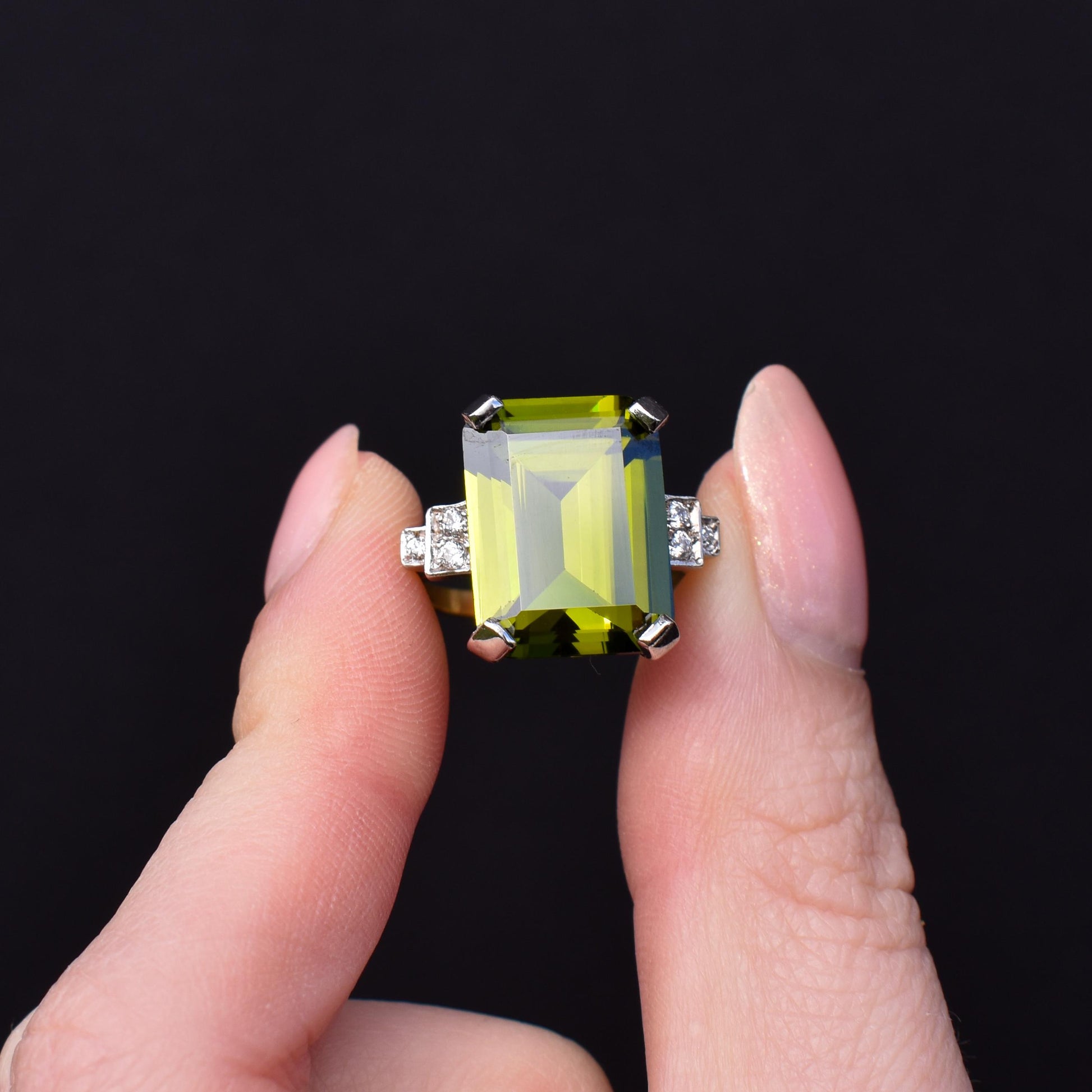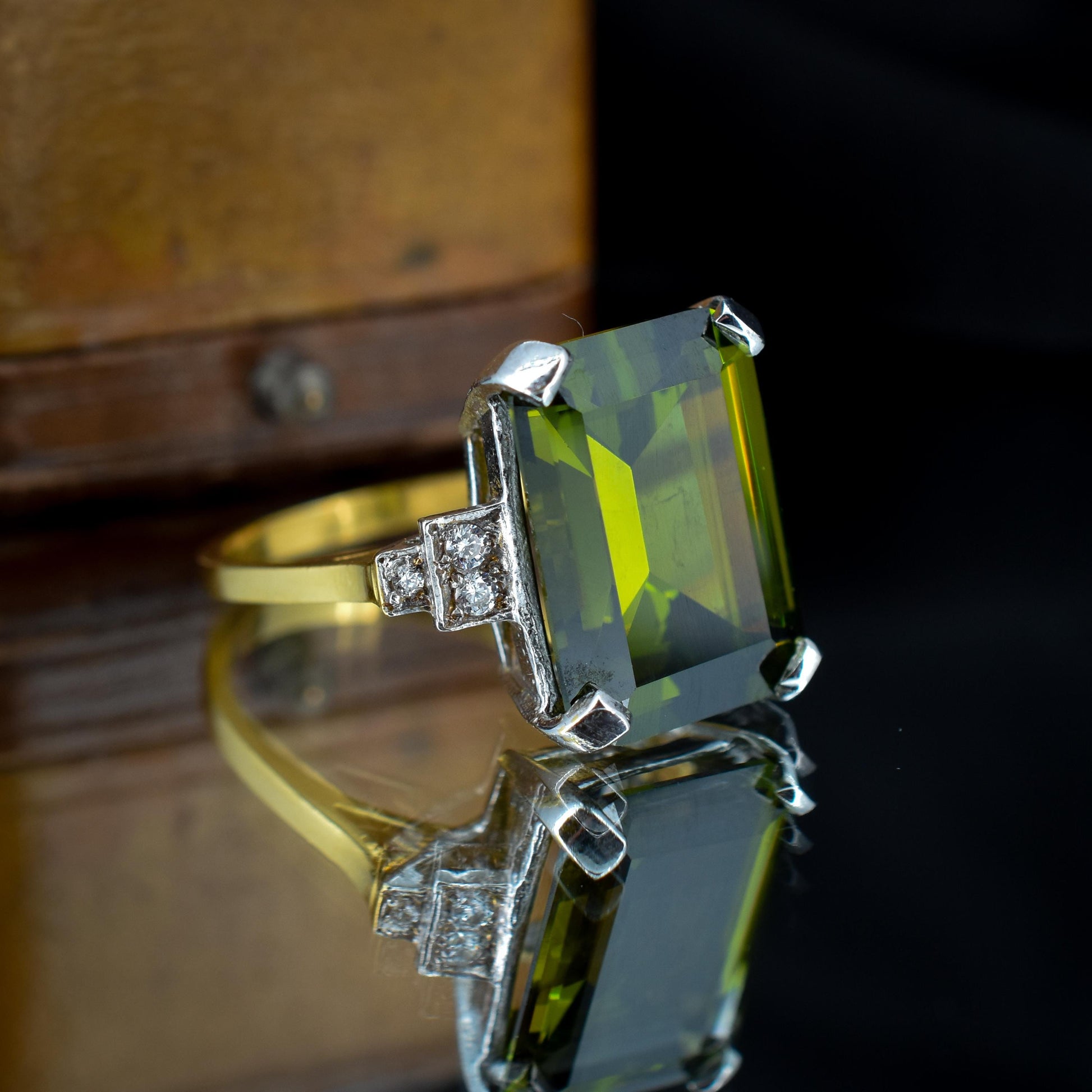 This beautiful Green Paste ring is set in an Art Deco-inspired gallery. The ring features a gorgeous emerald-cut olive green paste stone and geometric shoulder accents dotted with six sparkly Paste stones.