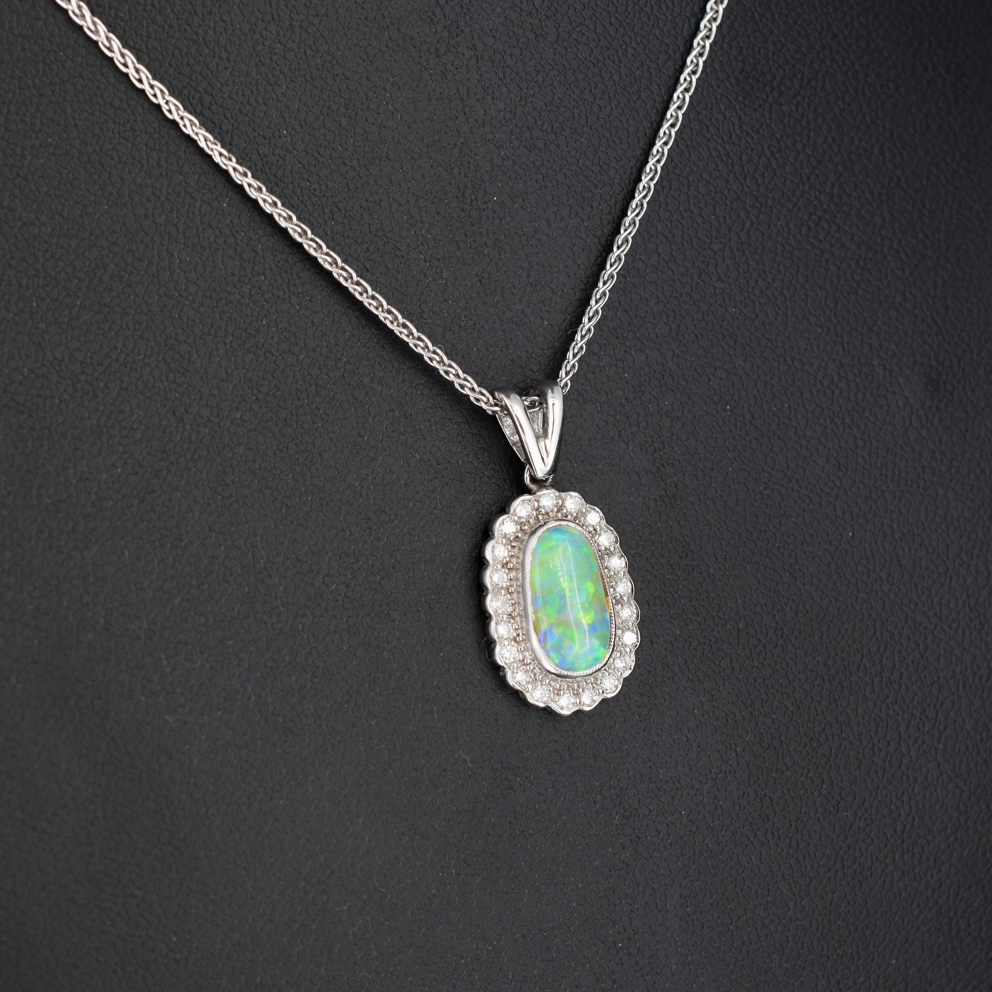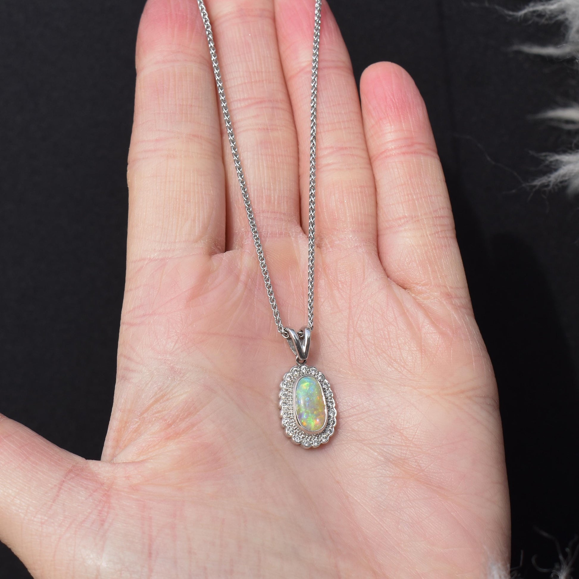 Finished with a delicate white gold chain, this necklace is both stylish and comfortable, allowing it to be a cherished piece for everyday elegance or special moments. Whether gifted to a loved one or worn as a personal treasure, this Opal and Diamond Necklace is sure to enchant all who behold it.