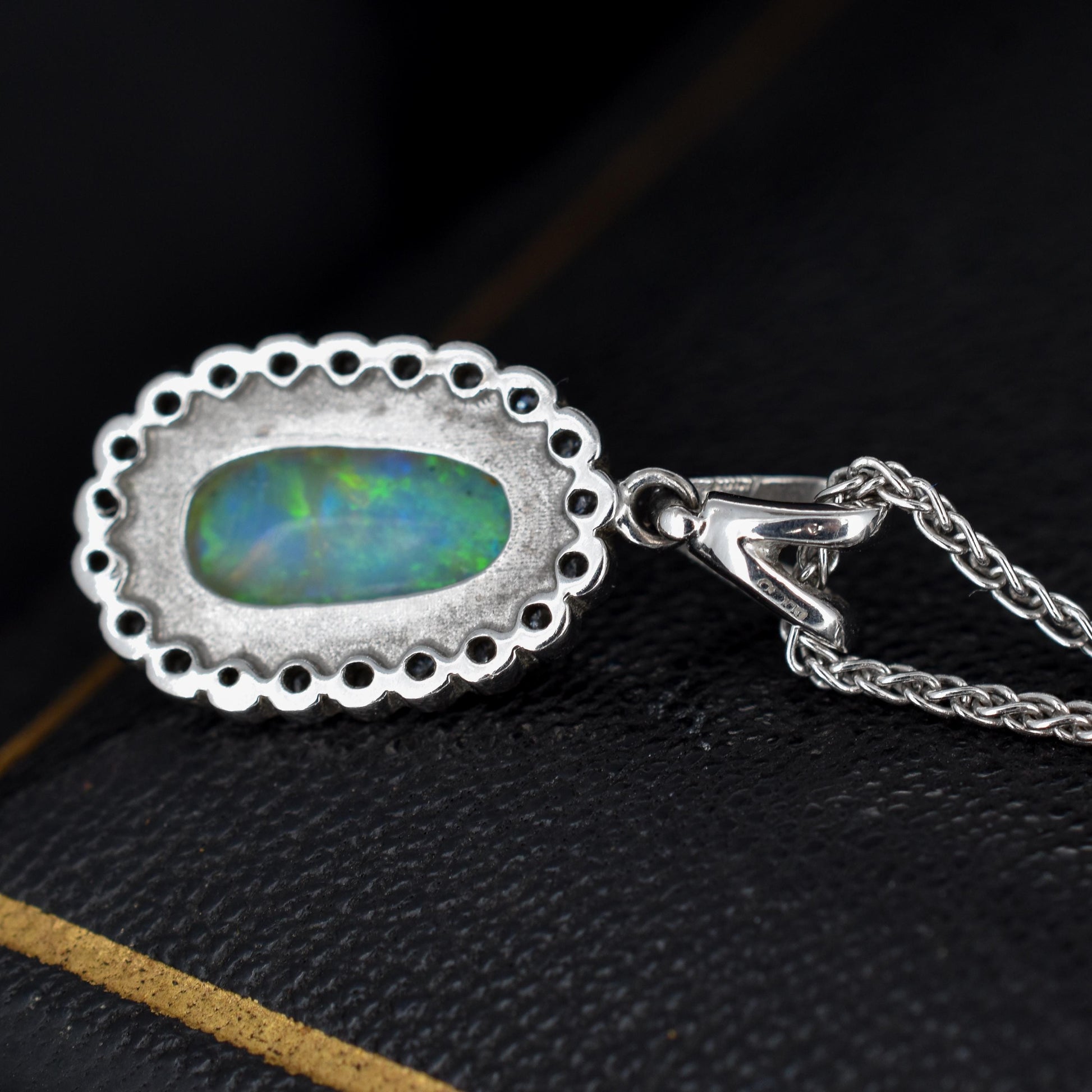 This beautiful Opal pendant is simply stunning. The Opal is full of fire and life, dancing blue and neon green tones in the light. Encircled by a halo of Diamonds, it is an exquisite choice for anyone seeking to add a touch of fiery sophistication to their style.
