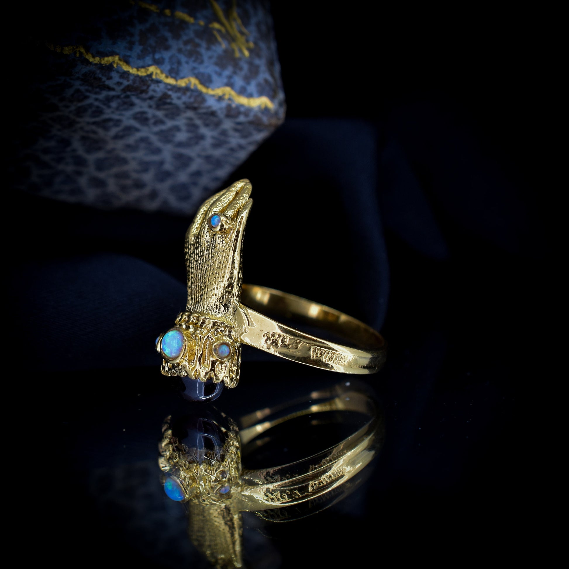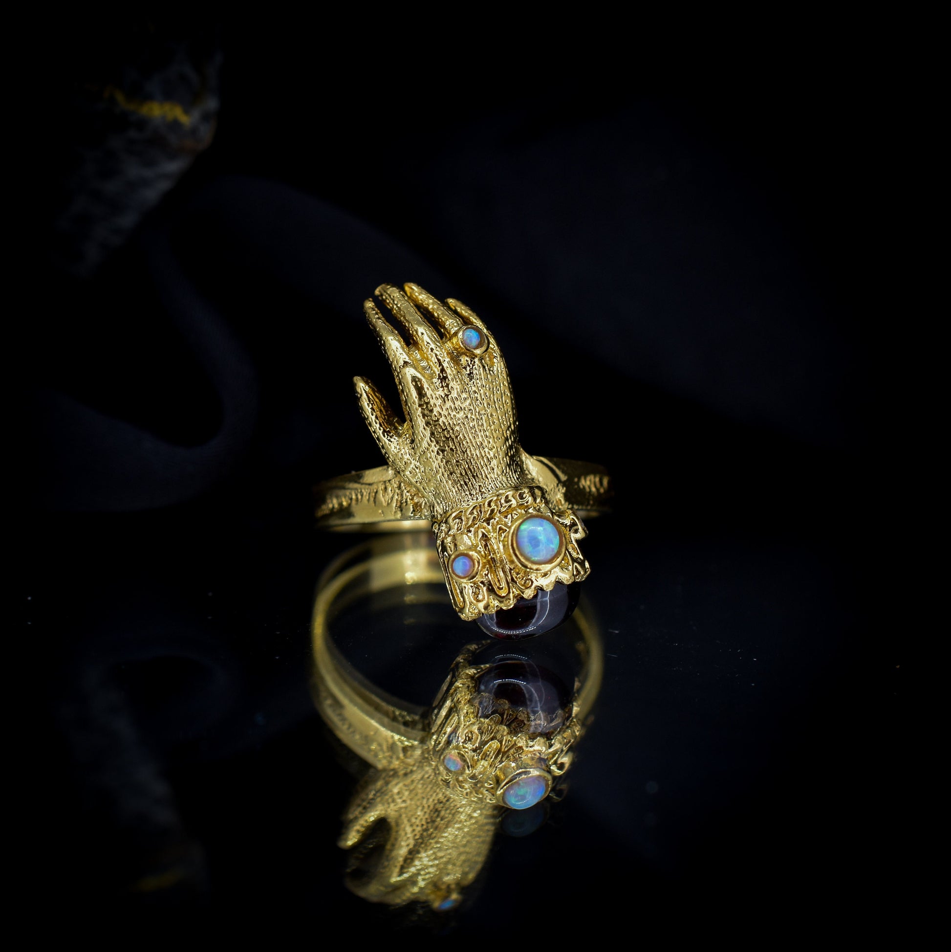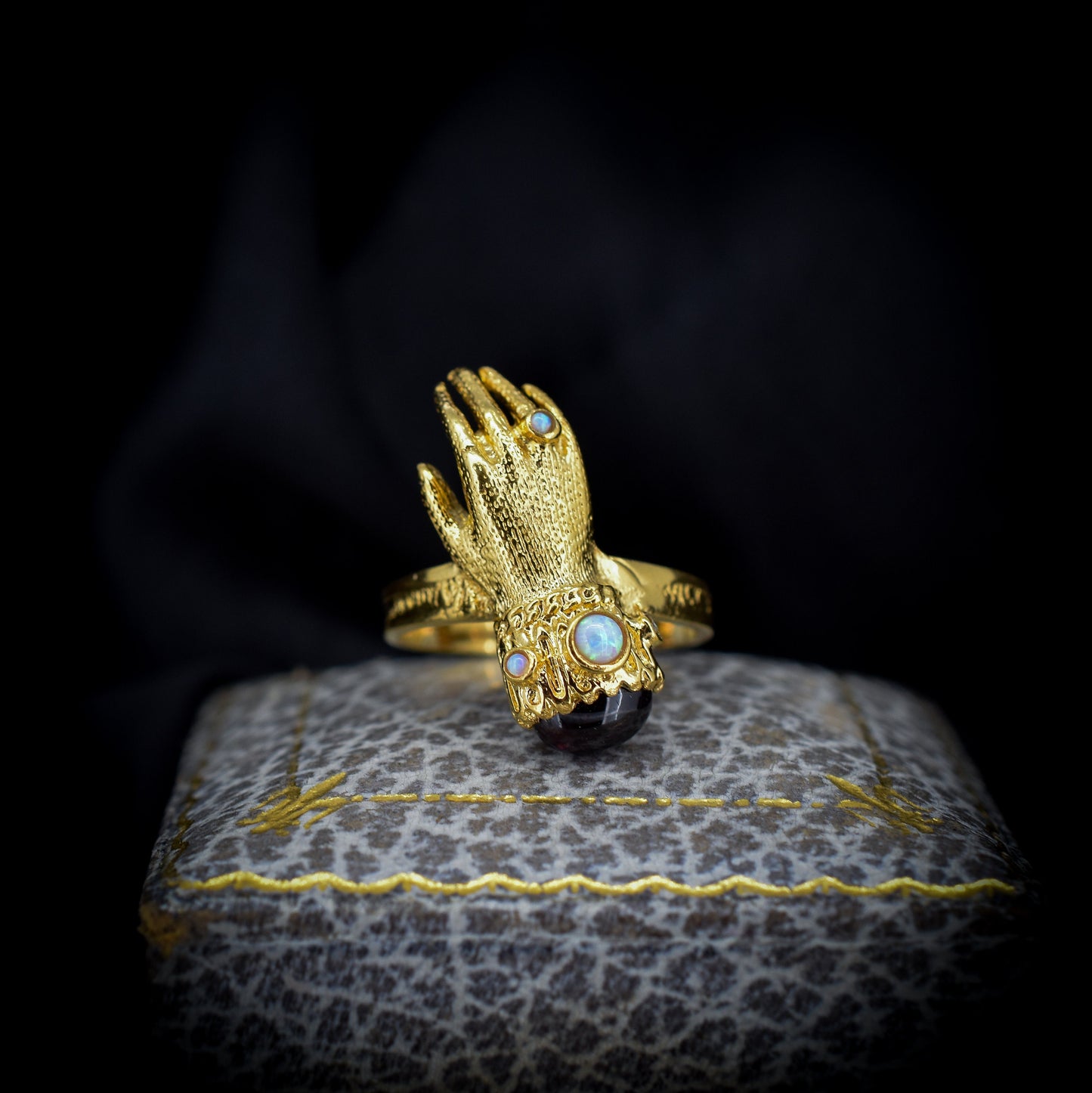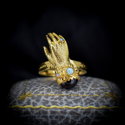 Este inusual anillo de estilo georgiano antiguo presenta una mano de Figa decorada con un cabujón de Granate y ópalos en plata bañada en oro amarillo de 18 quilates.