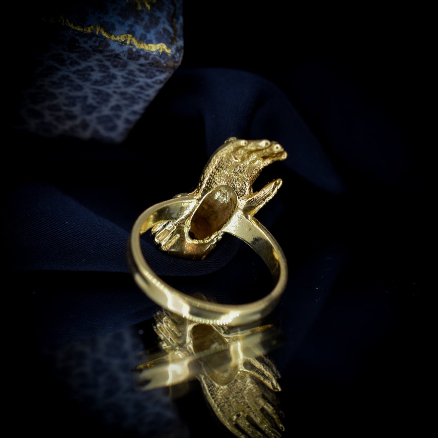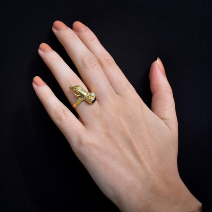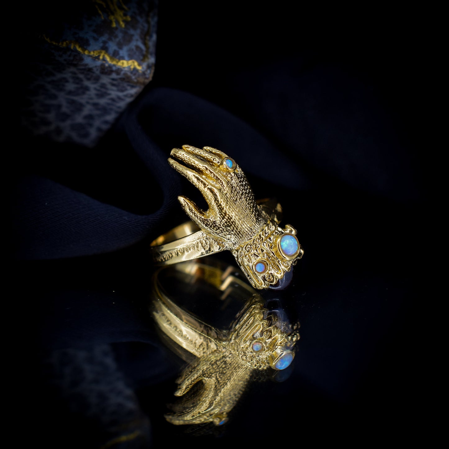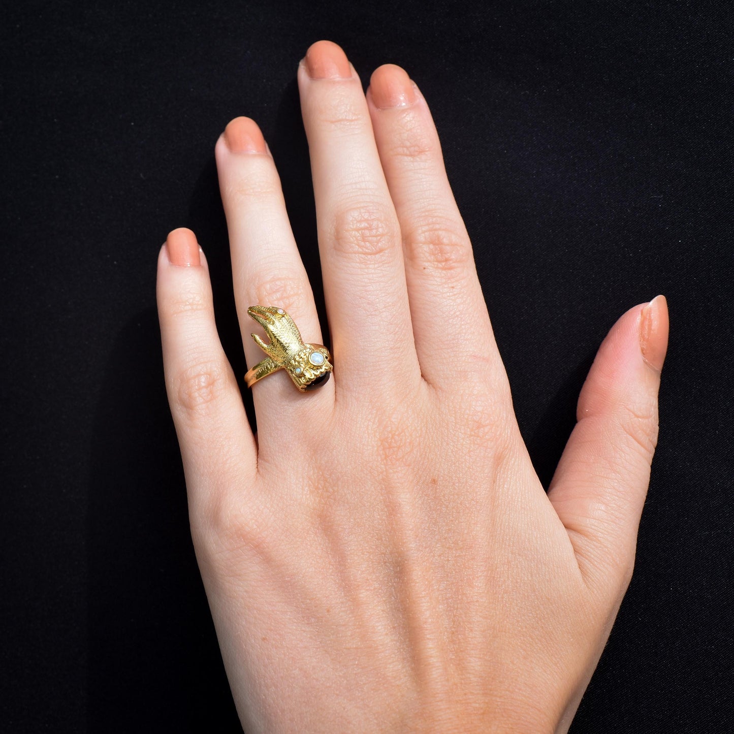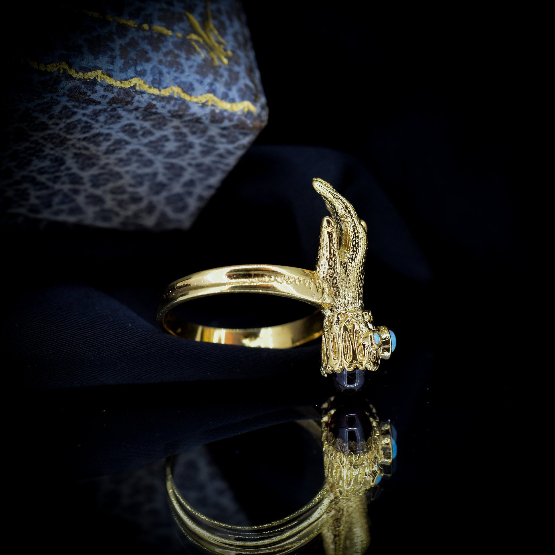Este inusual anillo de estilo georgiano antiguo presenta una mano de Figa decorada con un cabujón de Granate y ópalos en plata bañada en oro amarillo de 18 quilates.