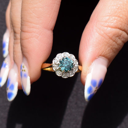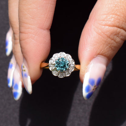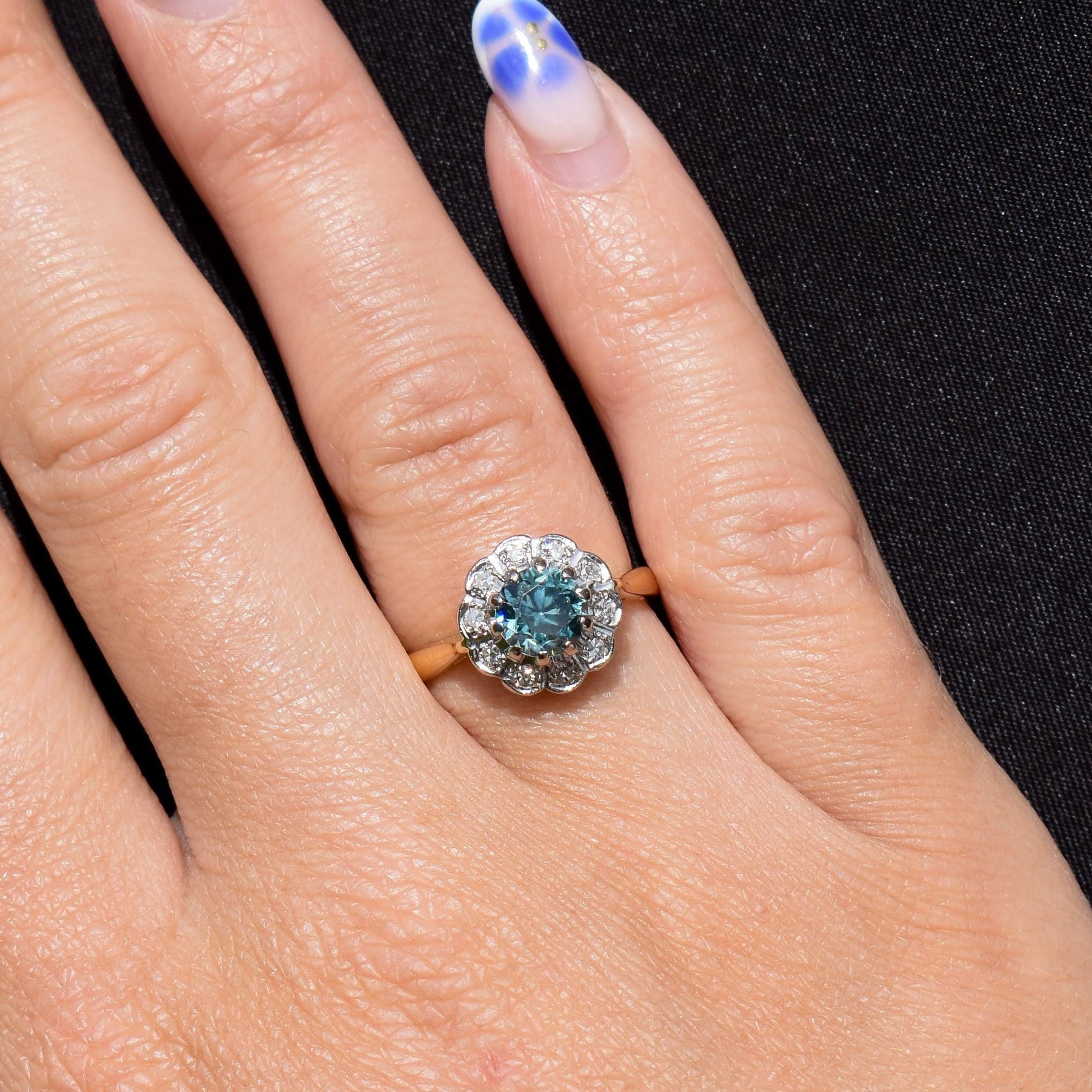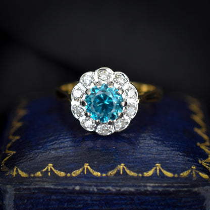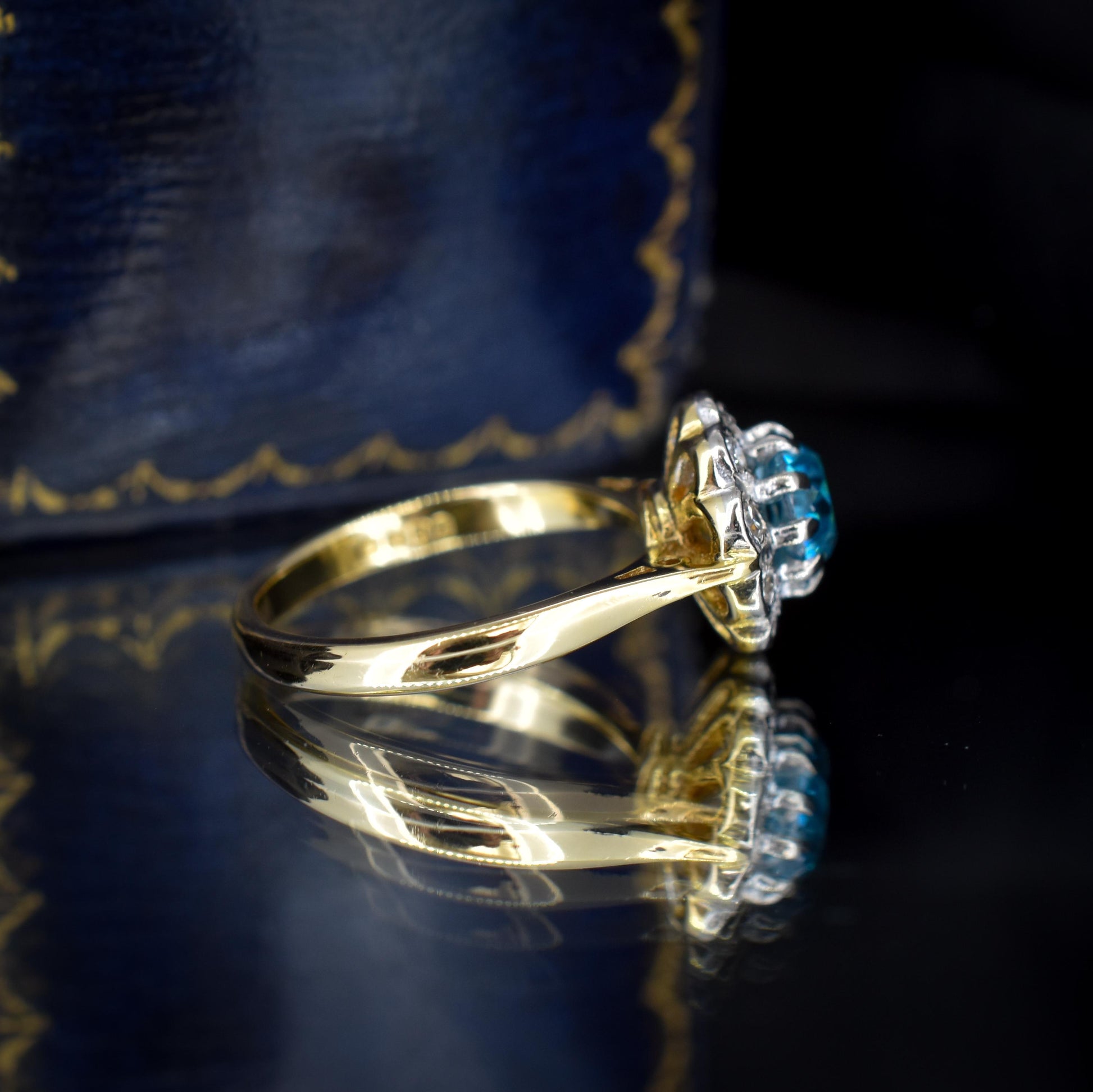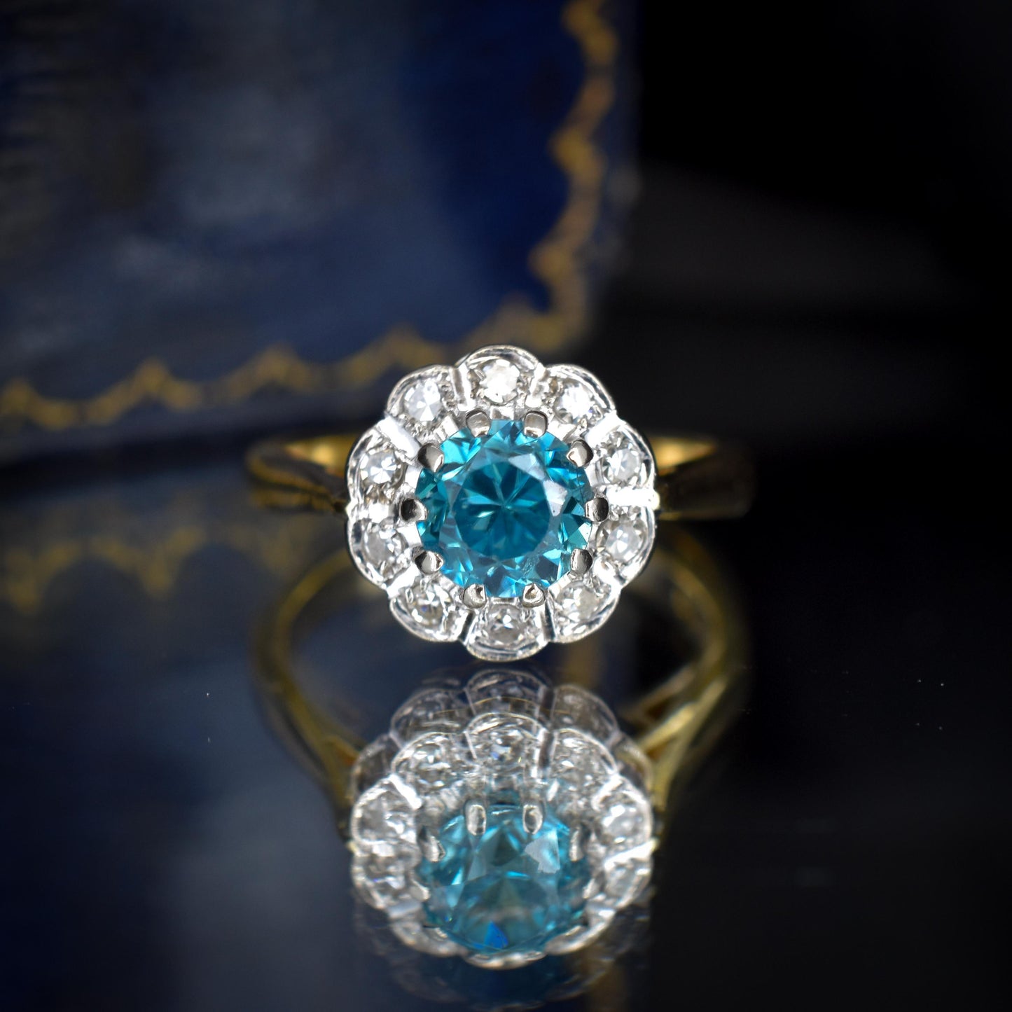 This beautiful vintage ring features a 1.13ct (approximate) round Blue Zircon gemstone that sits proudly above a halo of ten sparkling Diamonds on the outside, modelled on a chunky 18ct yellow gold band.