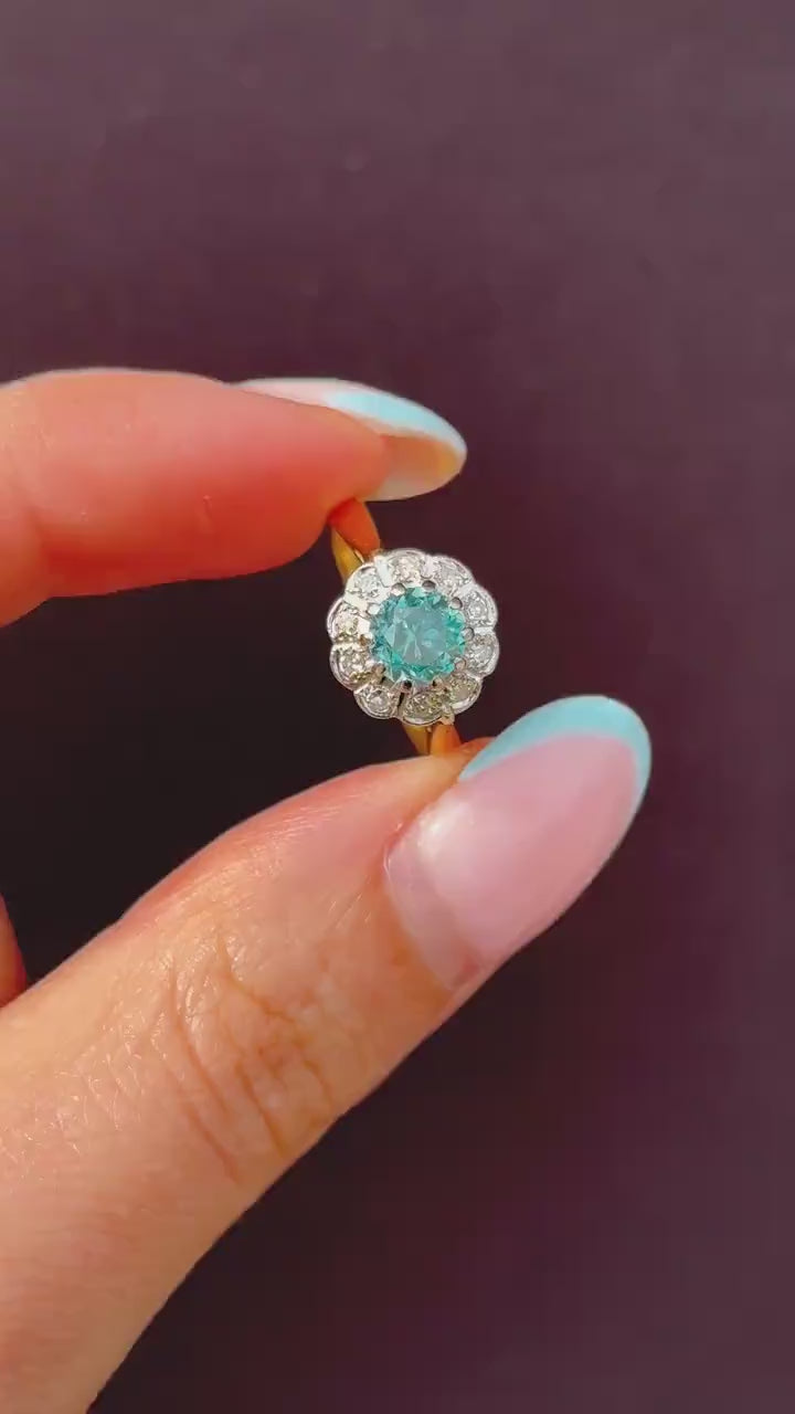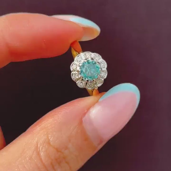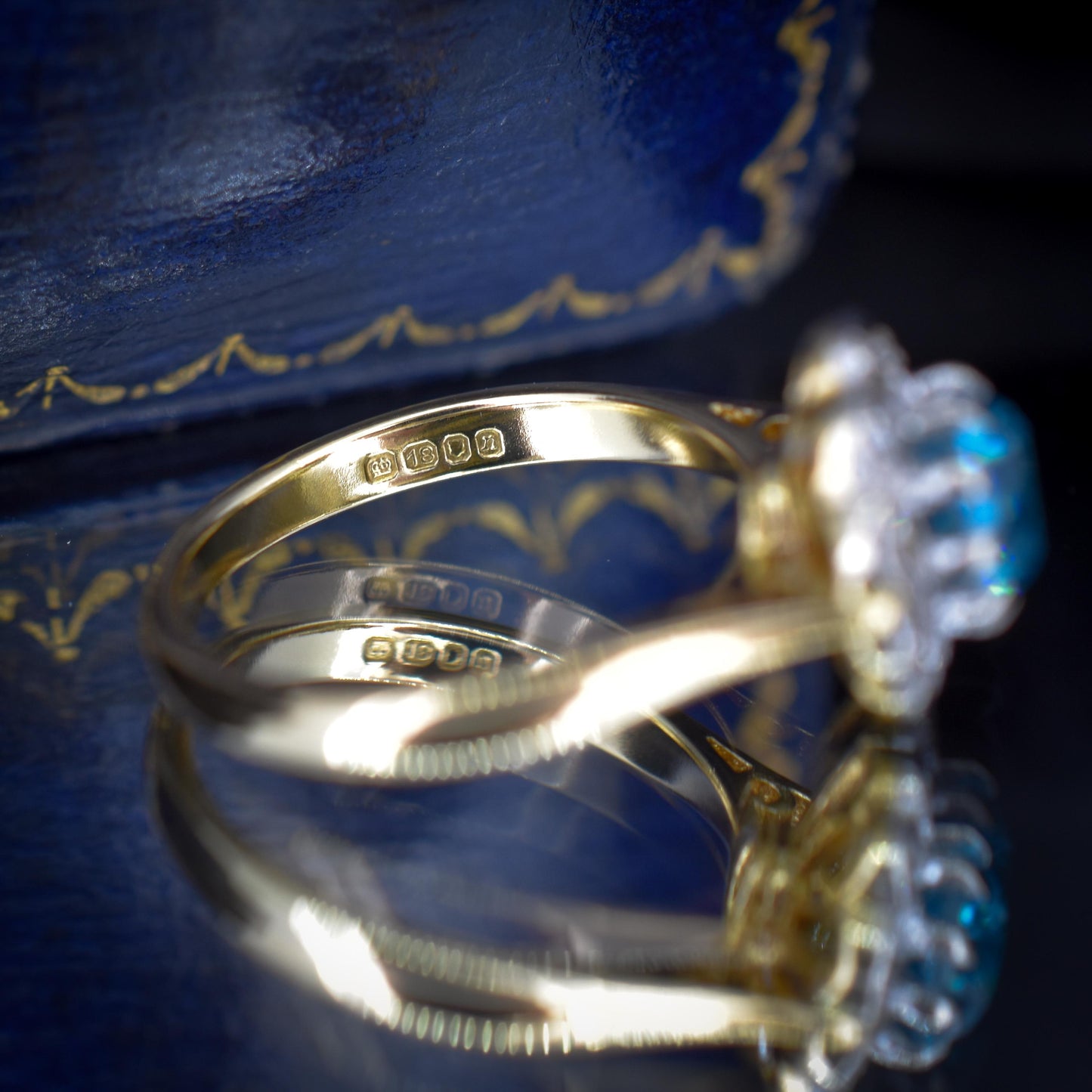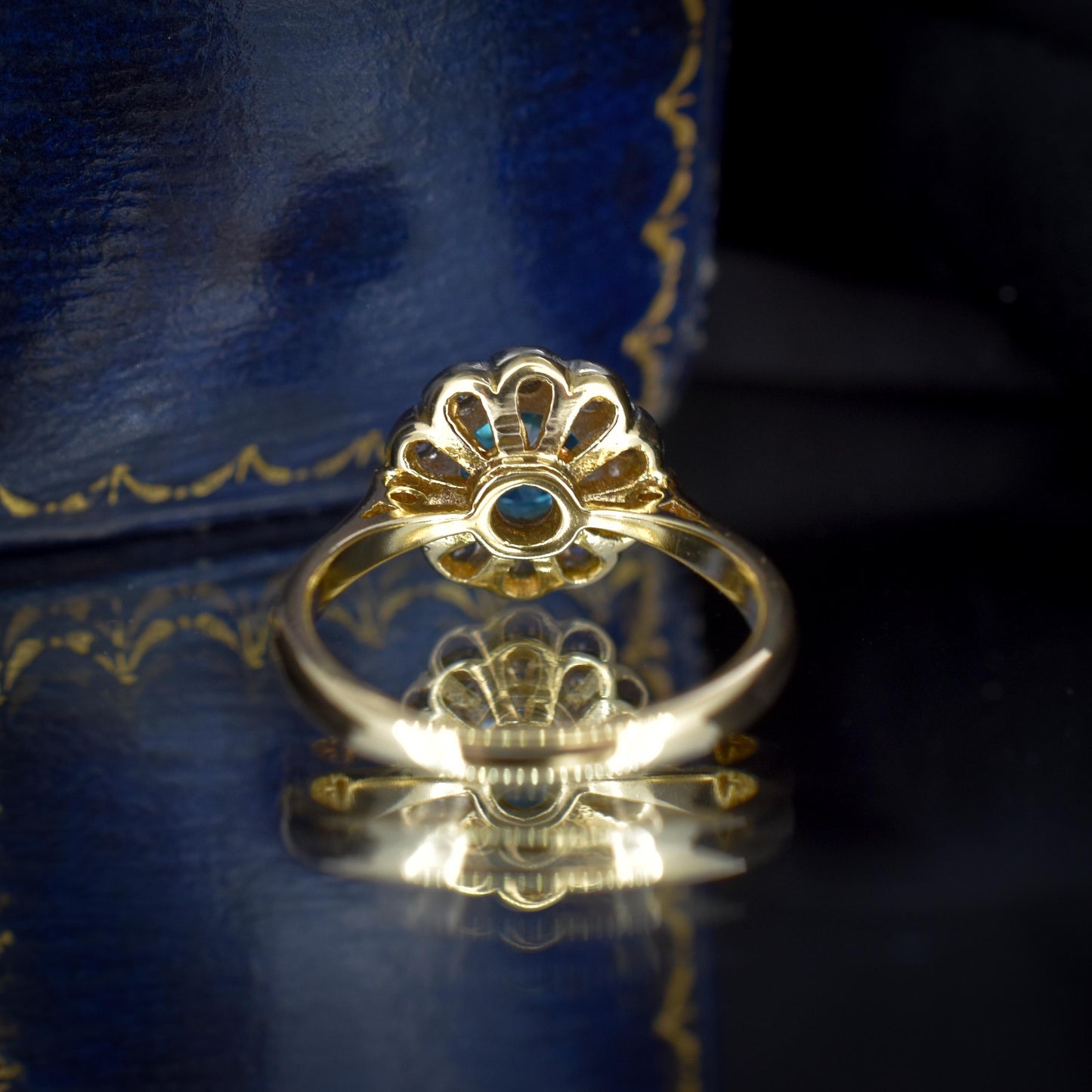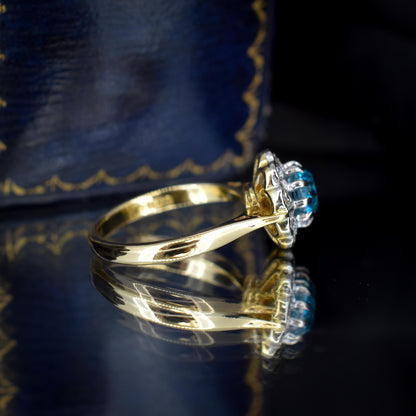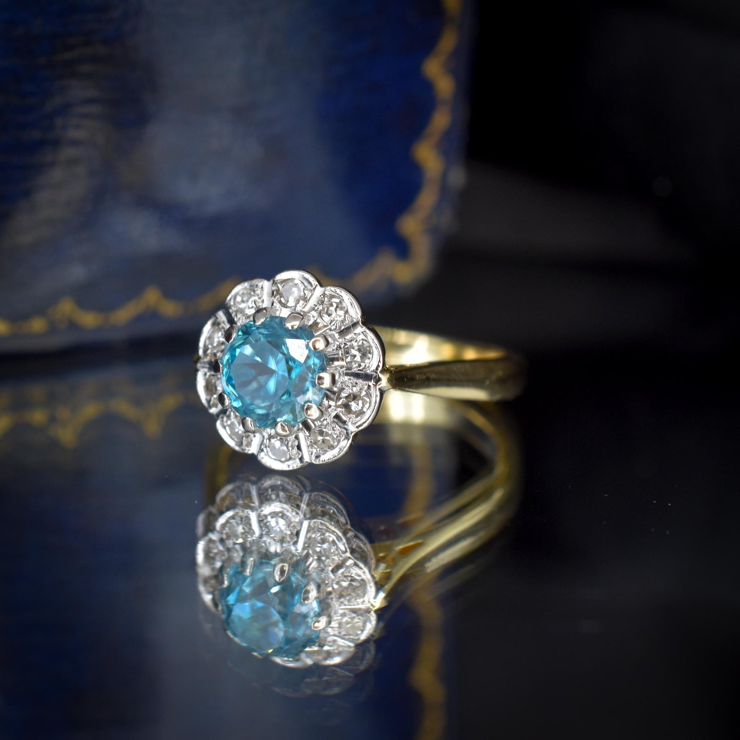 Vintage Round Blue Zircon and Diamond 18ct Yellow Gold Ring | London 1968