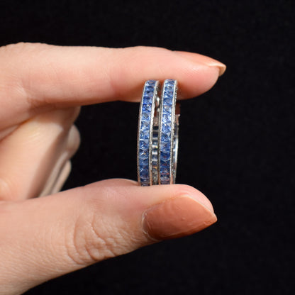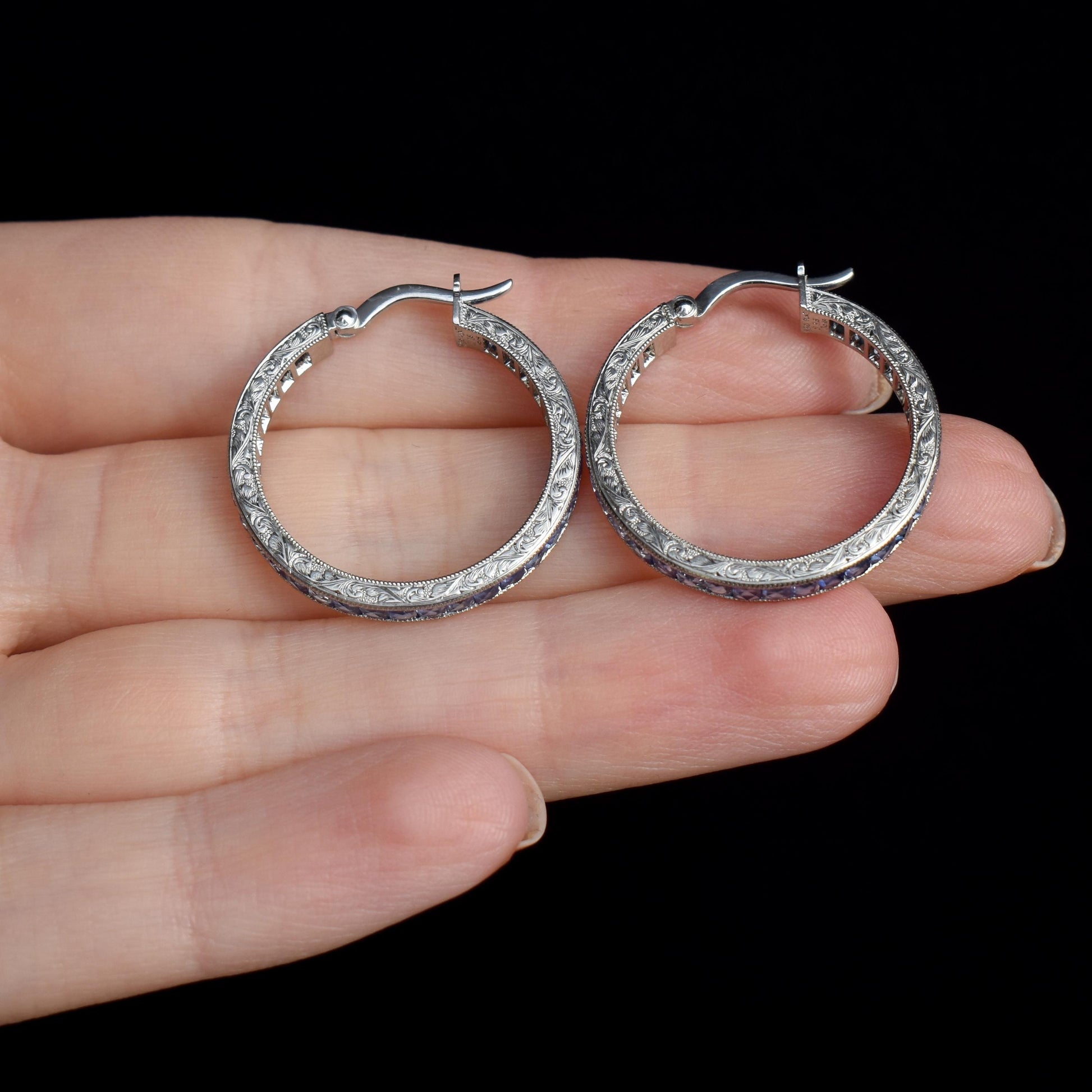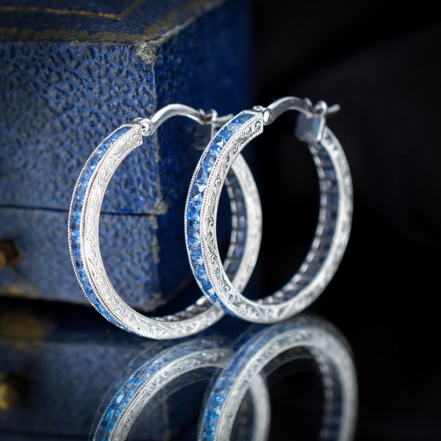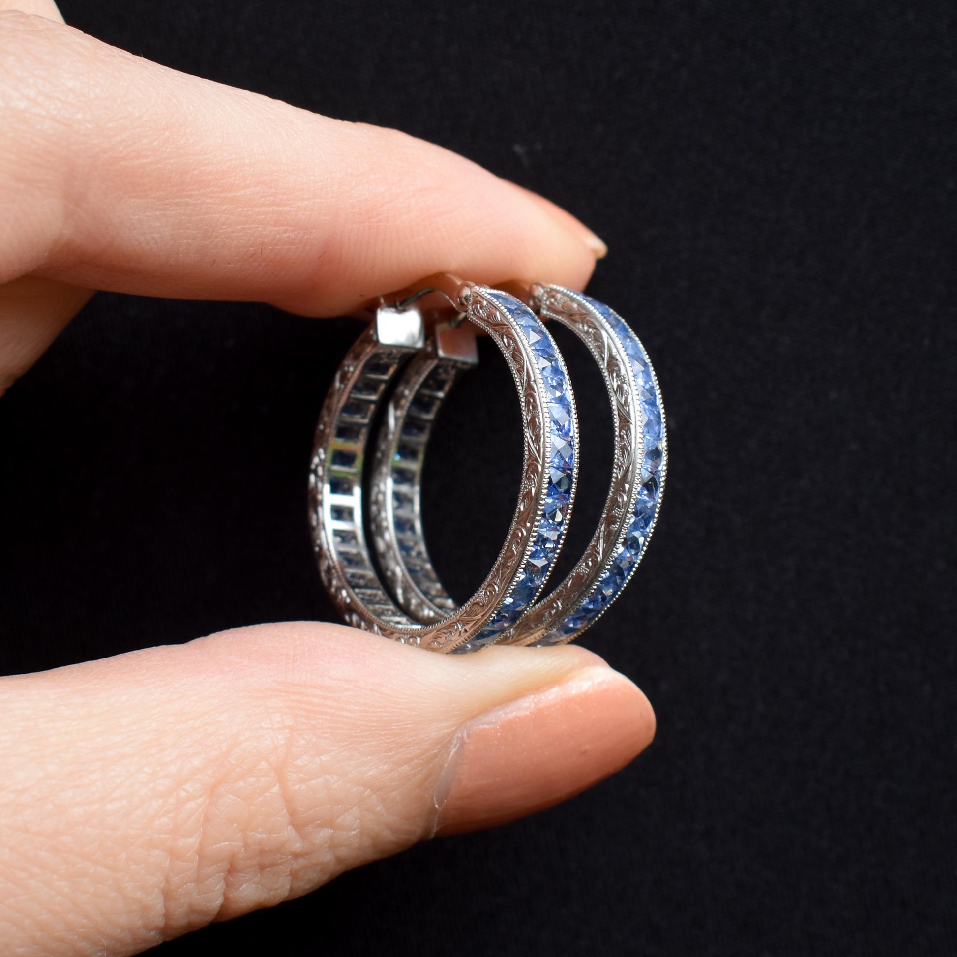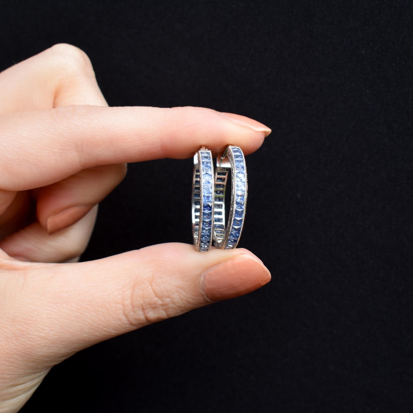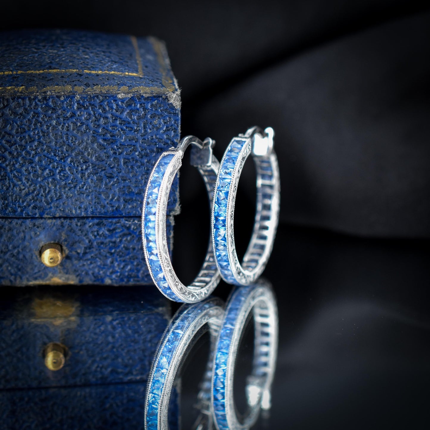 These breathtaking Blue Sapphire hoop earrings each feature 1.8ct of French cut Sapphires set in platinum. Each earring has 30 Sapphire stones set with an open-back gallery. These statement earrings look magnificently worn, with the Sapphire's showing an excellent cornflower blue colour. The hoop earrings are completed with a milgrain and engraved detailing all around the inside and outside.