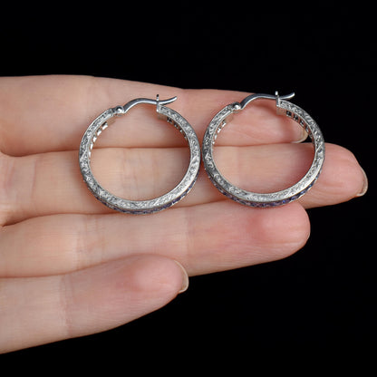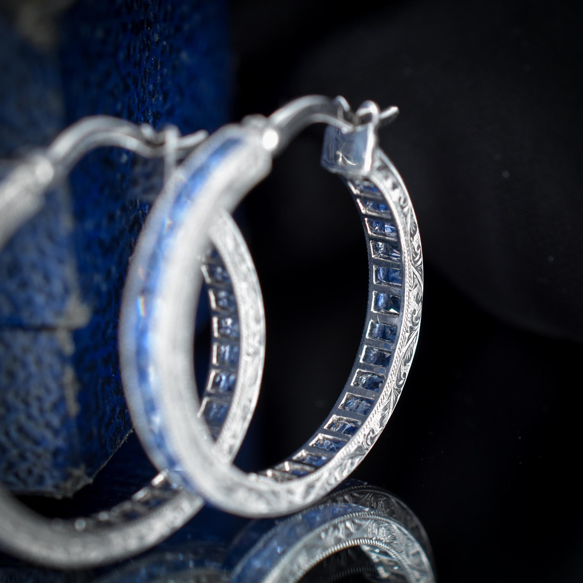 3.6ct Ceylon Blue Sapphire Hoop Engraved Platinum Earrings