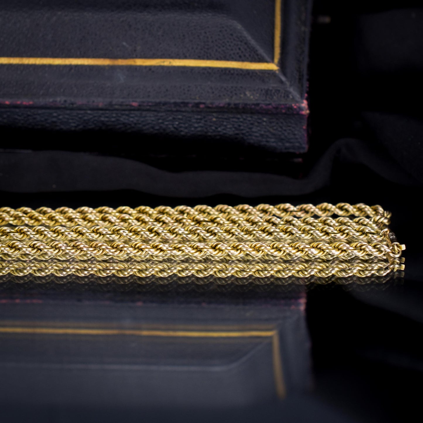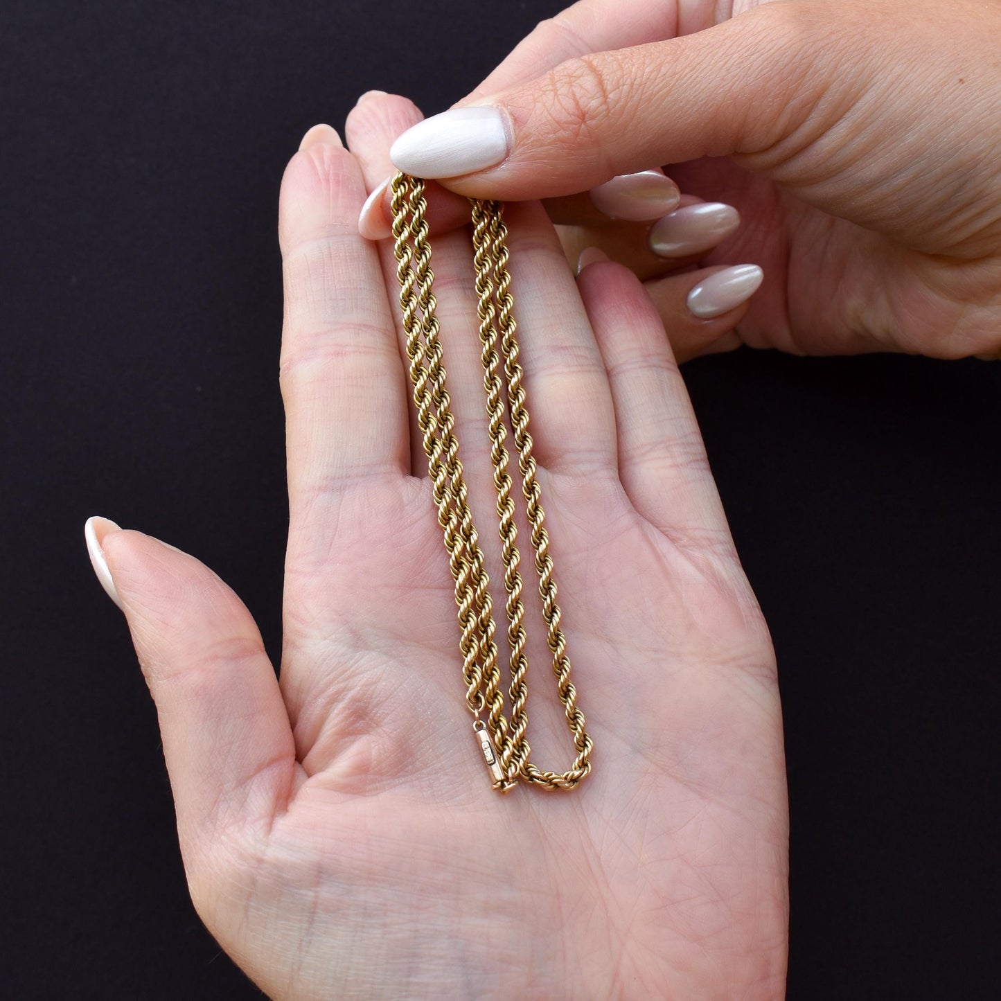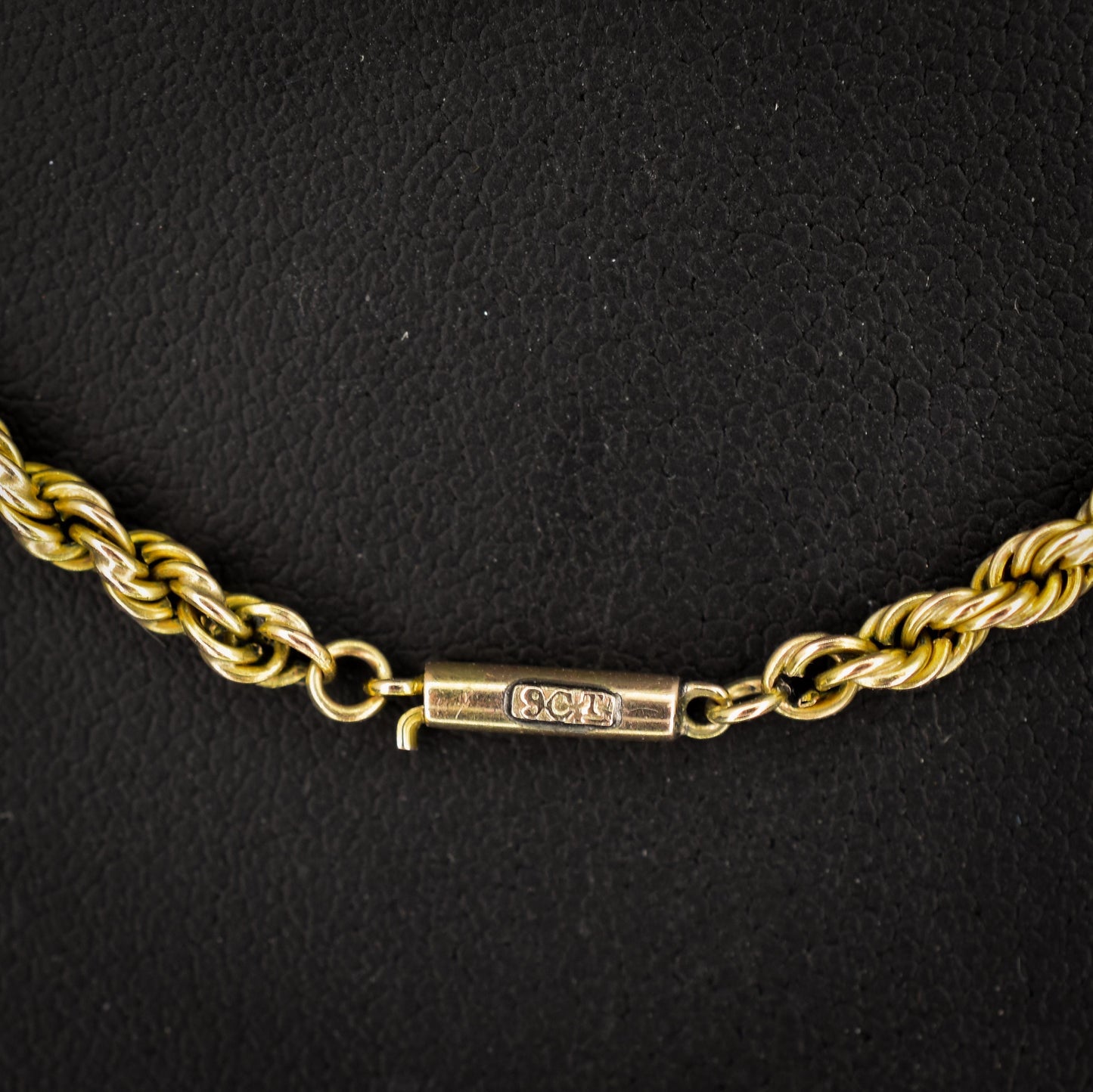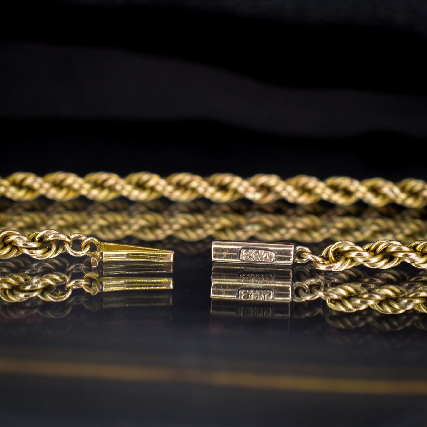 This quality Antique chain is modelled in bright 9ct yellow Gold, with a barrel clasp fastening. The chain features lovely rope twist links, and the gold is bright, giving off a pretty shine whilst worn.