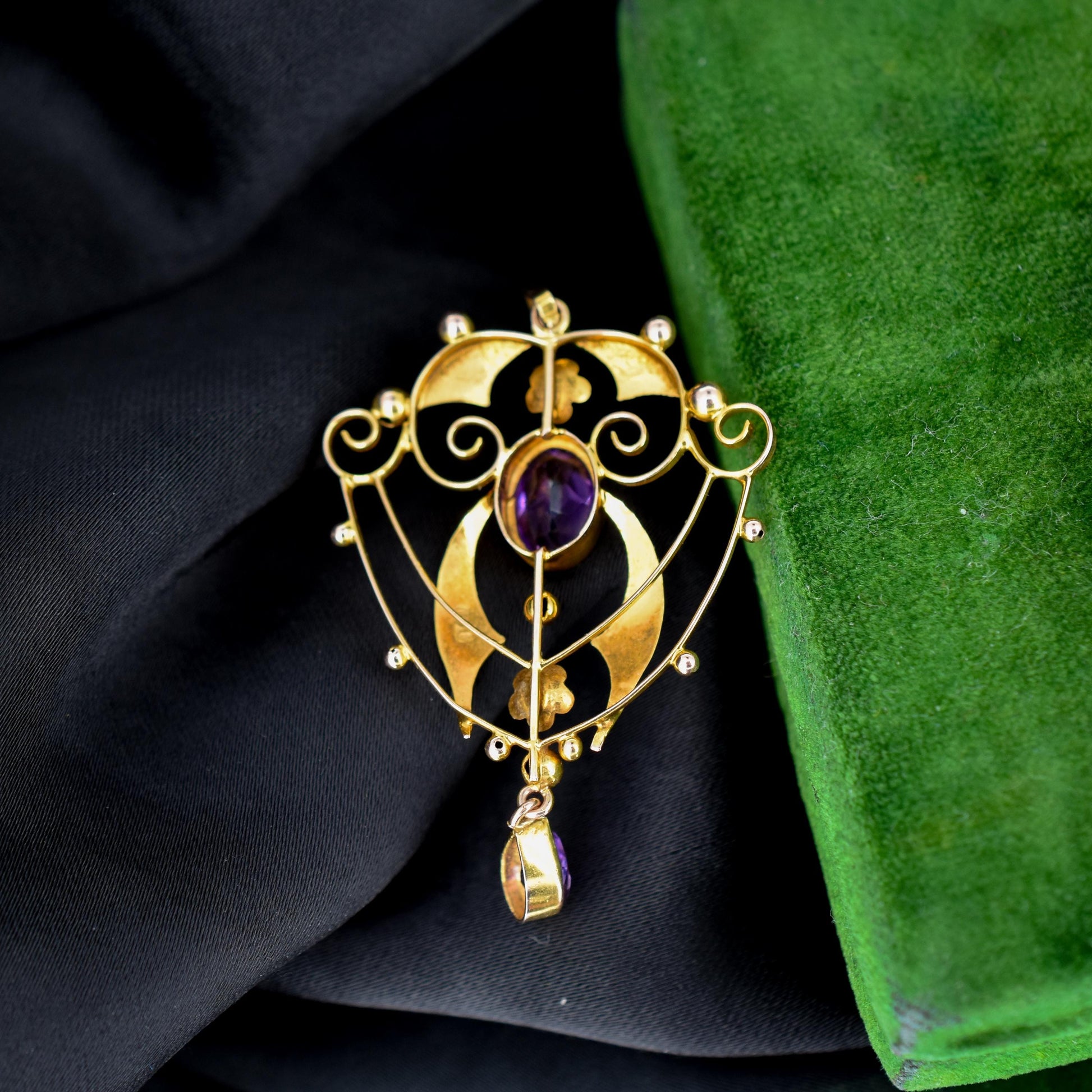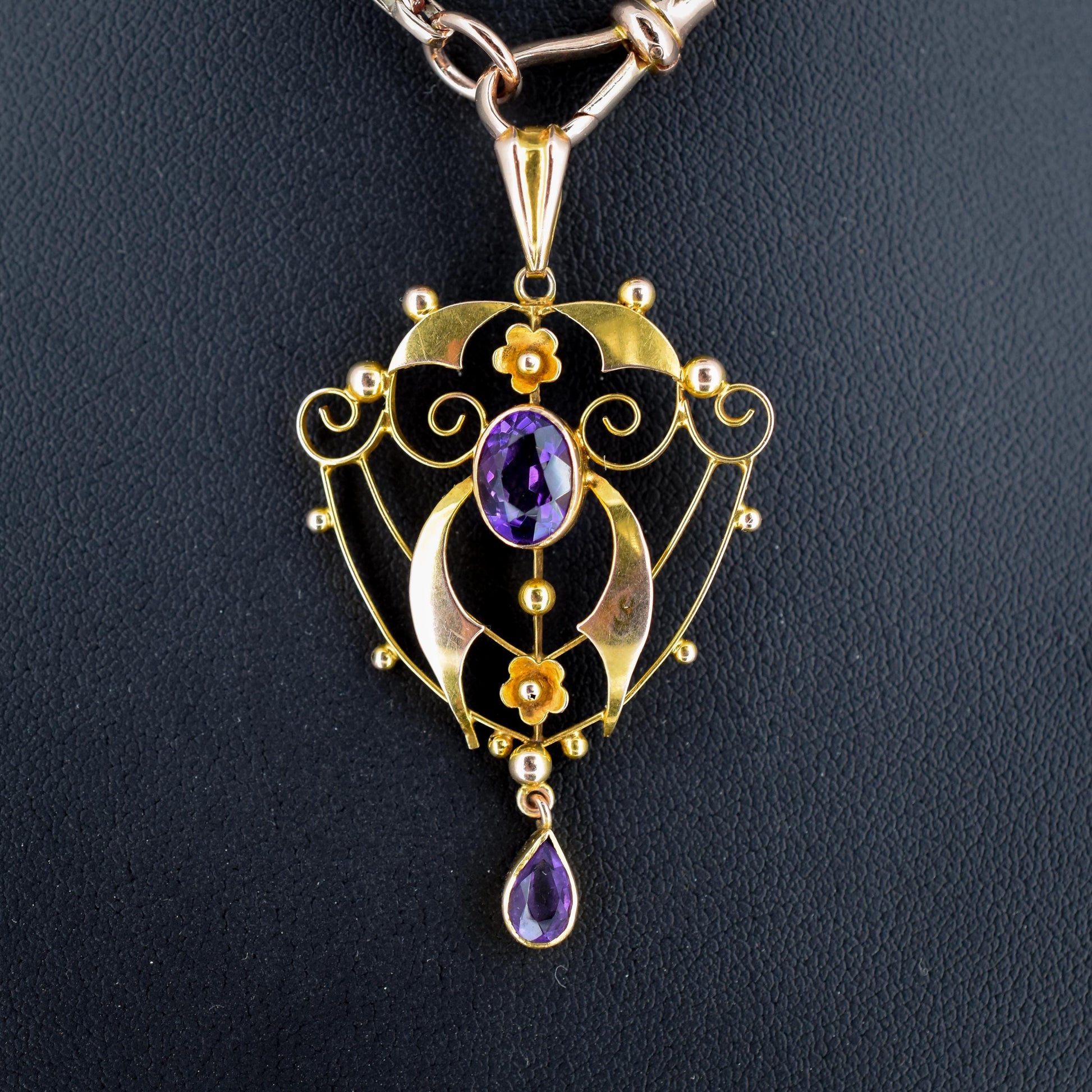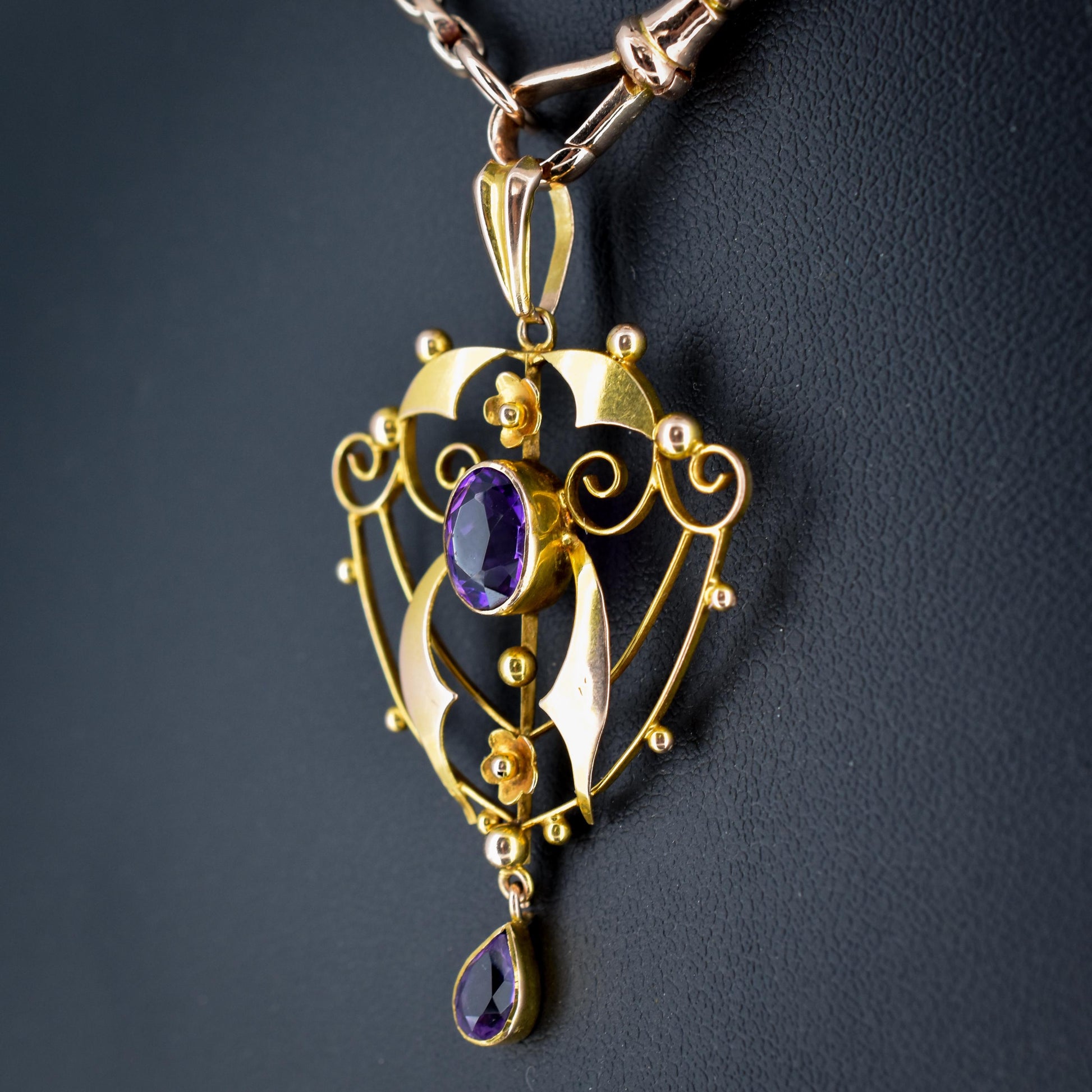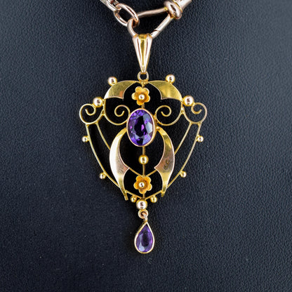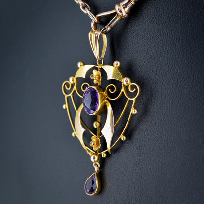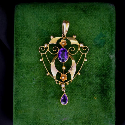 This beautiful antique Edwardian pendant dates from the early 20th Century and is made in the Art Nouveau style with delicate curves and floral motifs in 9ct yellow gold. The pendant is decorated with two large amethysts featuring wrap-around bezel settings.