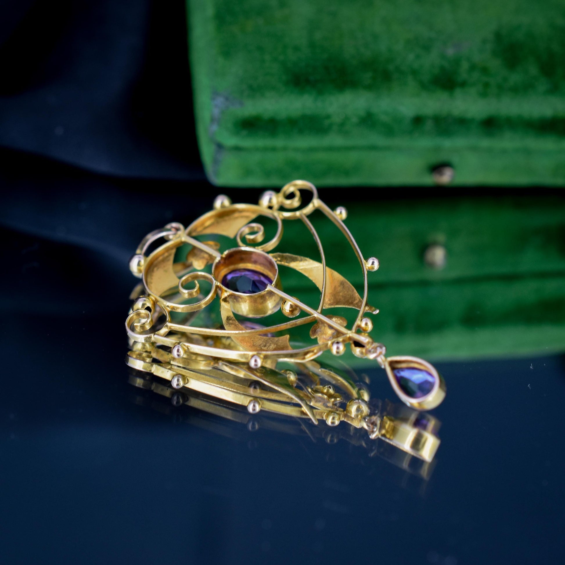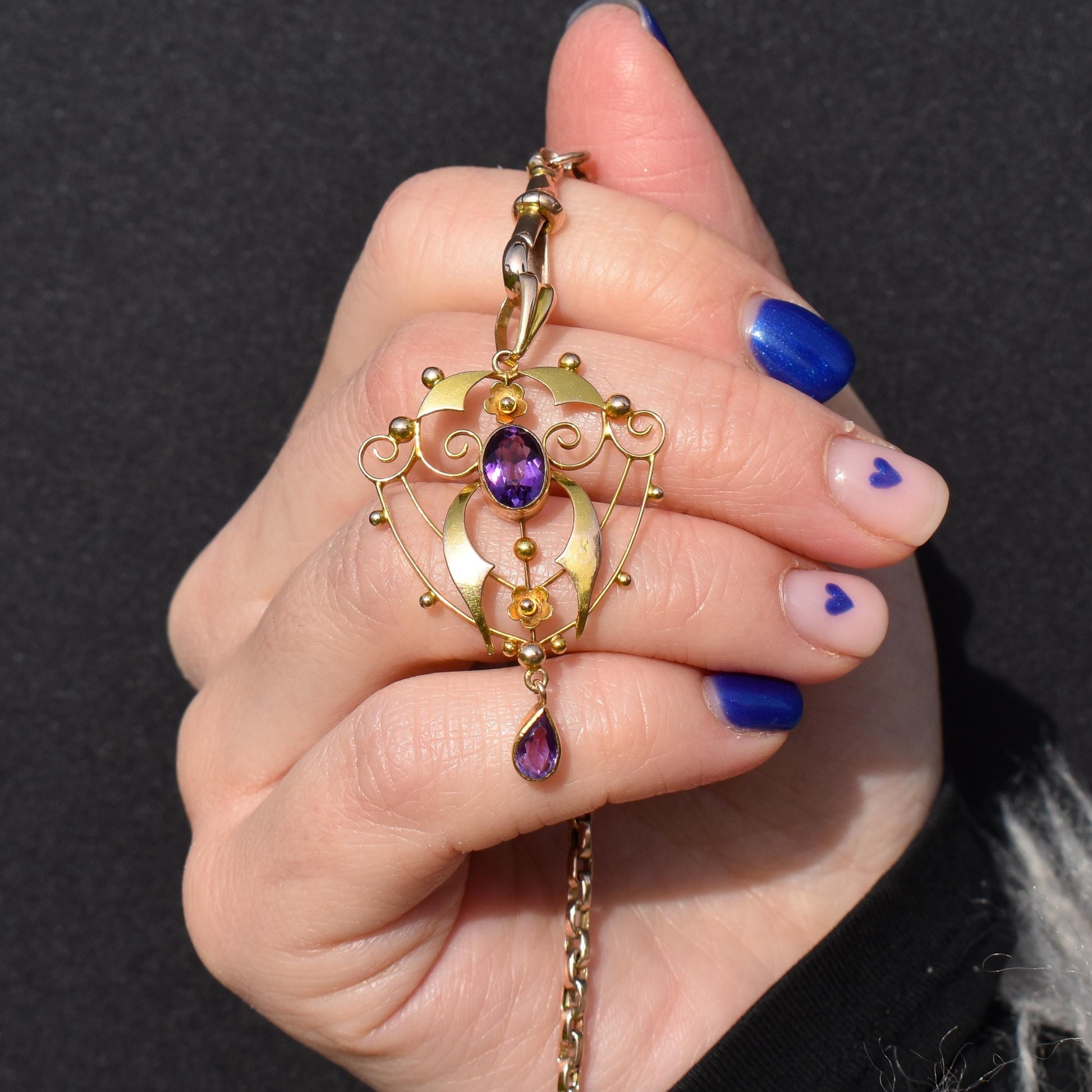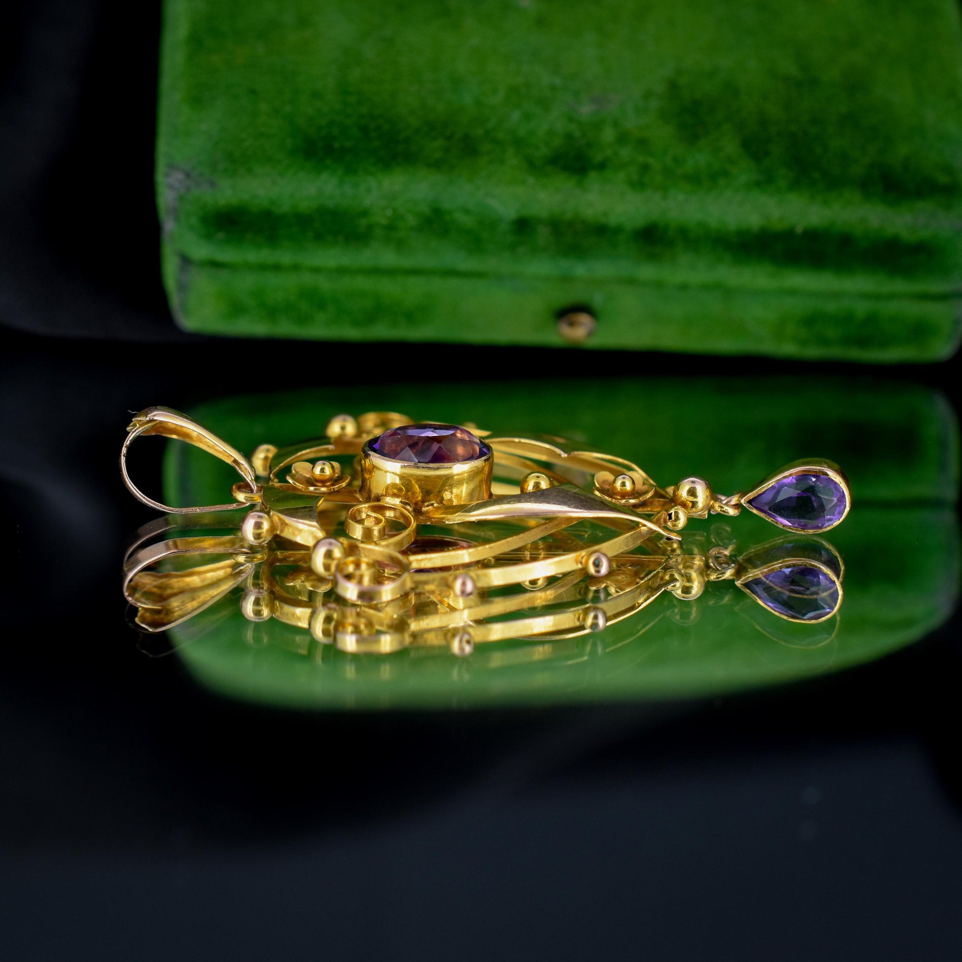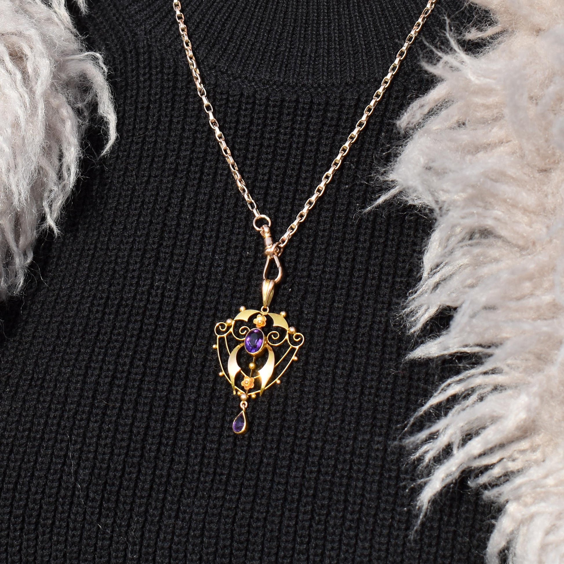 This beautiful antique Edwardian pendant dates from the early 20th Century and is made in the Art Nouveau style with delicate curves and floral motifs in 9ct yellow gold. The pendant is decorated with two large amethysts featuring wrap-around bezel settings.