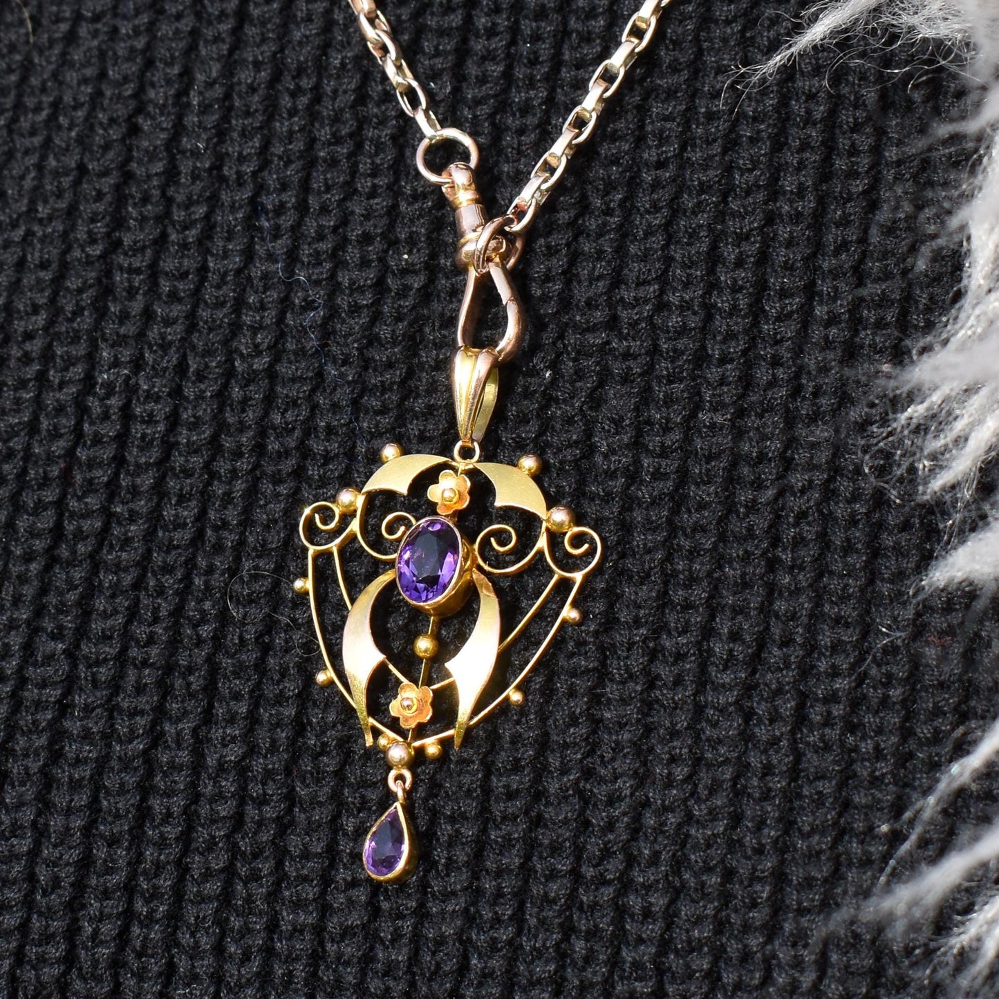 This beautiful Amethyst pendant remains in excellent condition. The stones are secure, and there isn't any damage to the pendant itself. This would make a great addition to your Antique jewellery collection.
