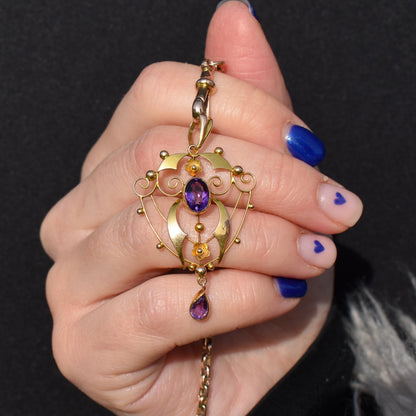 Antique Edwardian Amethyst Lavalier 9ct Yellow Gold Pendant