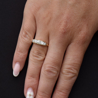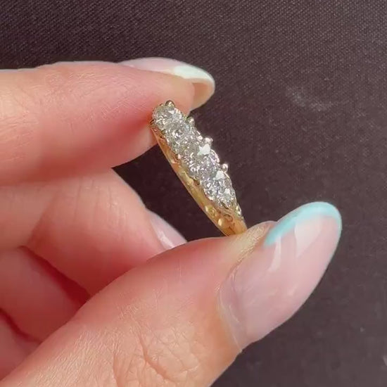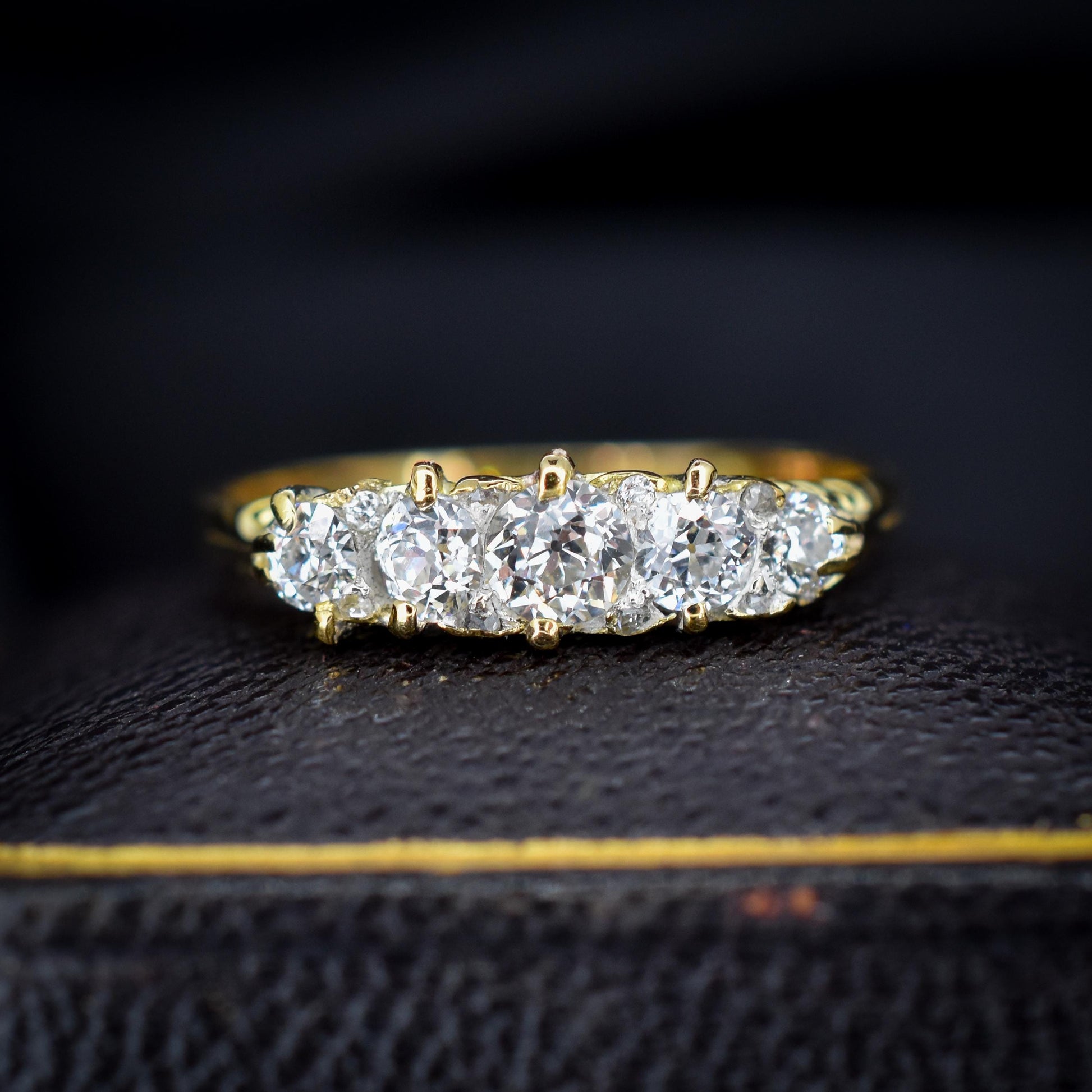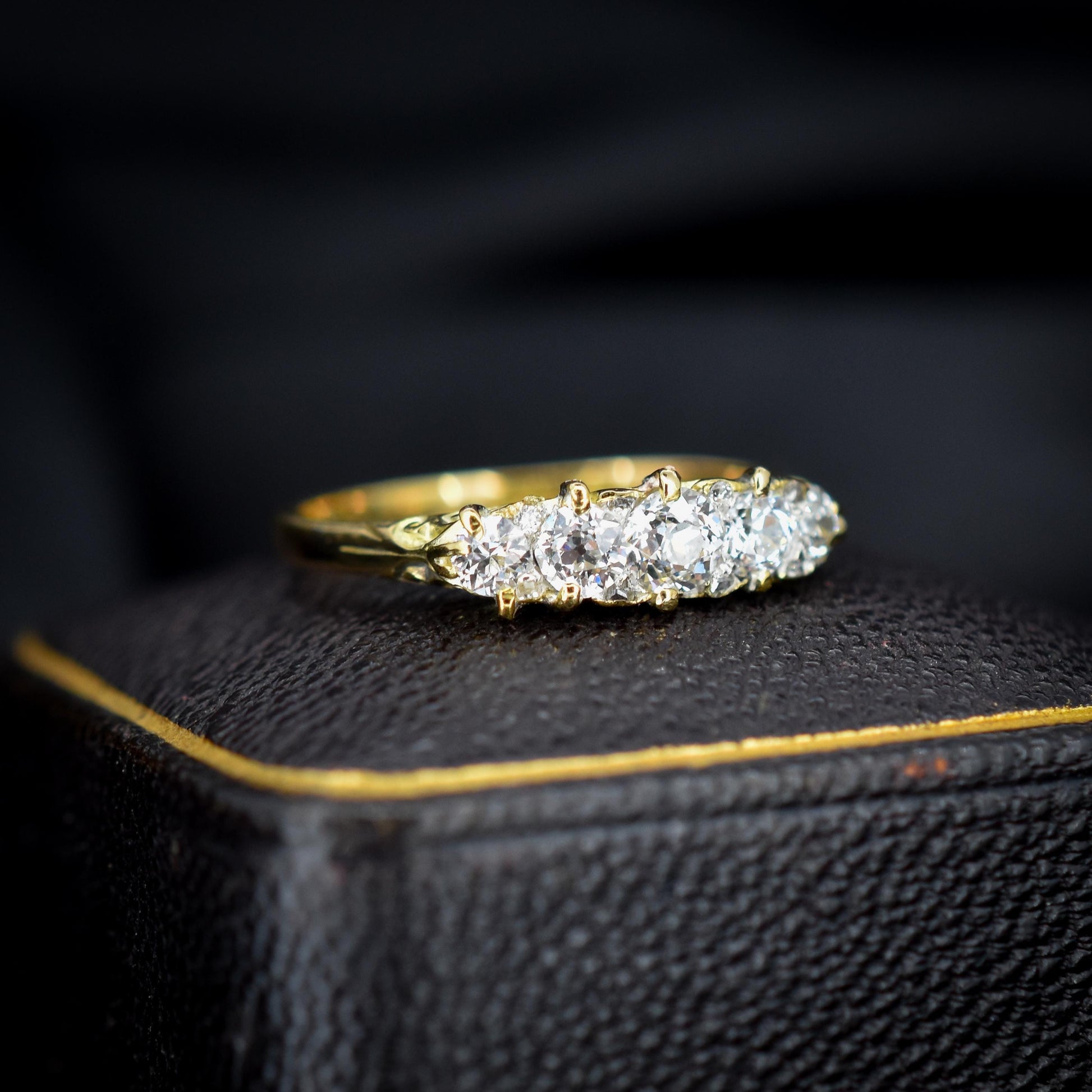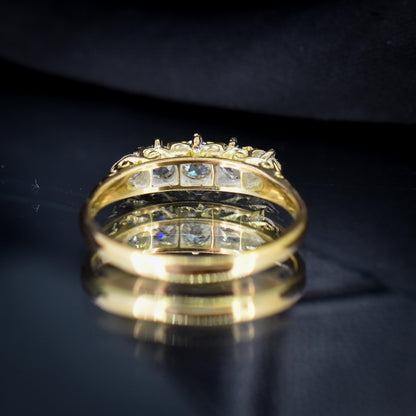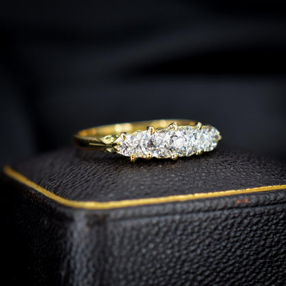 This stunning Antique Victorian Diamond ring features five quality Old Cut Diamonds, modelled in an 18ct Yellow Gold scroll gallery.