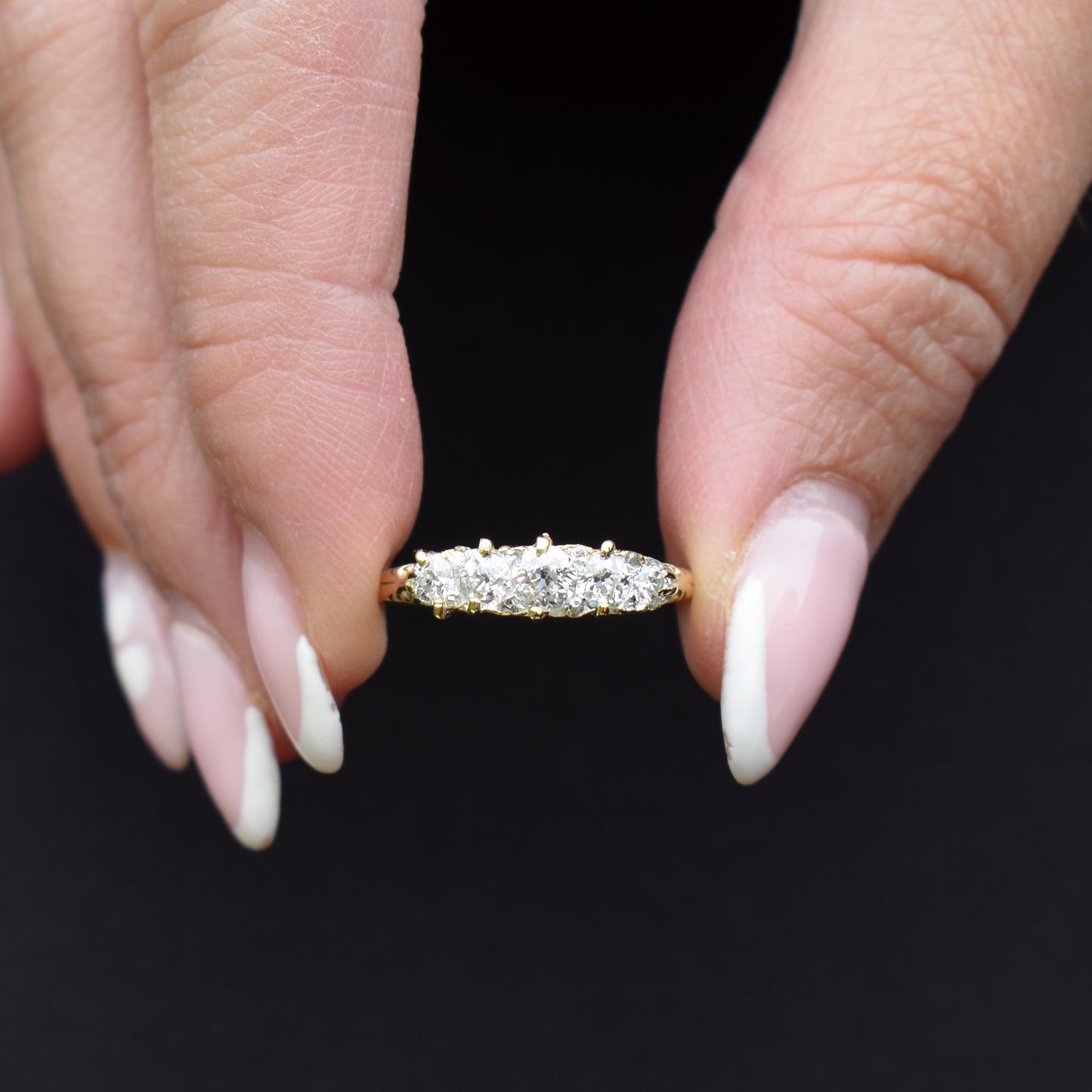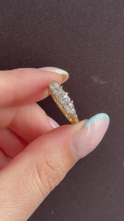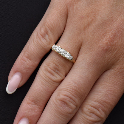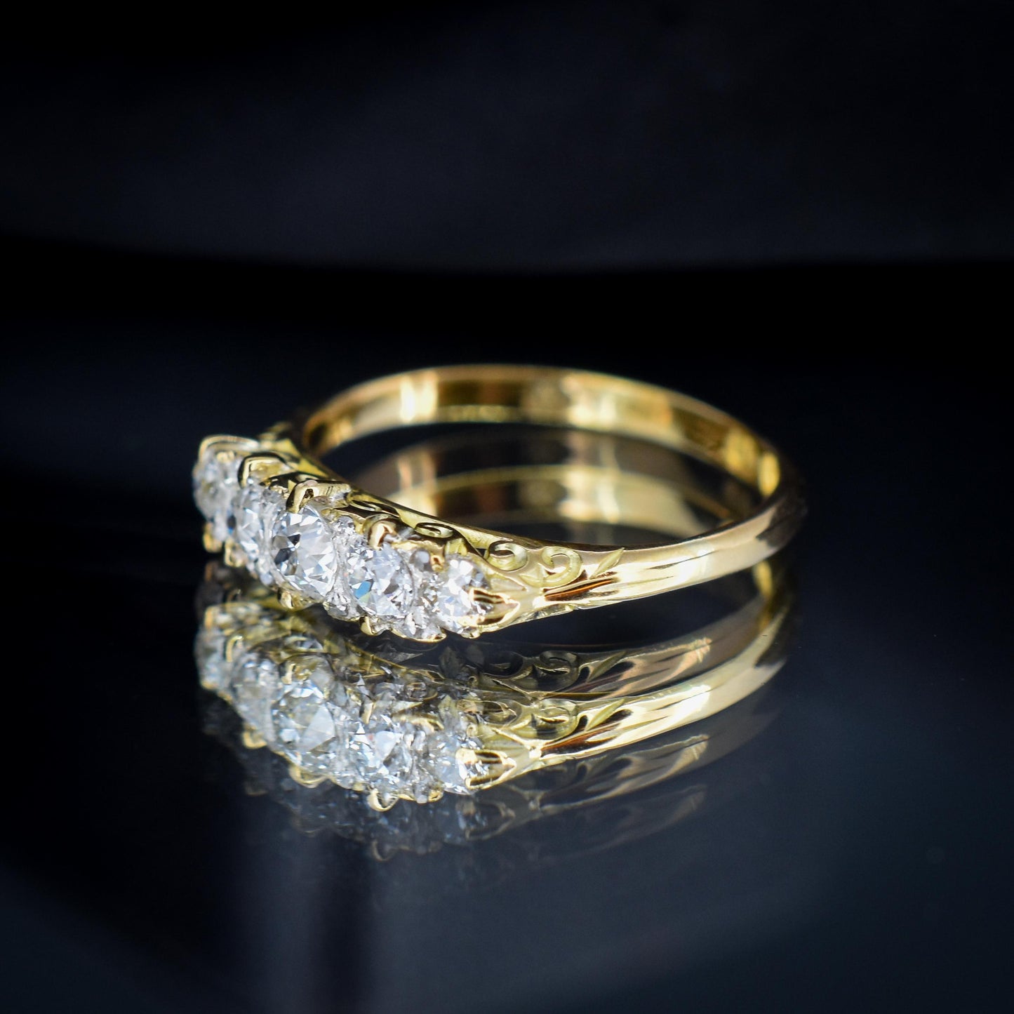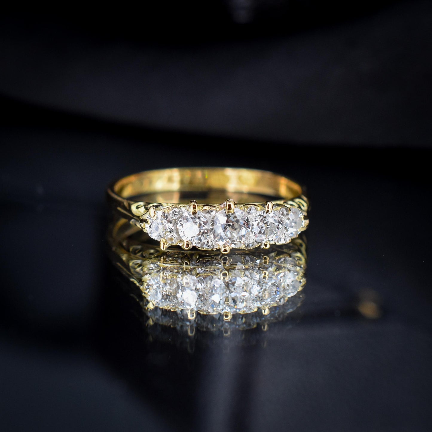 This stunning Antique Victorian Diamond ring features five quality Old Cut Diamonds, modelled in an 18ct Yellow Gold scroll gallery.