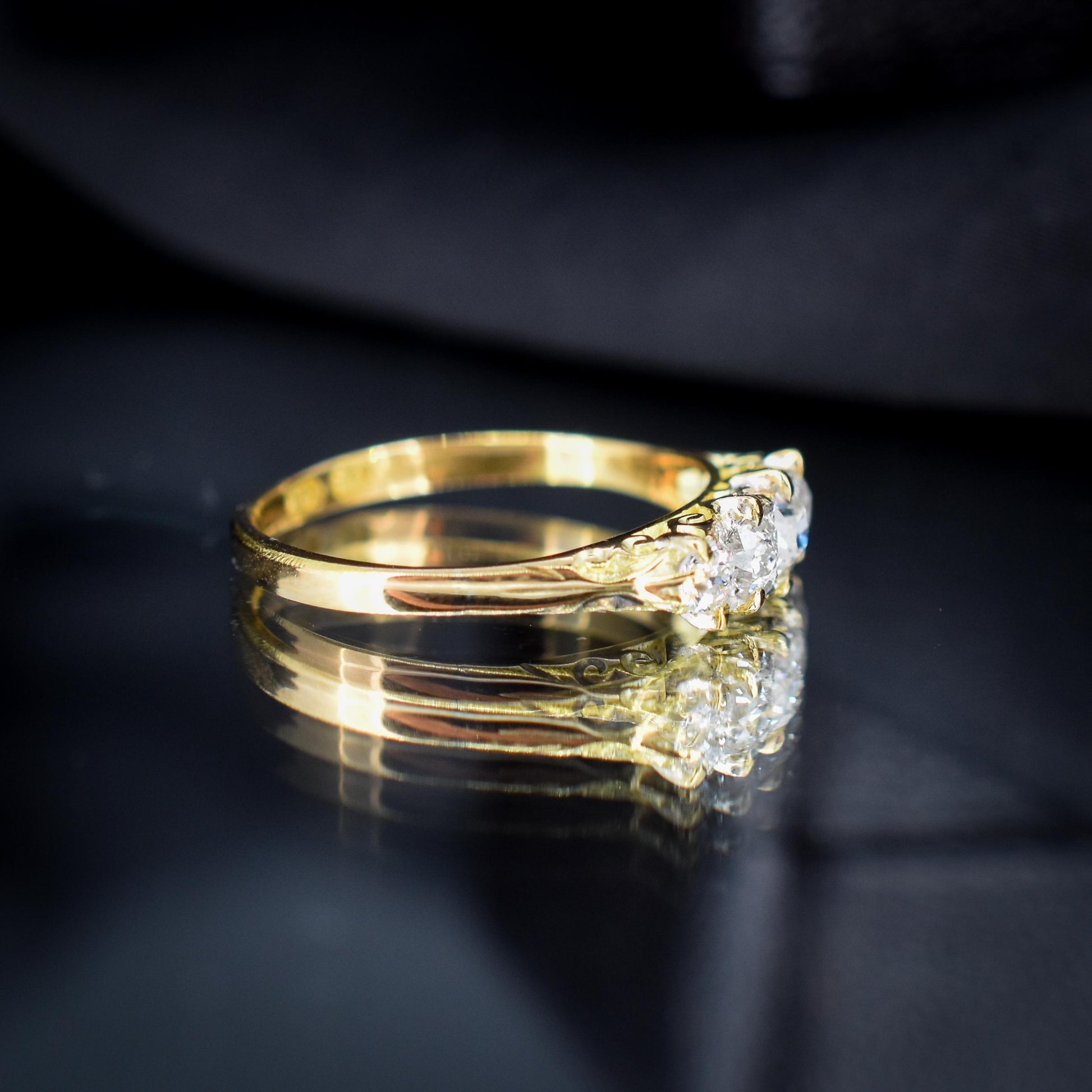 The gold band features beautiful scrollwork around the shoulders of the ring, which was very popular during the late Victorian period.