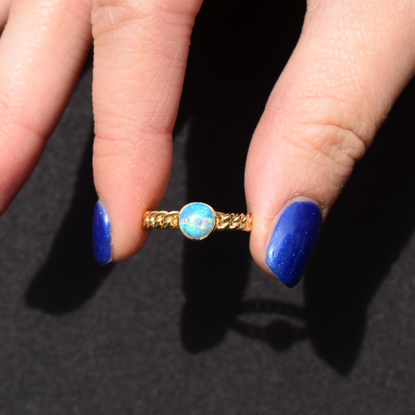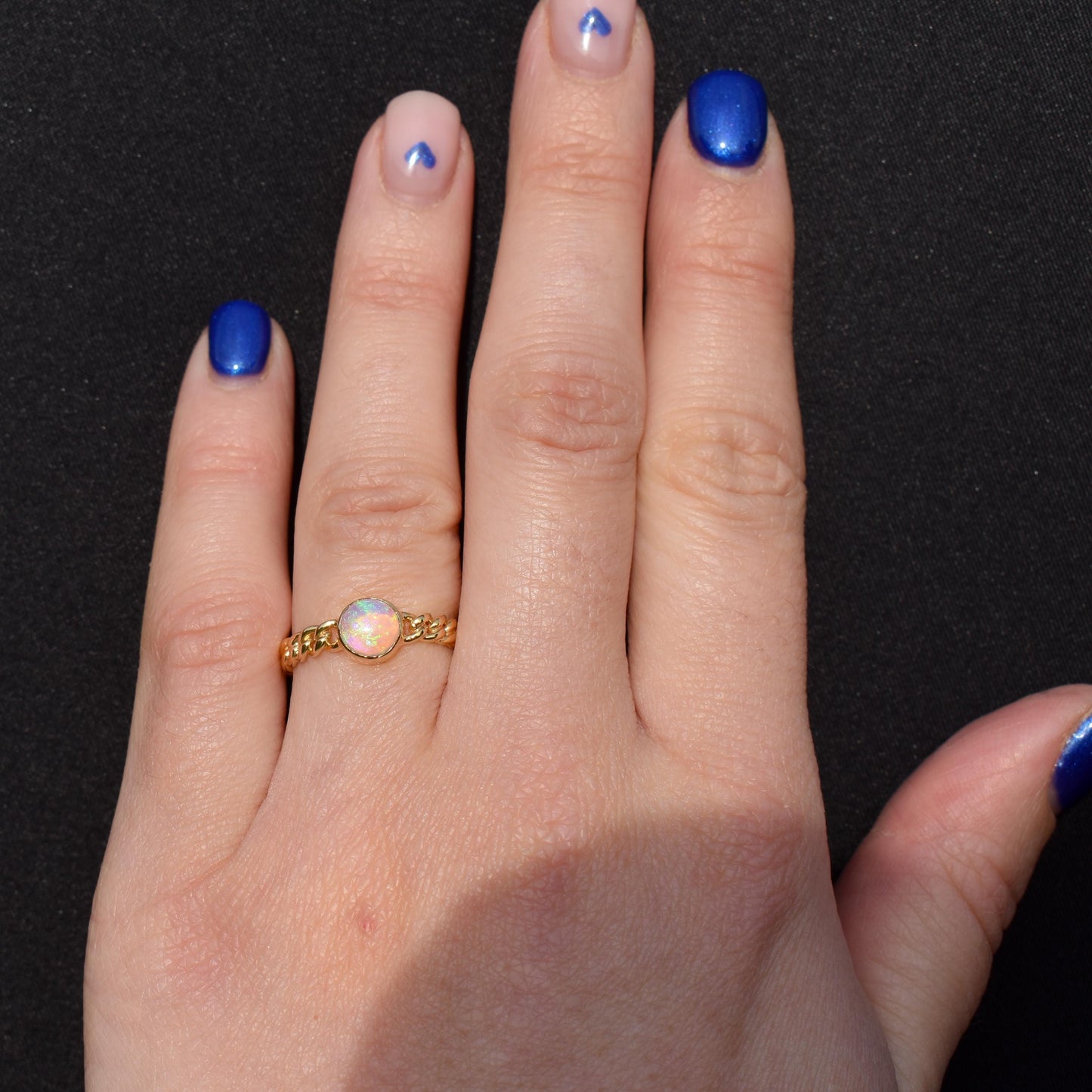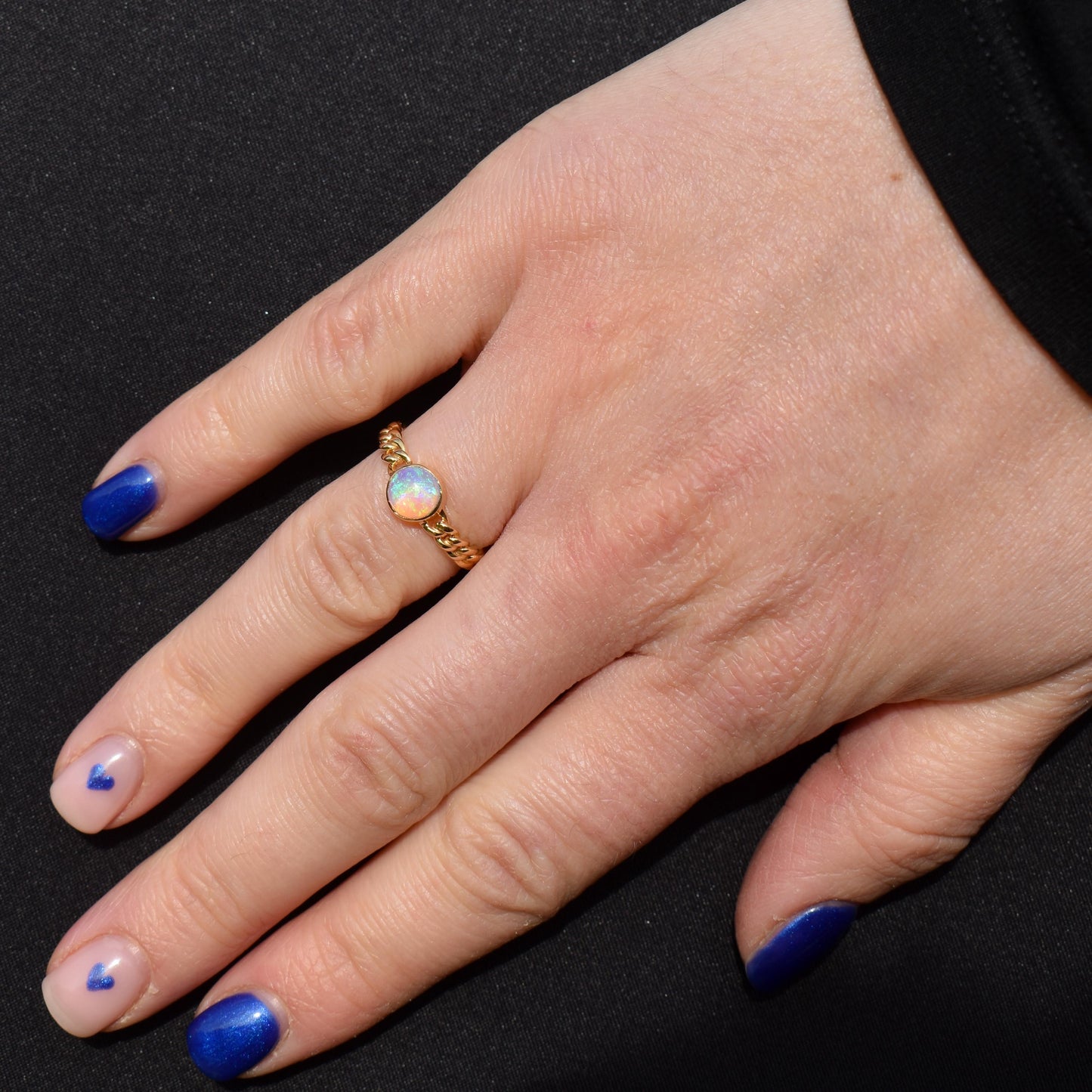 This antique opal chain link ring is in excellent condition. The gold has a lovely bright tone, and it is the perfect ring if you're looking for a unique everyday gold band to wear. The bezel set Opal is secure, allowing you to wear it confidently, and it has no signs of any damage. Please note, as mentioned above, this ring cannot be resized.