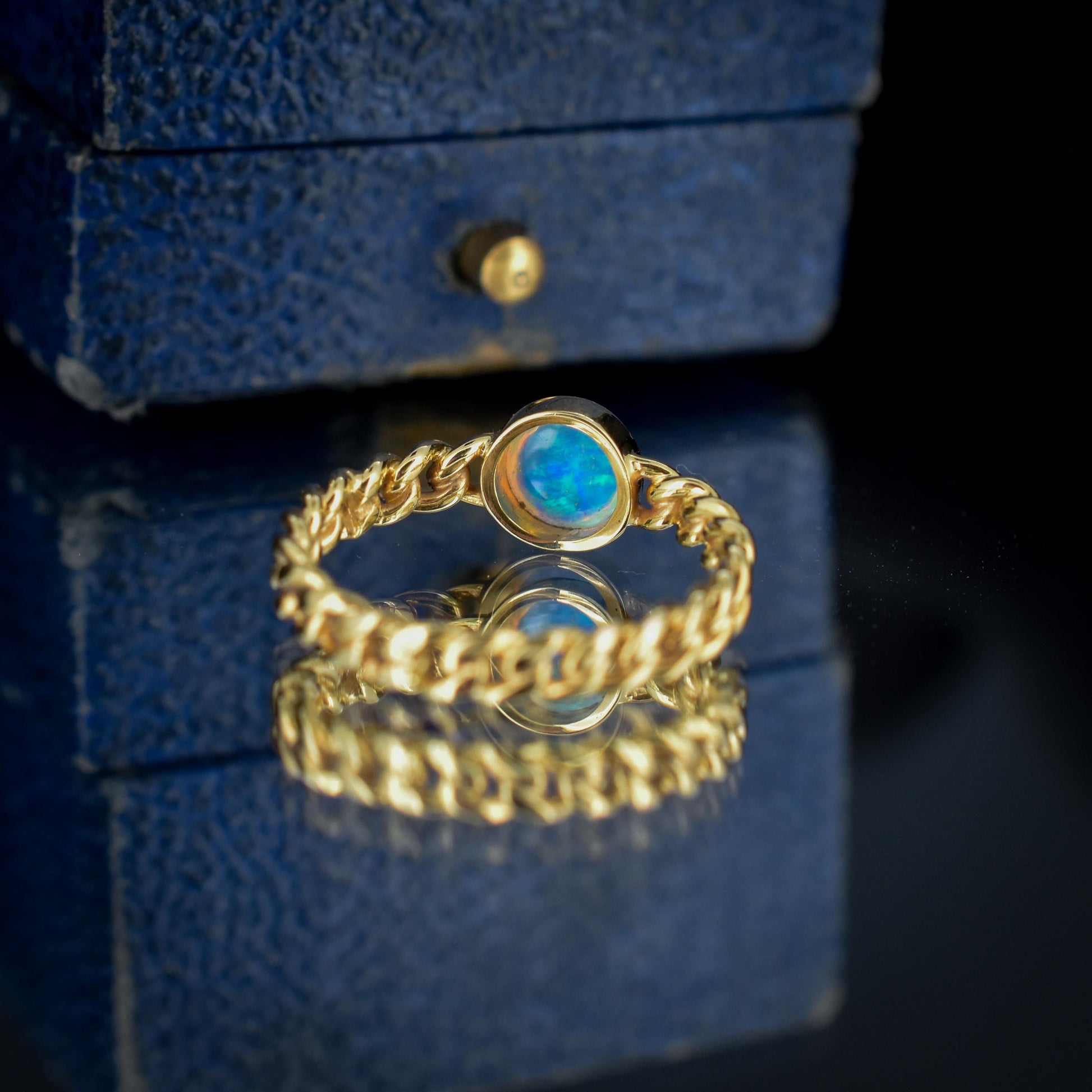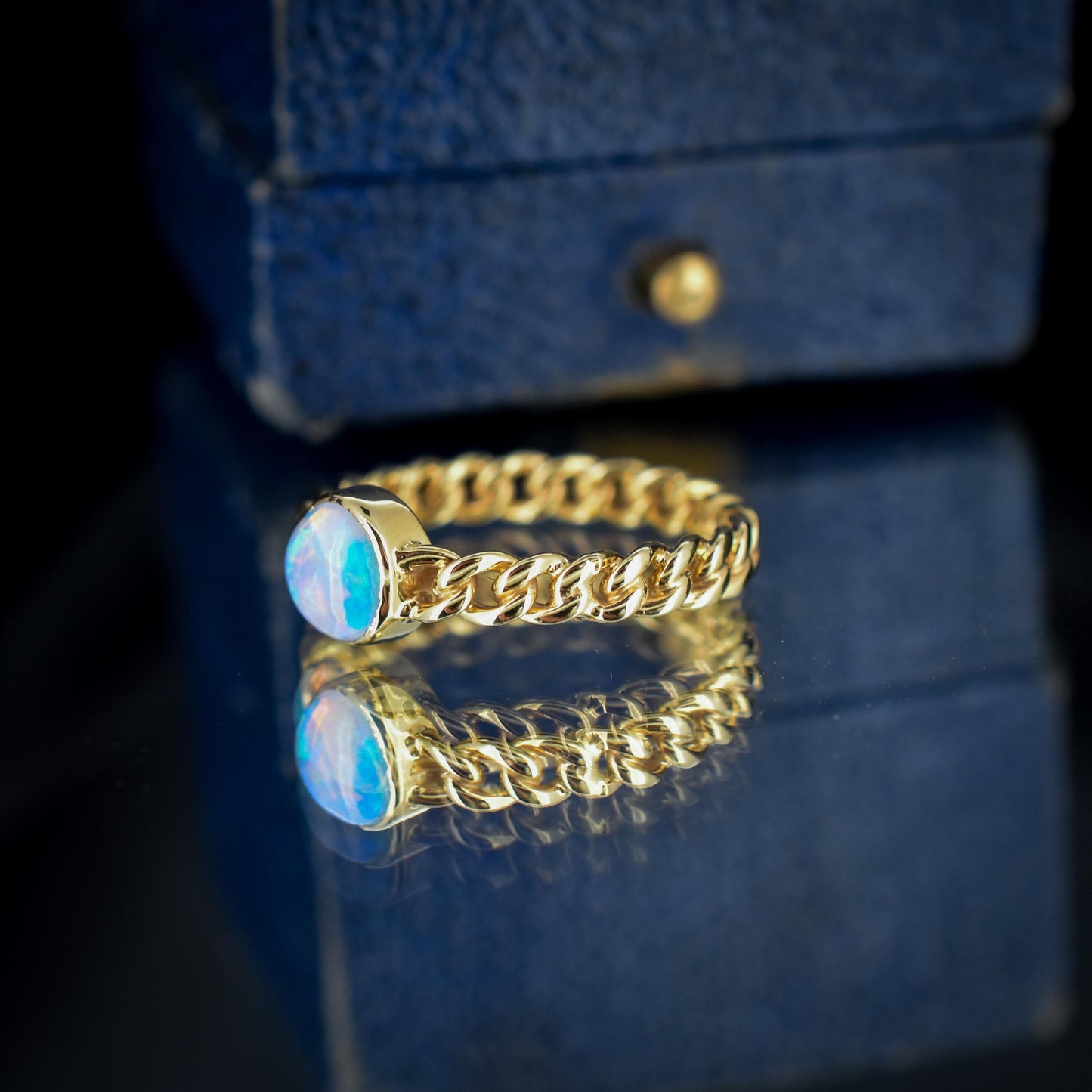 We love this unusual antique opal chain ring! Curb links are usually known for their use in chain necklaces, so why not complete your look with a ring?! Crafted from vibrant 15ct yellow gold, it features a breathtaking round Opal showcasing lovely colours, fire and life. Each link continues beautifully into the next, creating a lovely flowing look that elegantly wraps around your finger.