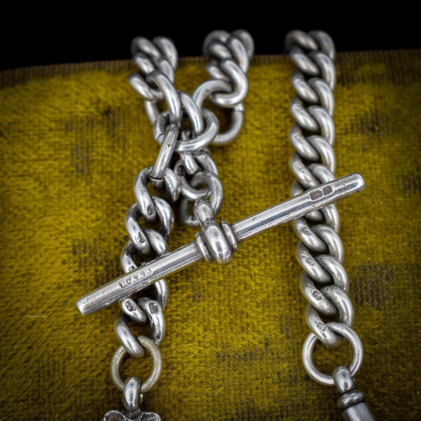This antique silver Albert watch chain remains in good condition. The links show light surface wear and a typical antique patina, each bearing the lion mark. The dog clips are in great working order. The t-bar is in good condition with some slight surface marks. Finally, the medal is in good condition, too, with some light surface scratches but not noticeable when worn. This is an excellent antique watch chain, and it would make a superb addition to your antique collection.