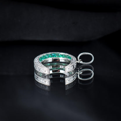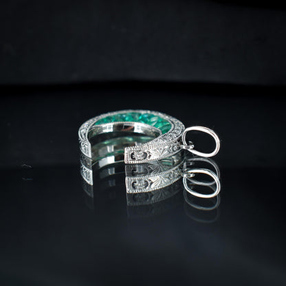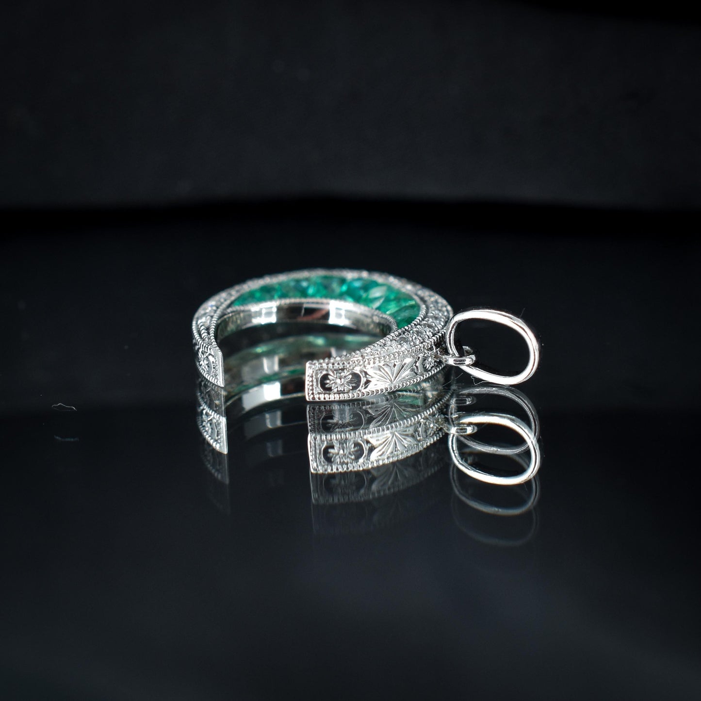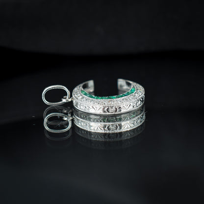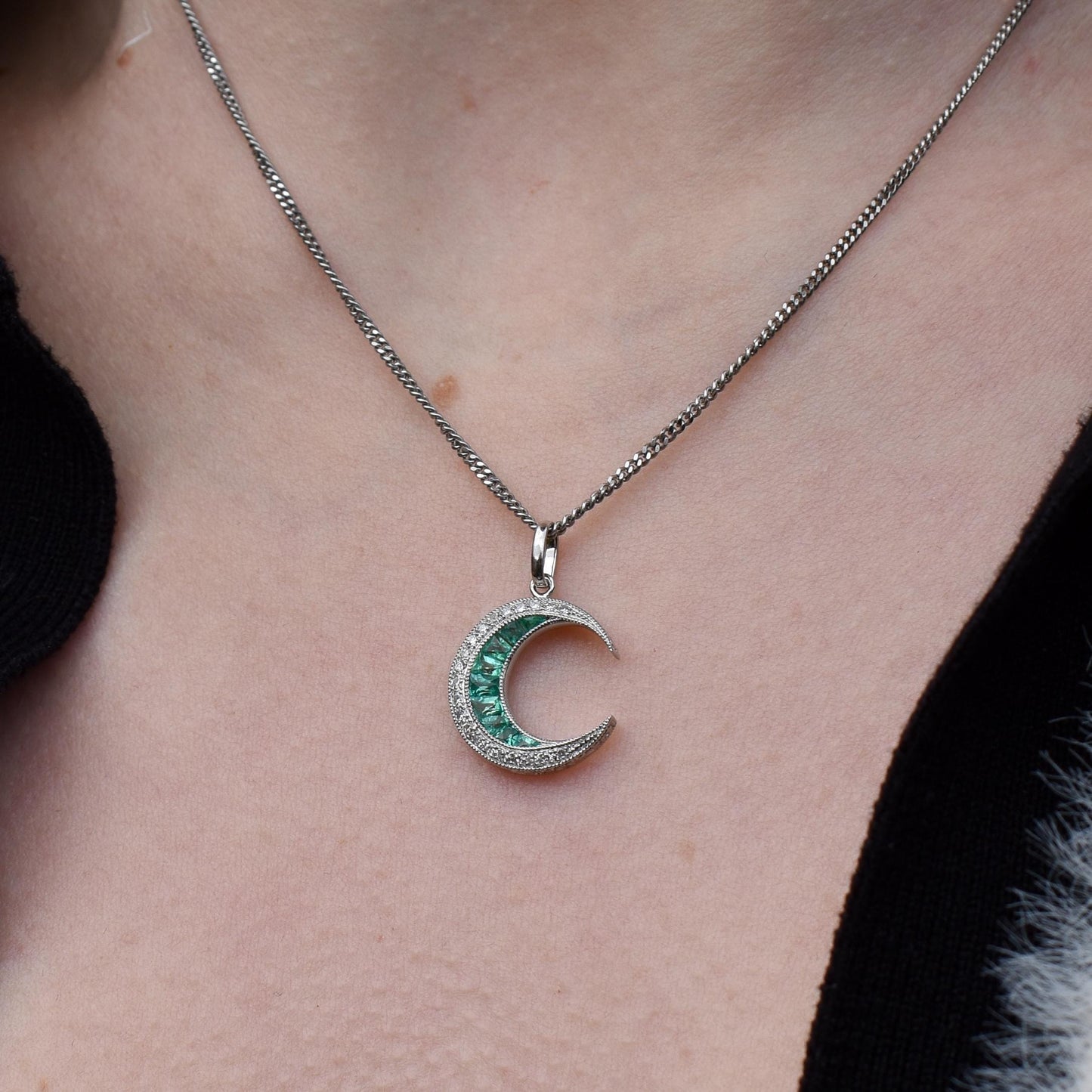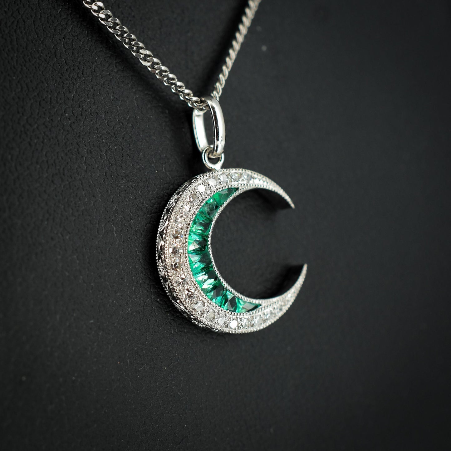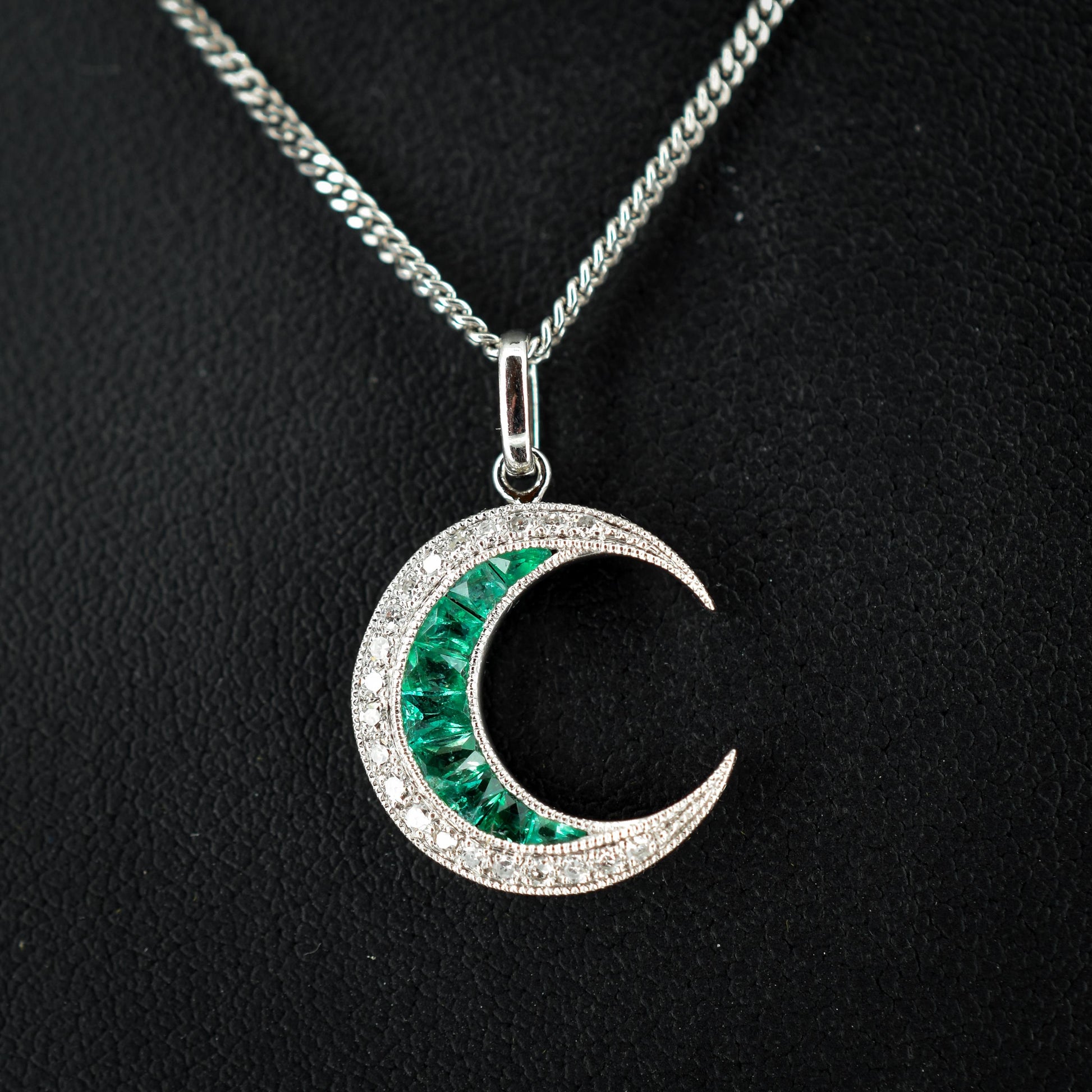 This quality Antique-style Crescent pendant features French Cut Emeralds with Diamonds modelled in beautifully engraved Platinum.
