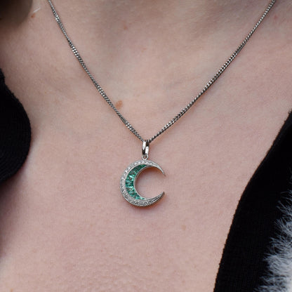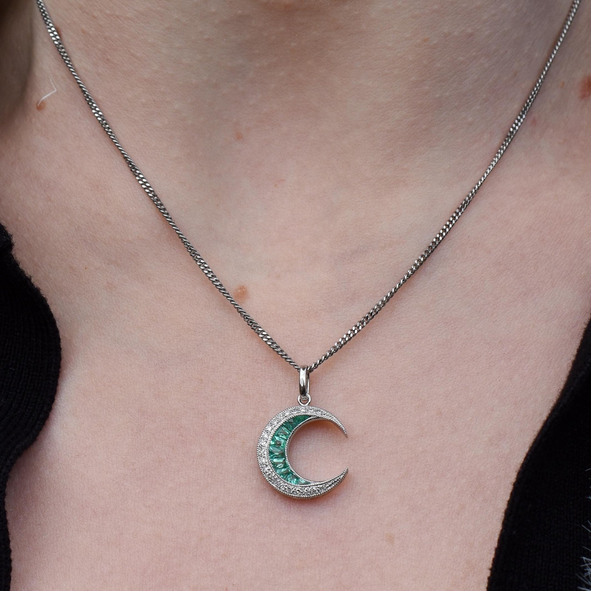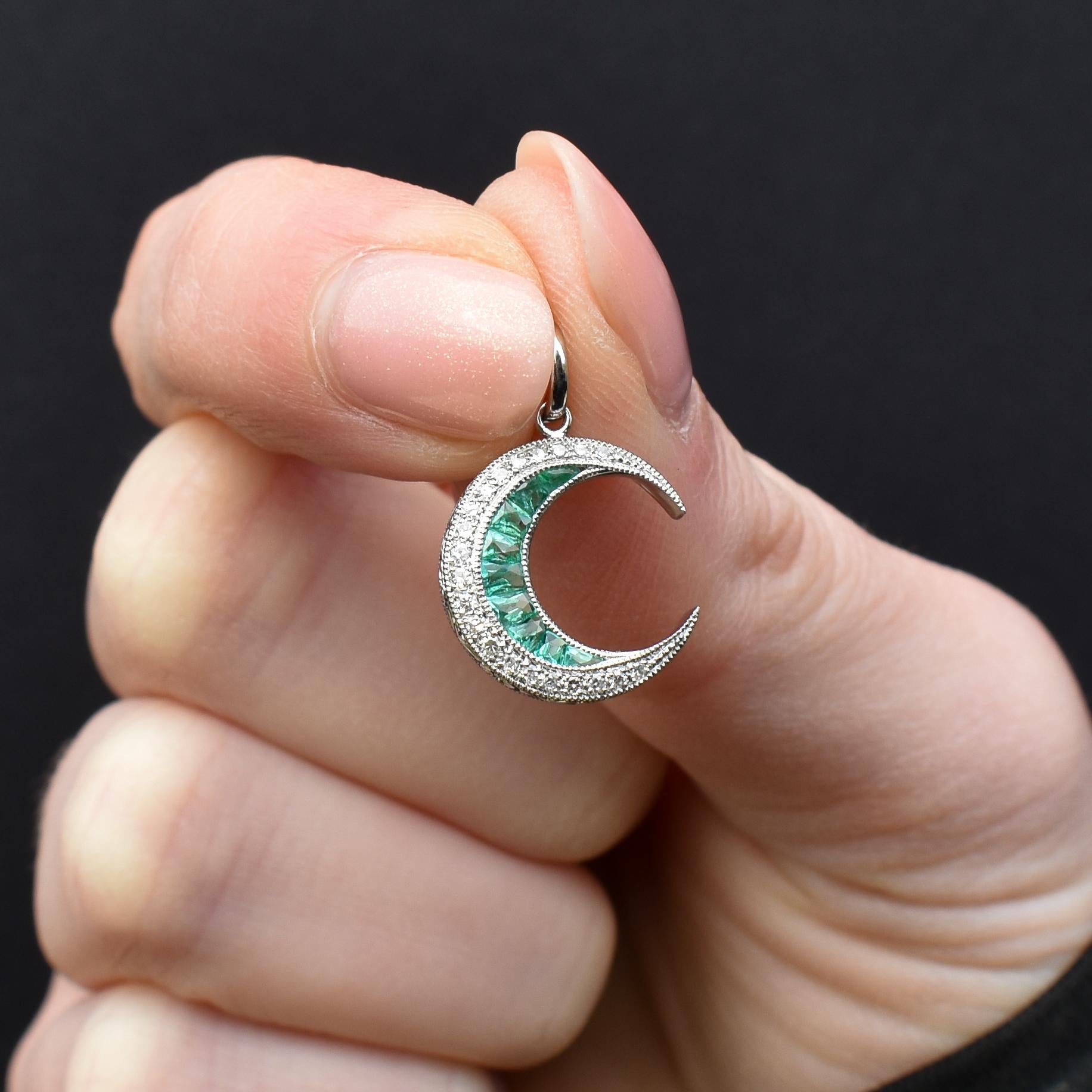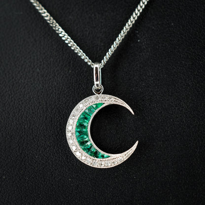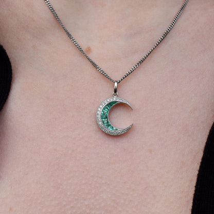 Antique Style Diamond and Emerald Crescent Moon Platinum Pendant