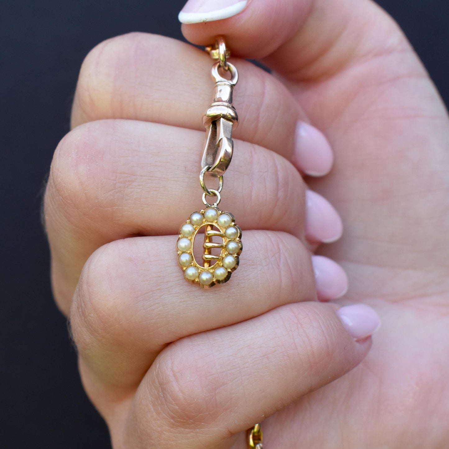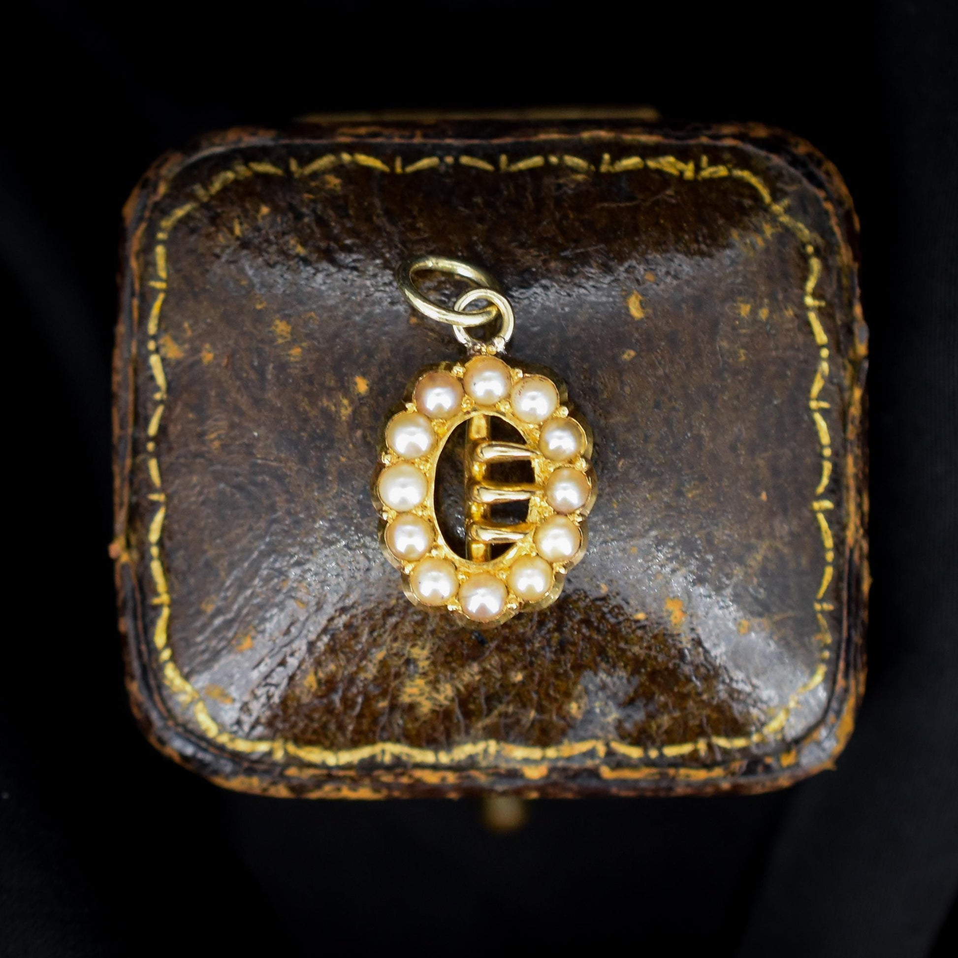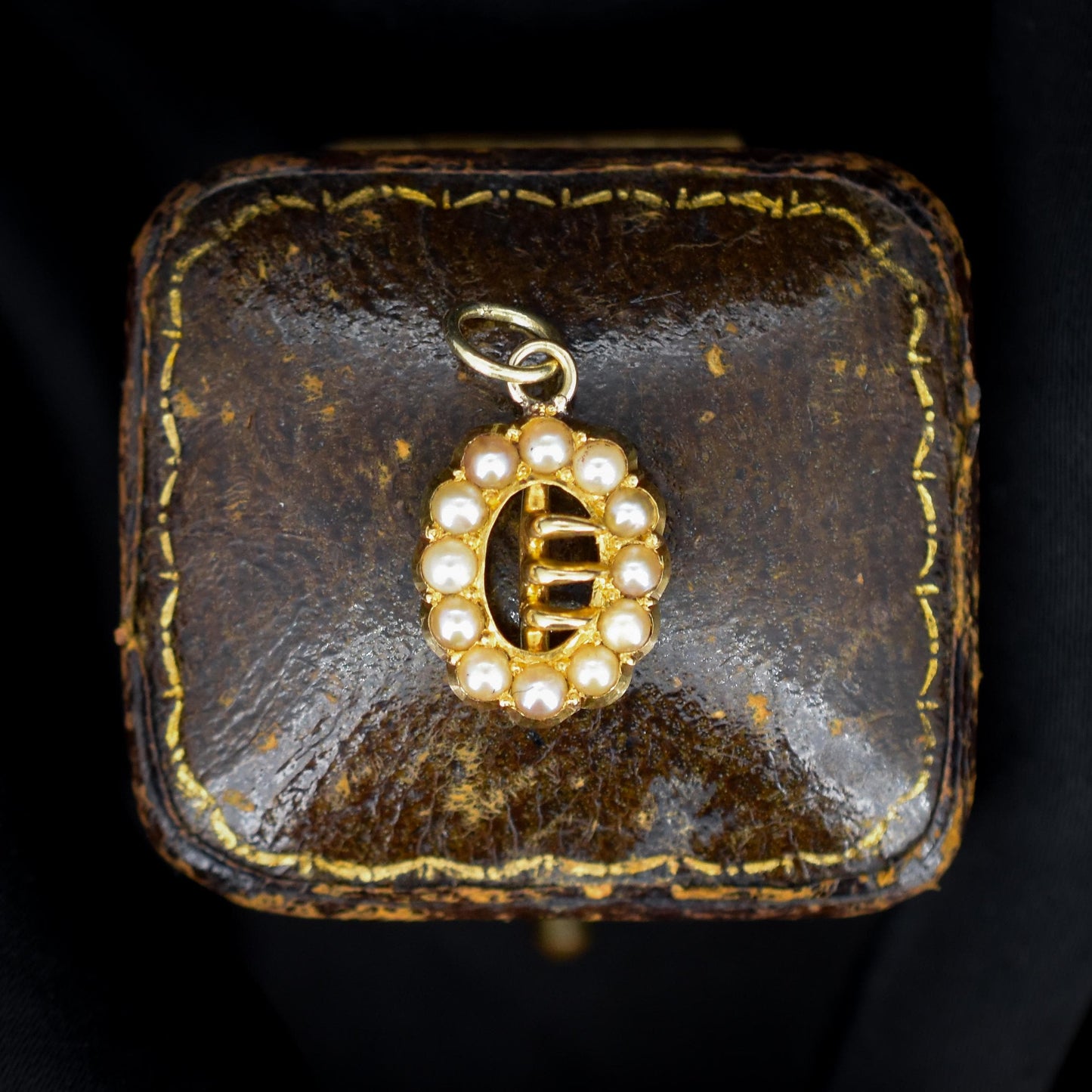 This exquisite antique charm features twelve lustrous pearls delicately arranged around an 18ct gold buckle centrepiece.
