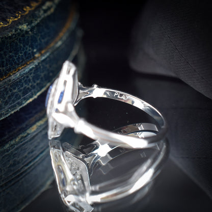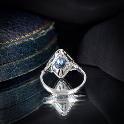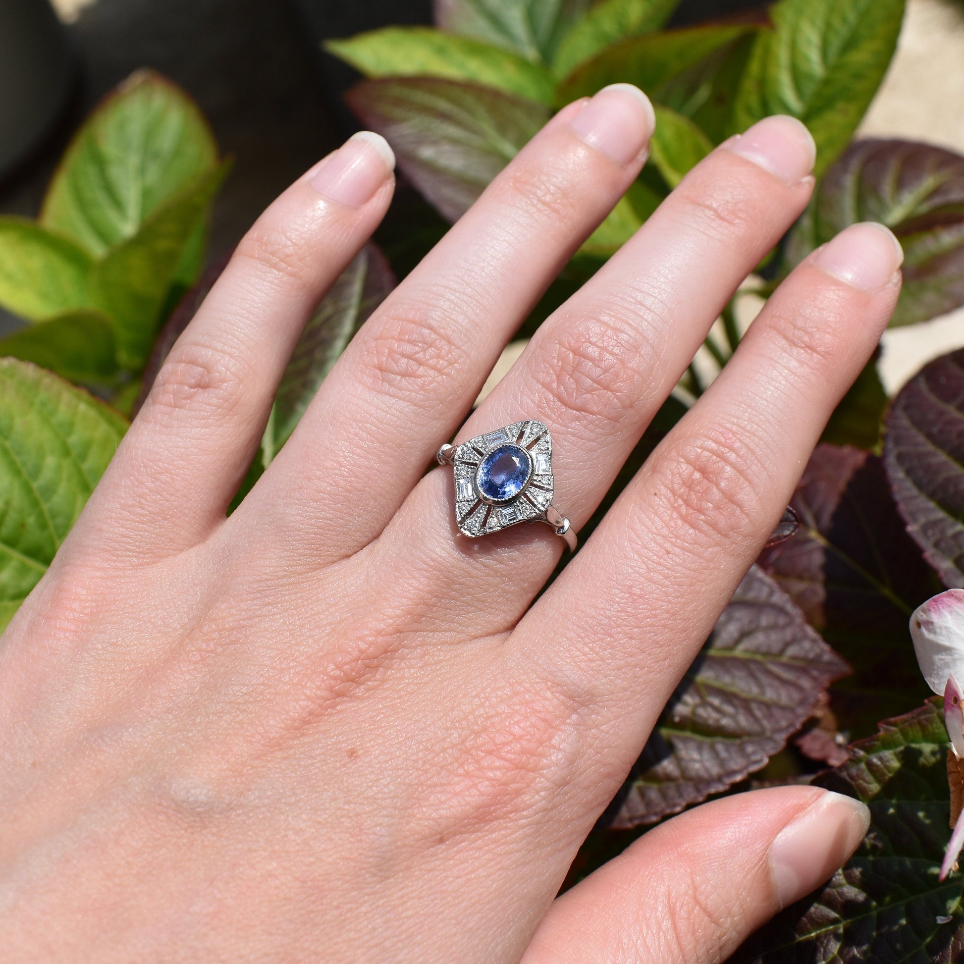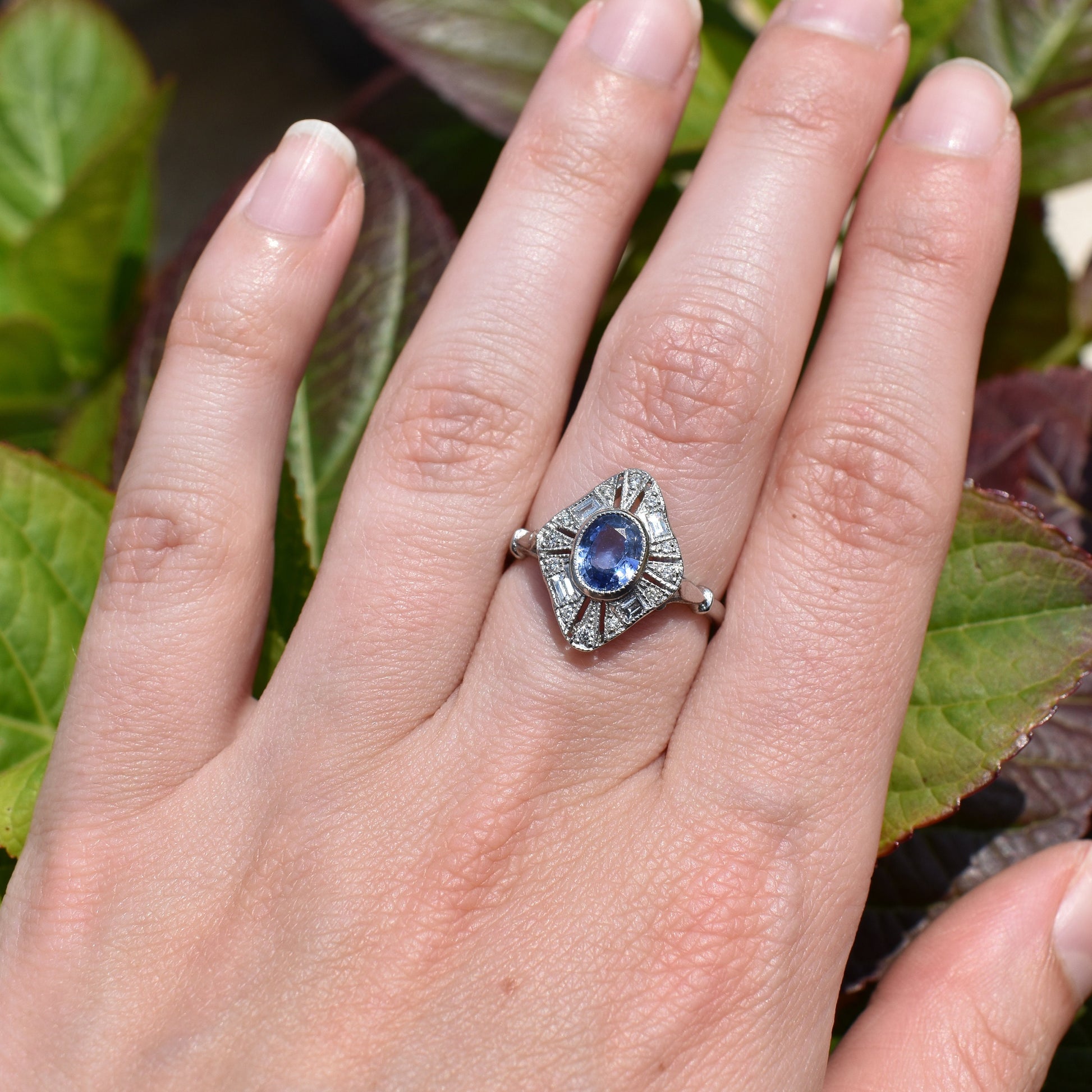 This Deco-style Sapphire and Diamond ring remains in excellent condition. The stones are secure and free from chips. This stunning ring would add a touch of class to any outfit and collection.