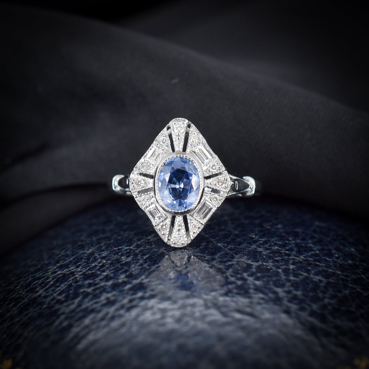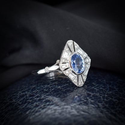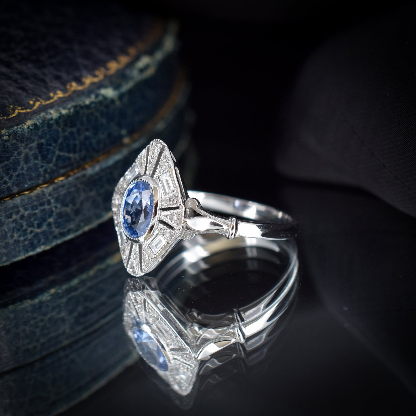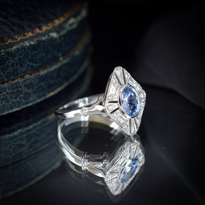 This stunning Art Deco style ring features an Oval vibrant cornflower Blue Sapphire gemstone set within a halo of Diamonds, modelled in Platinum.