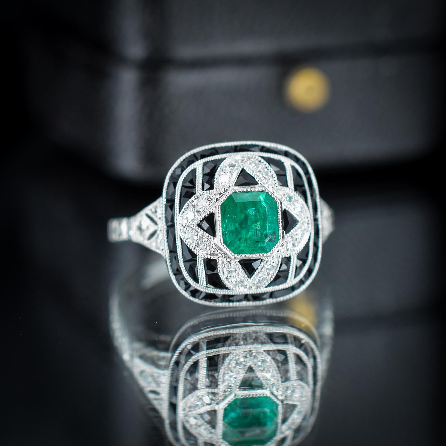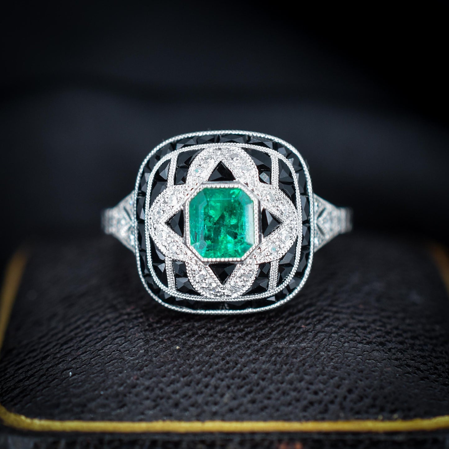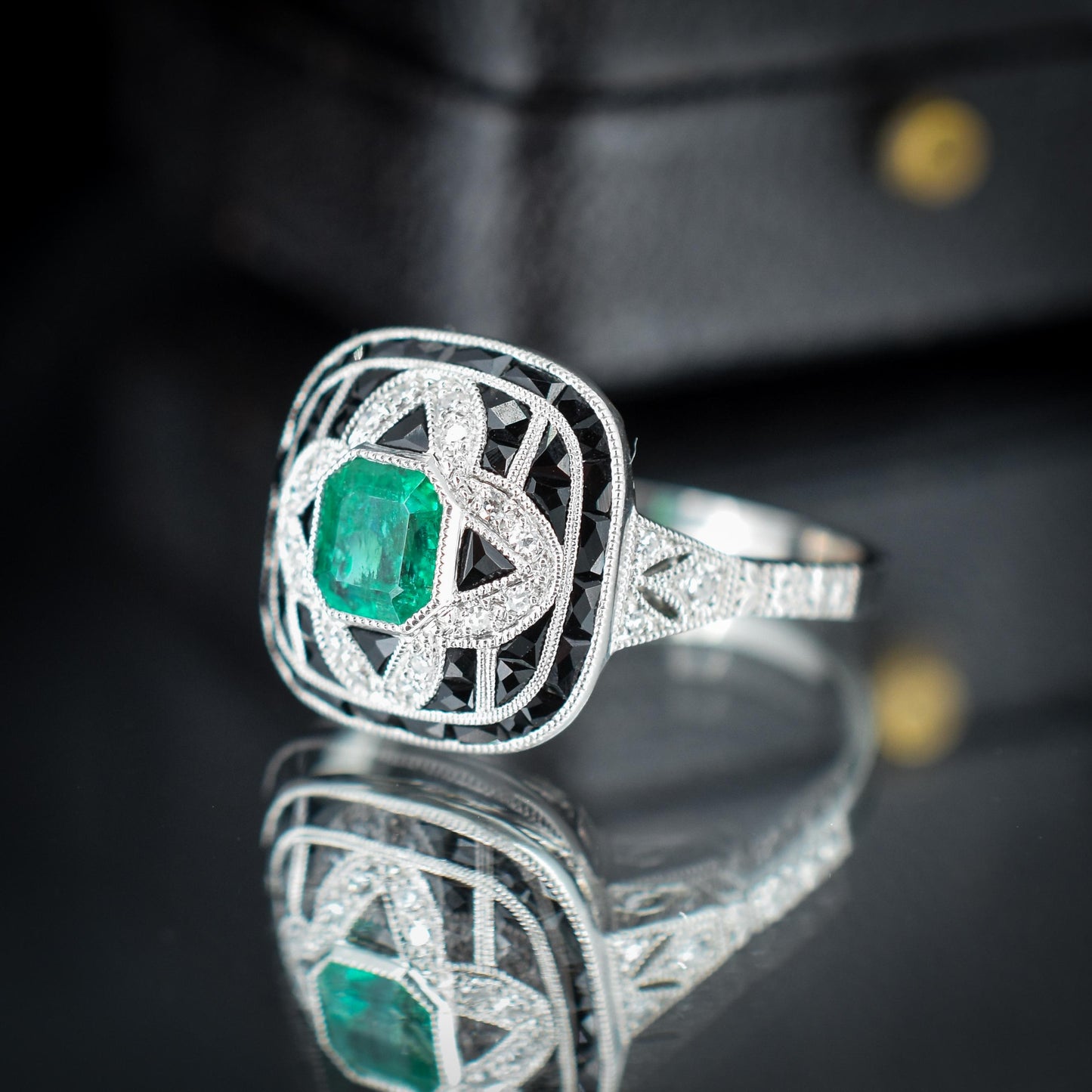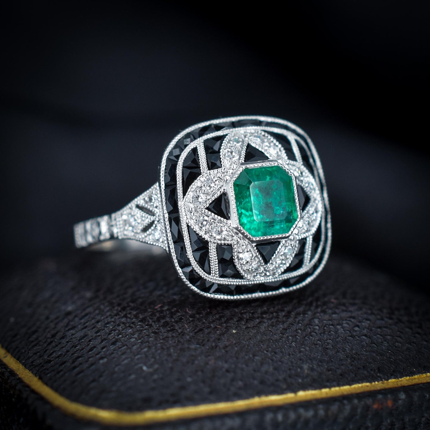 Art Deco Style Natural Emerald Diamond and Onyx Platinum Cocktail Ring