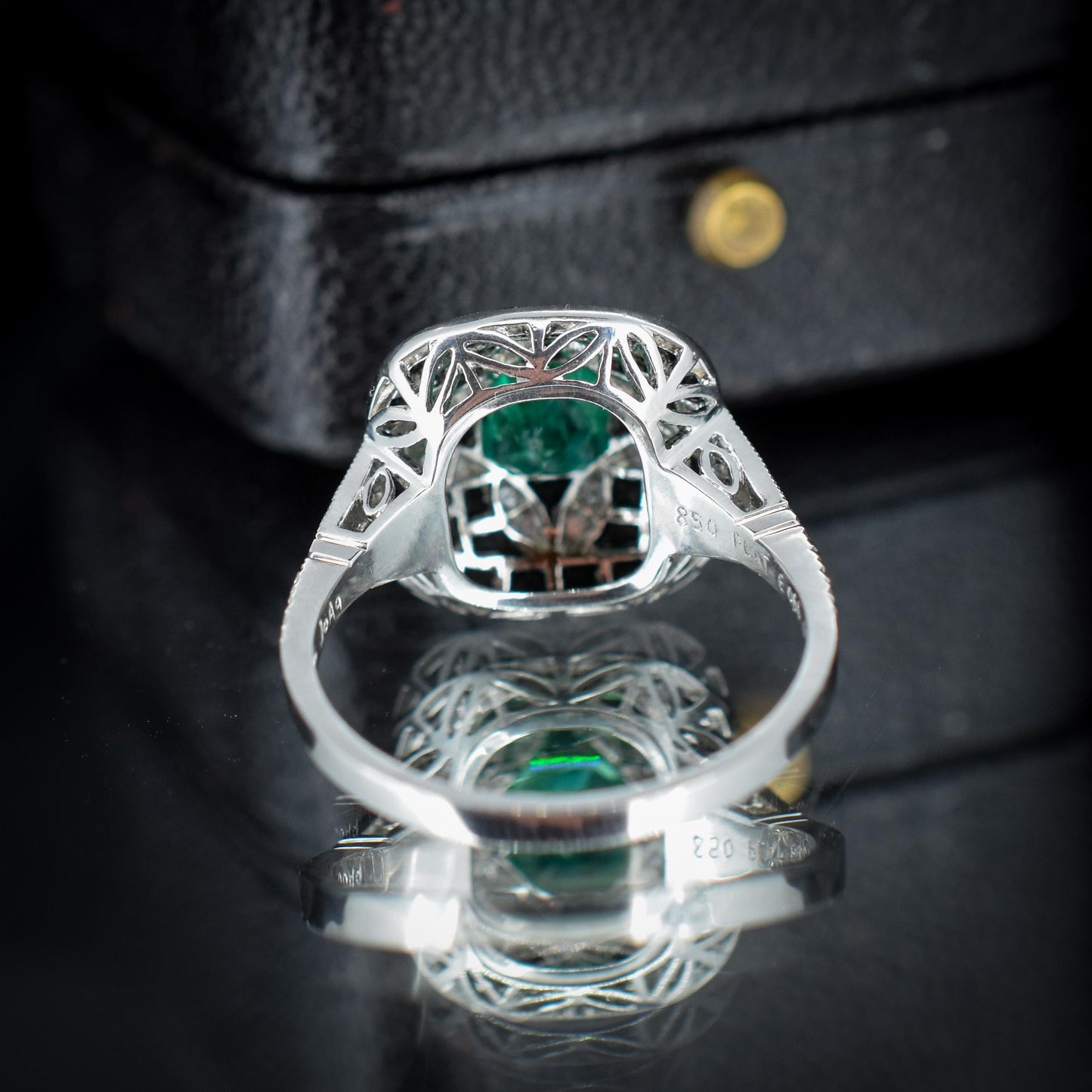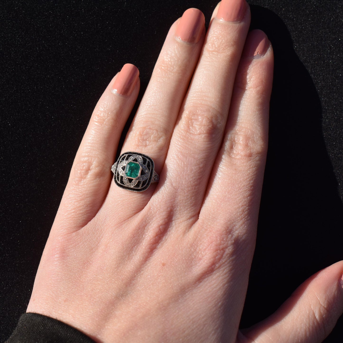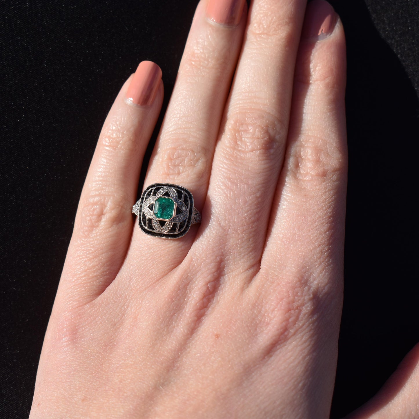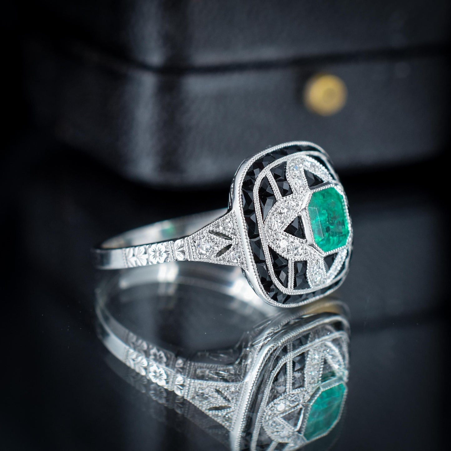 Art Deco Style Natural Emerald Diamond and Onyx Platinum Cocktail Ring