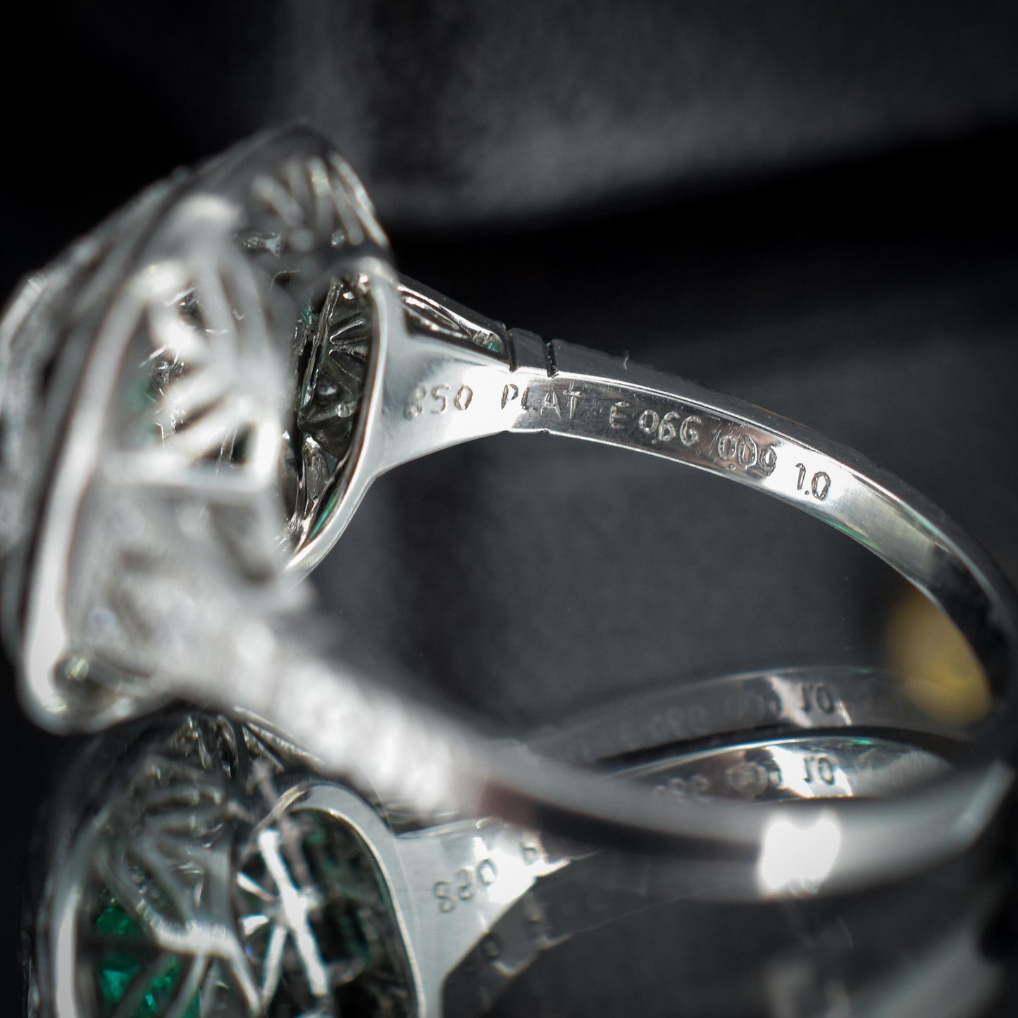 This memorising Art Deco-style cocktail ring features a central step-cut Colombian Emerald weighing 0.66 carat. Multiple borders of 1.0 carat of French-cut onyx stones encircle the centre emerald. The ring is complemented with natural diamonds in the centre and shoulders, totalling 0.09 carats, all set in platinum.