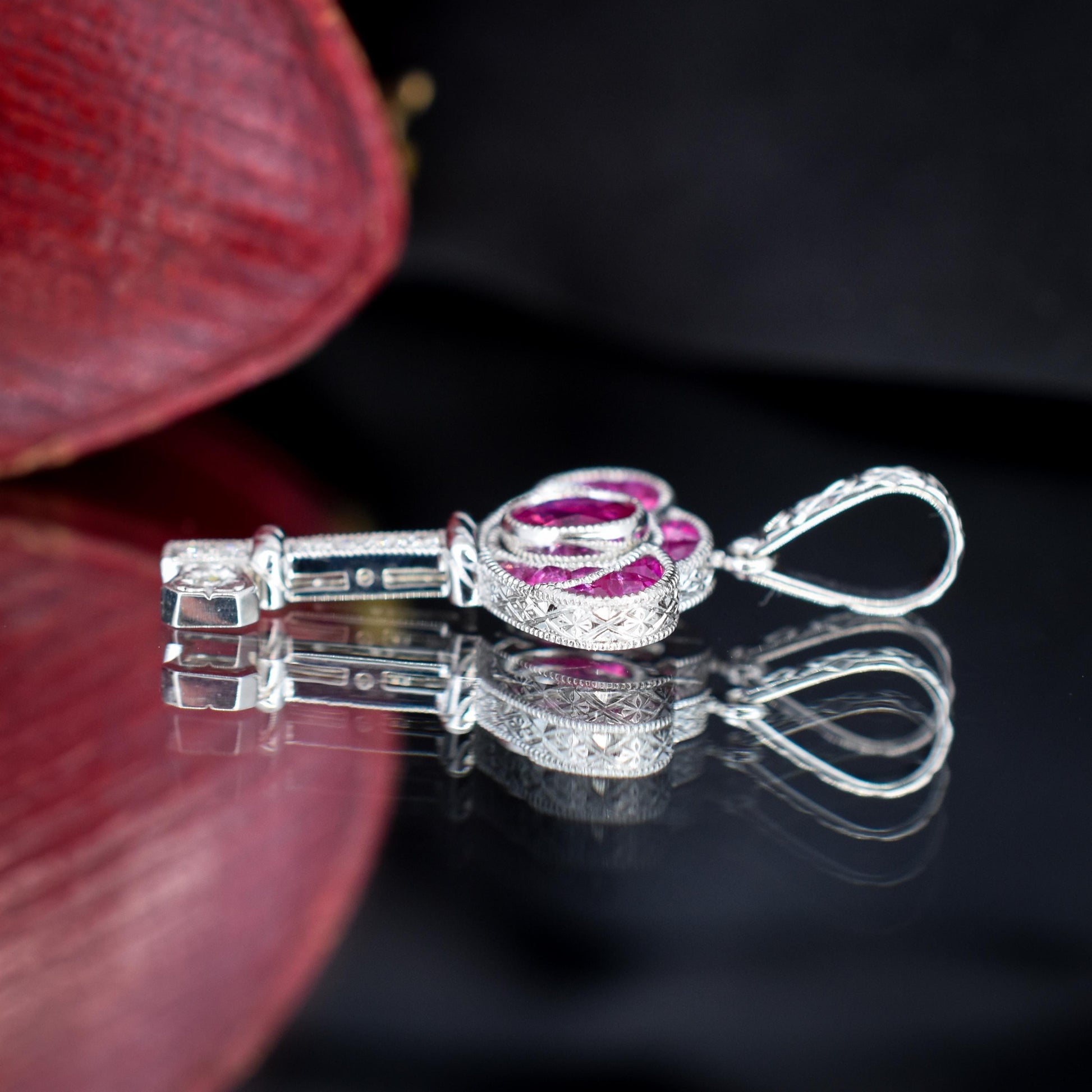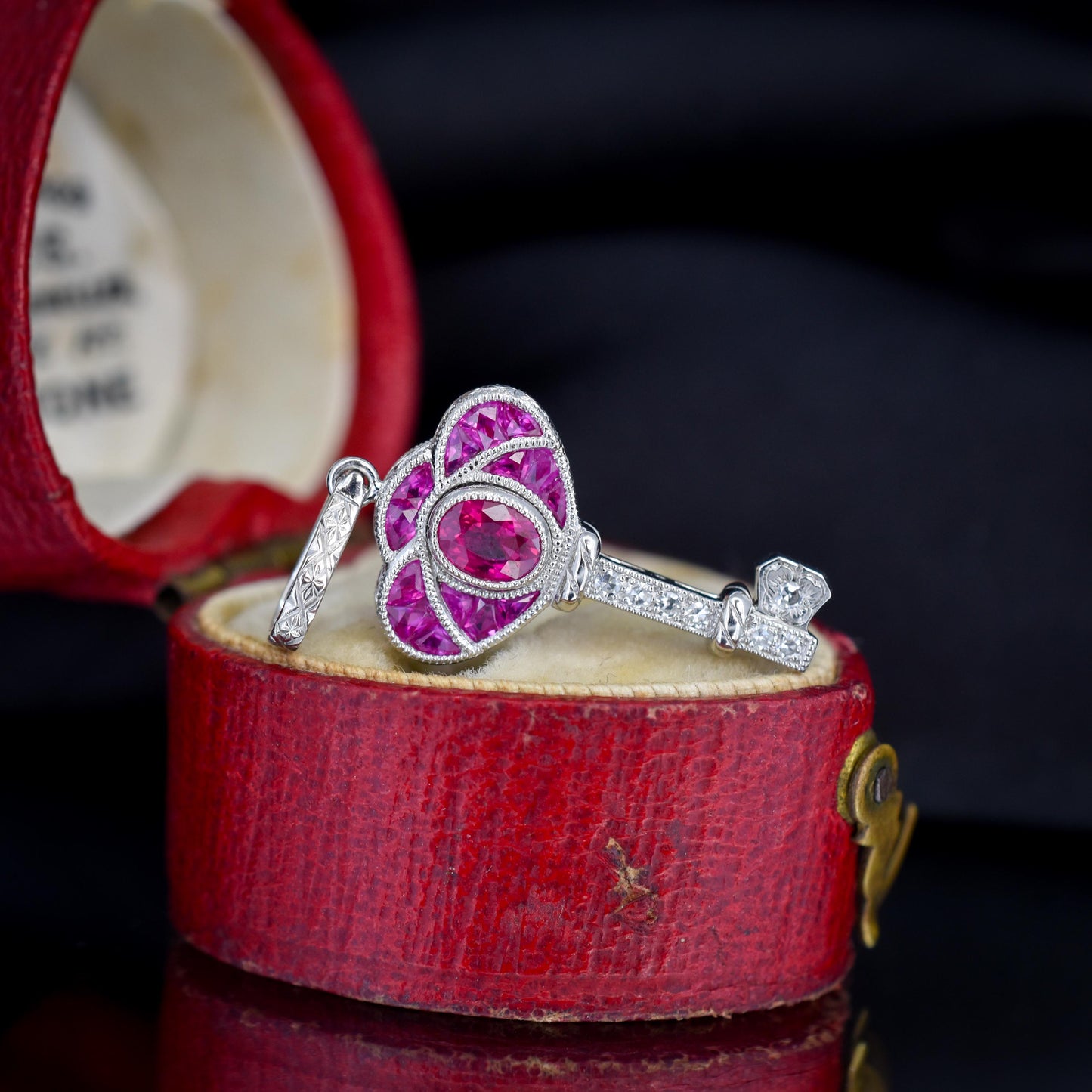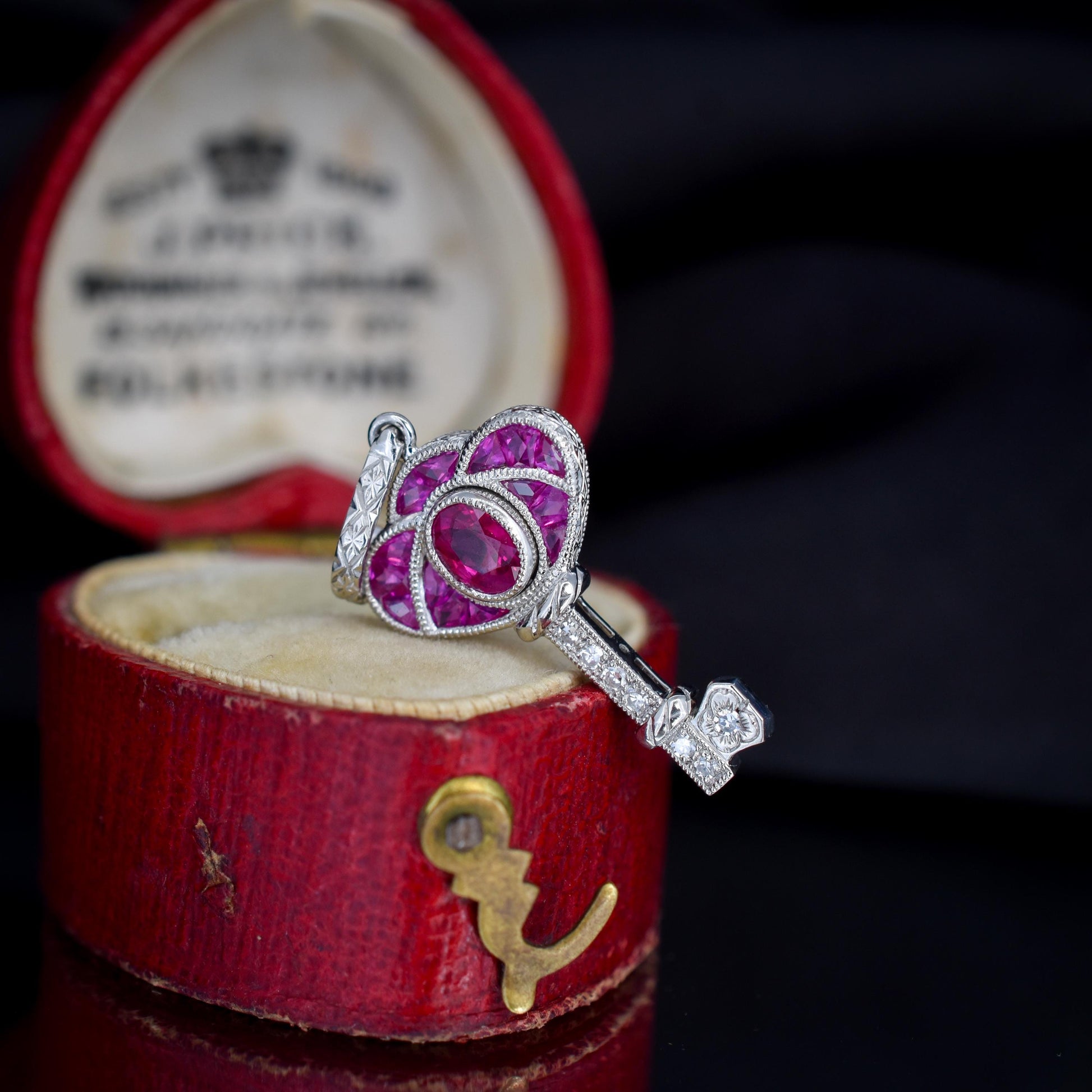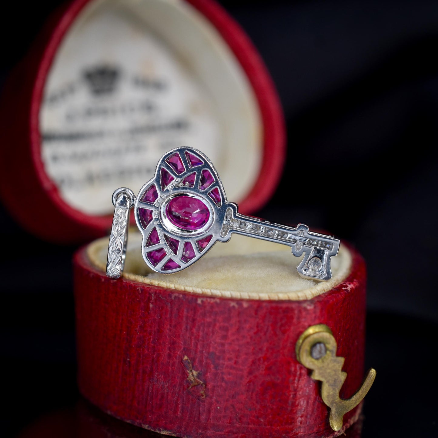 The key itself is intricately detailed, showcasing geometric patterns and bold lines characteristic of the Art Deco era, which adds to its vintage allure. Sparkling round diamonds are delicately set along the blade, accentuating the vibrant Rubies and creating a striking contrast that captures the eye from every angle.