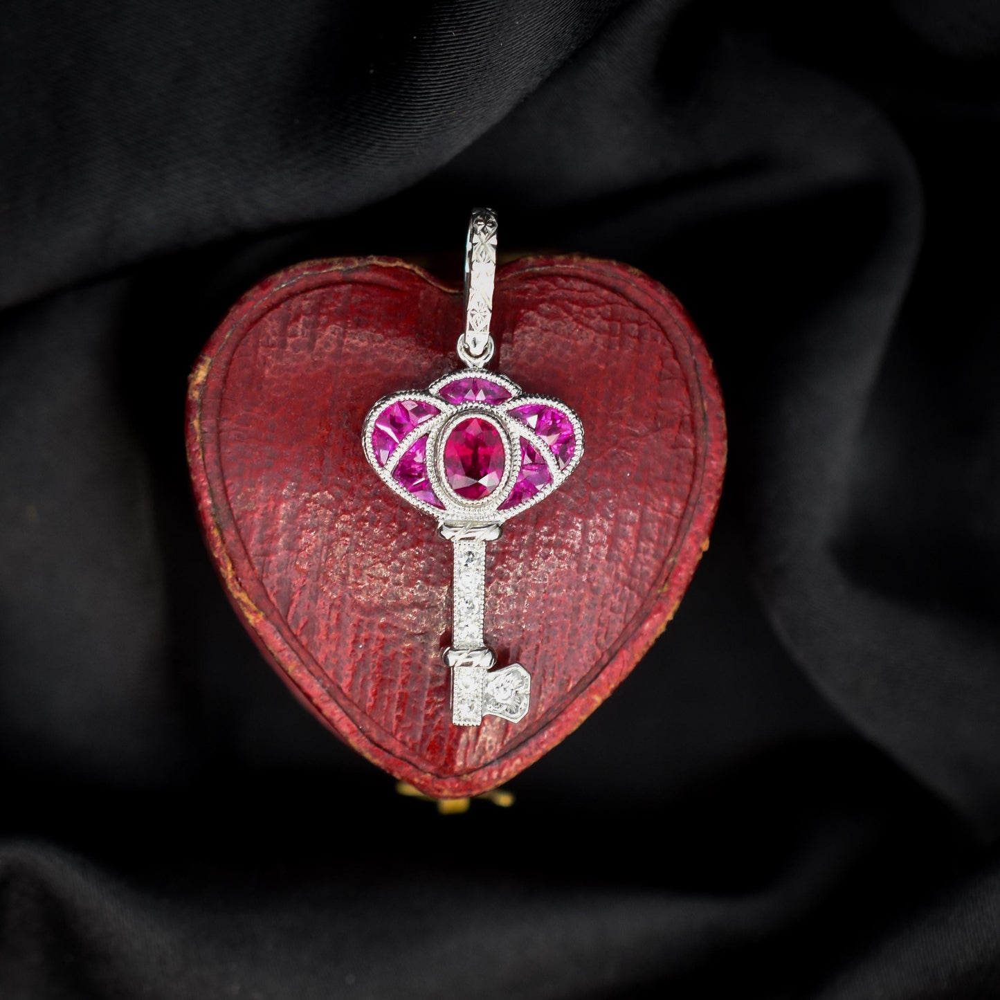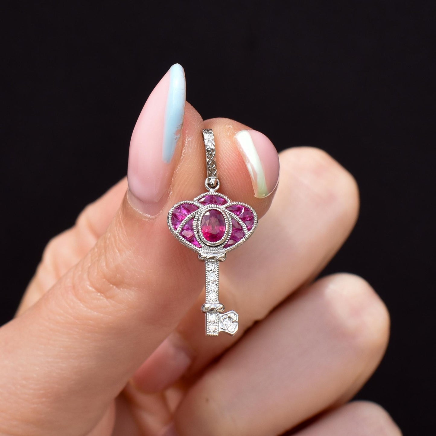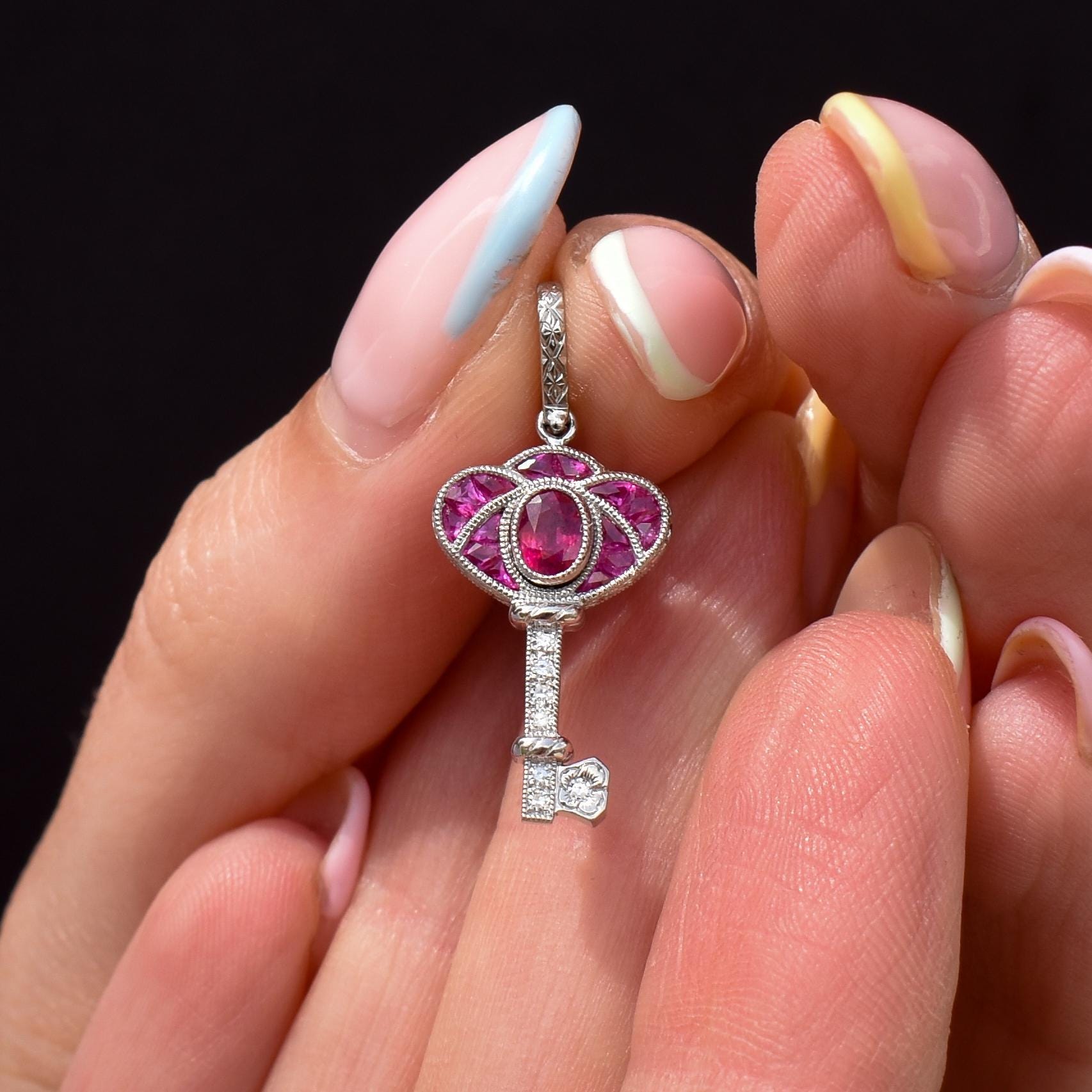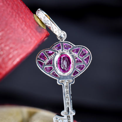 This exquisite Art Deco-inspired key charm is a stunning piece of jewellery, expertly crafted in lustrous platinum. The design features a captivating blend of Ruby and diamonds, with 0.60-carat Rubies are set on the bow of the key, radiating a vibrant and light pinkish hue, that evokes elegance and sophistication.