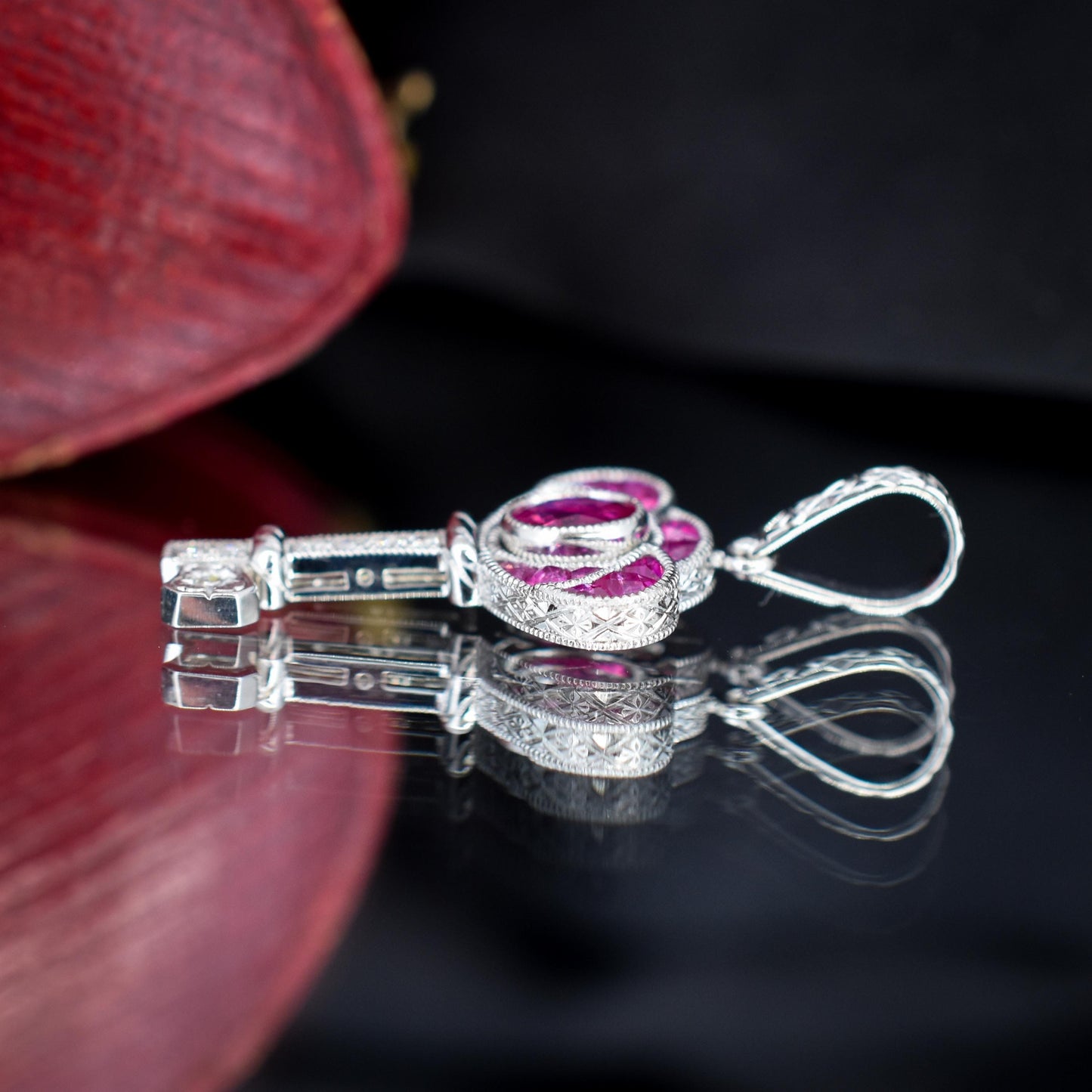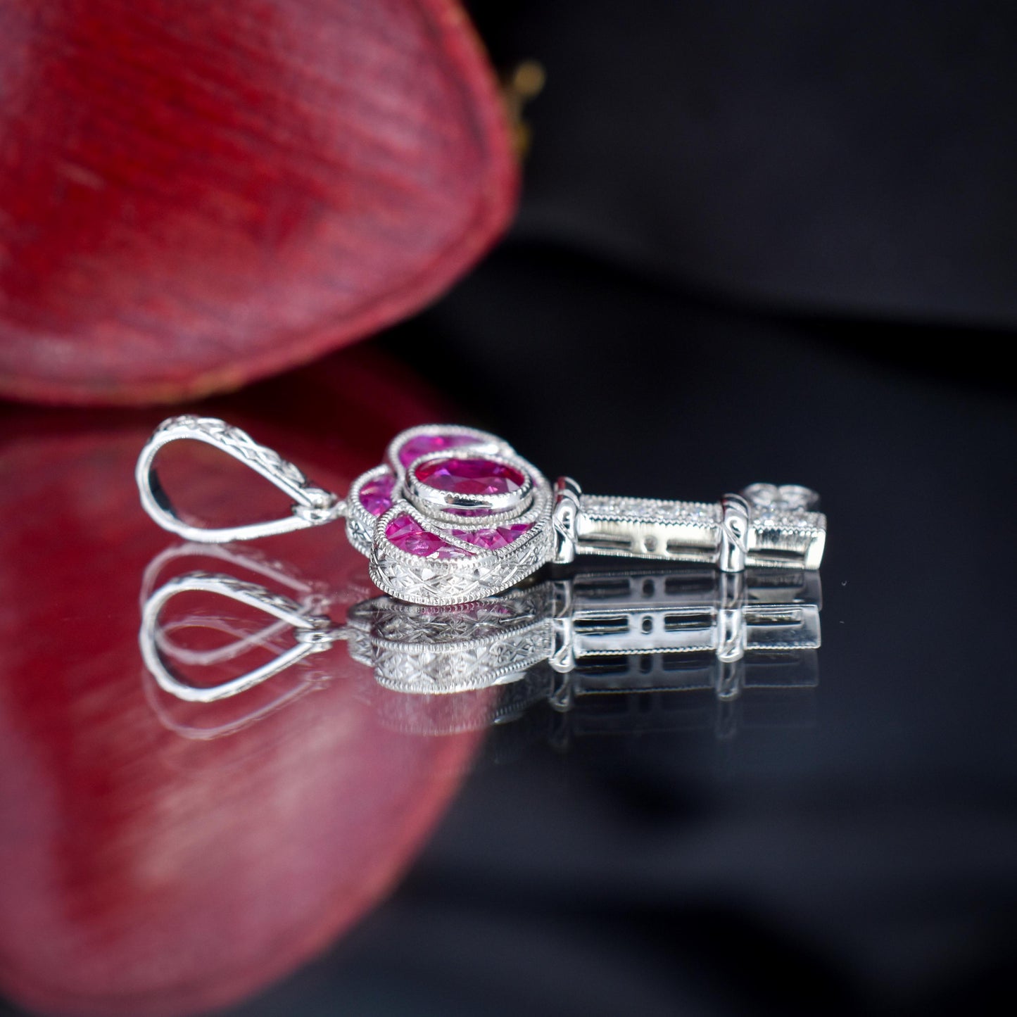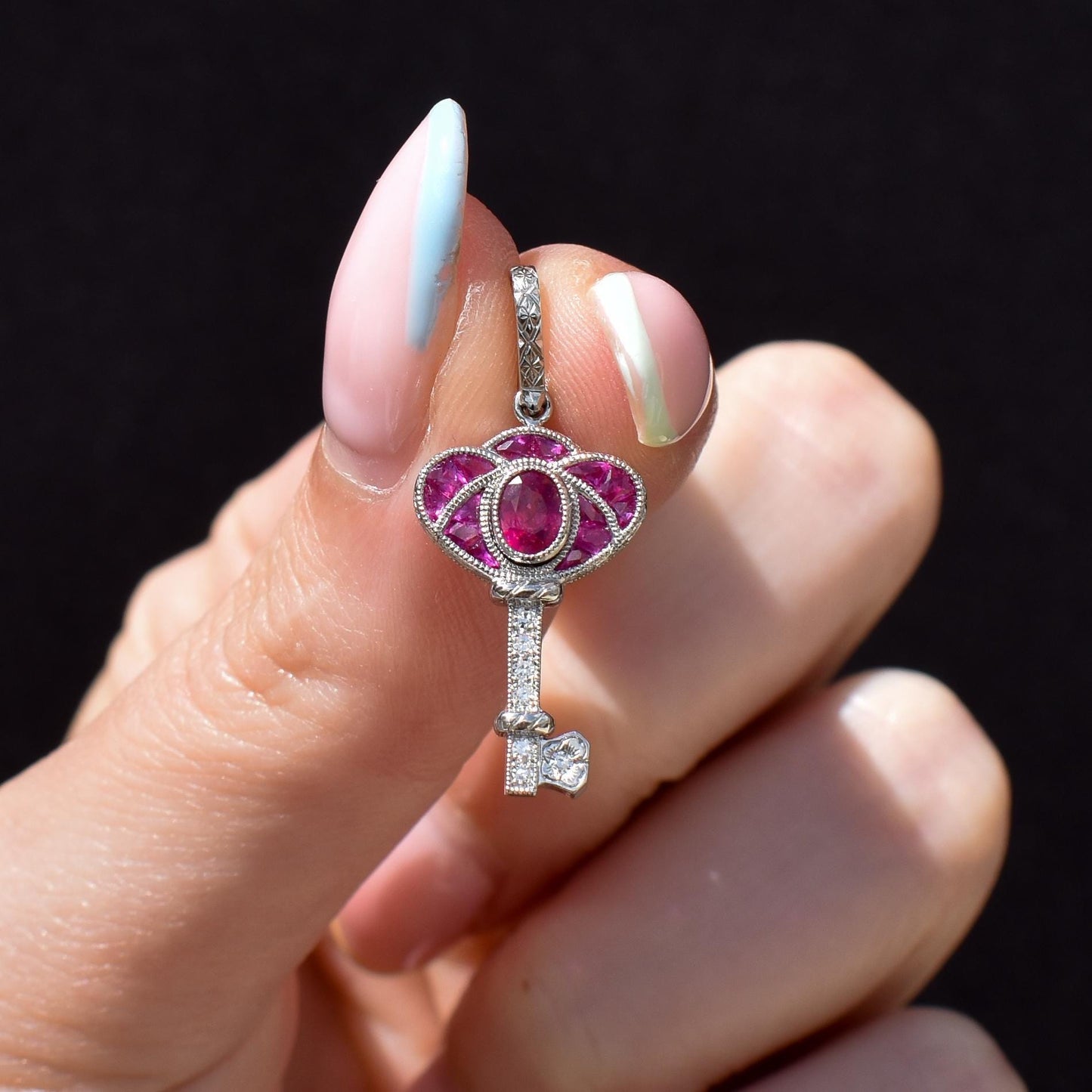 This exquisite Art Deco-inspired key charm is a stunning piece of jewellery, expertly crafted in lustrous platinum. The design features a captivating blend of Ruby and diamonds, with 0.60-carat Rubies are set on the bow of the key, radiating a vibrant and light pinkish hue, that evokes elegance and sophistication.