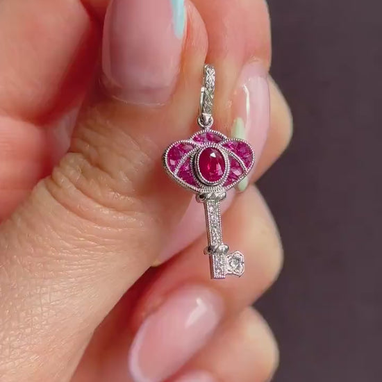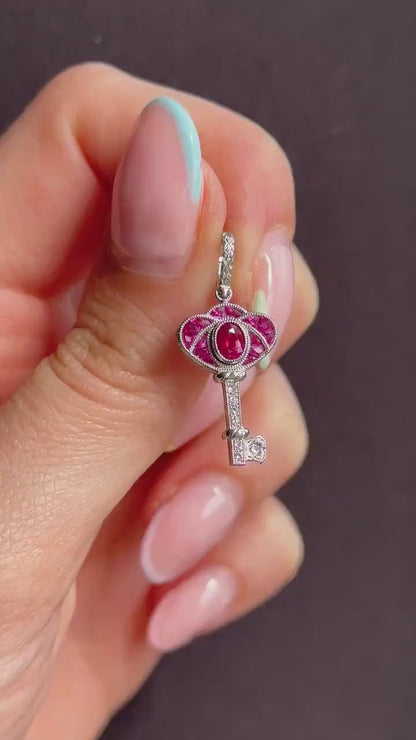 Art Deco Style Ruby and Diamond Platinum Key Charm Pendant